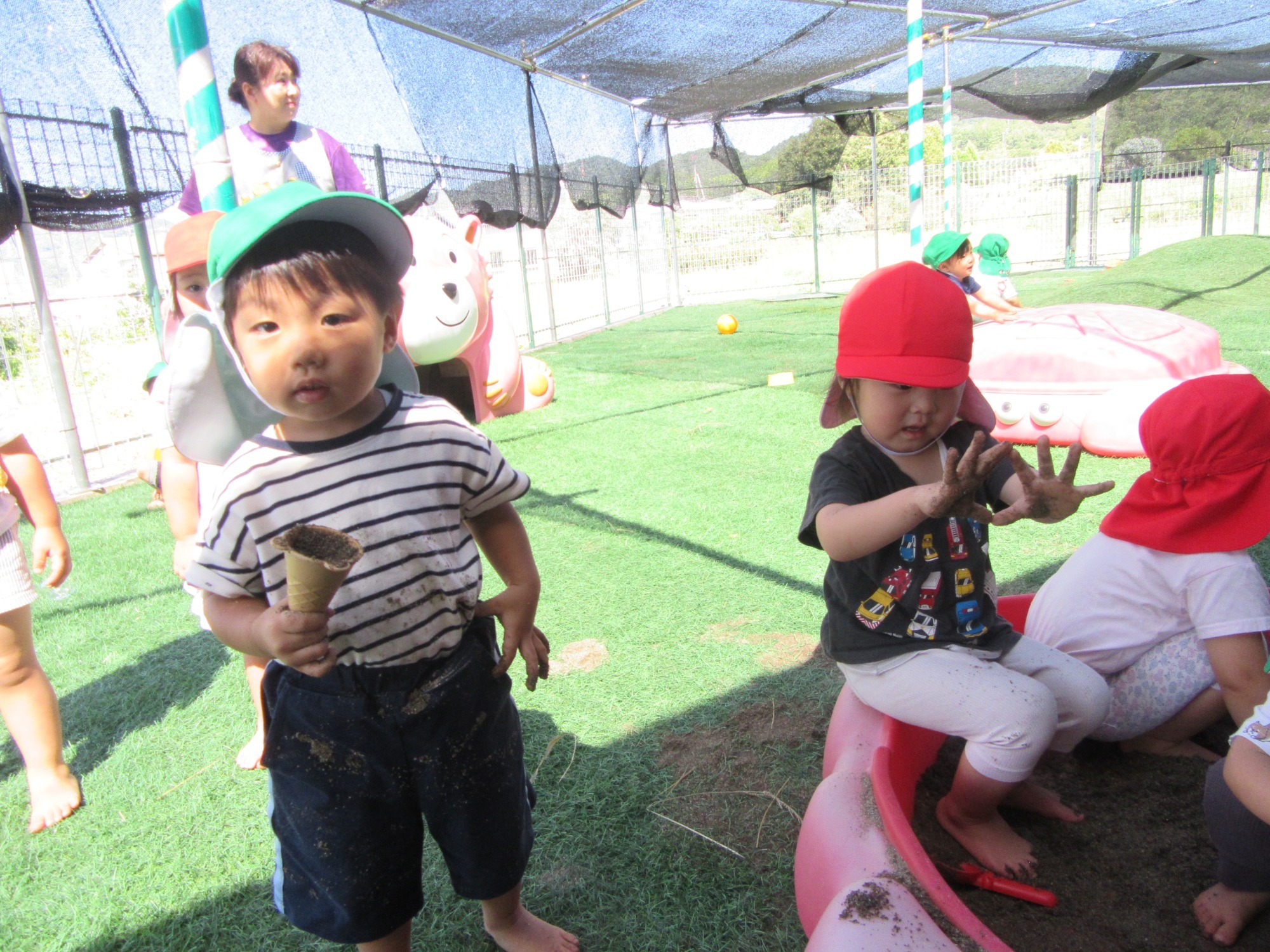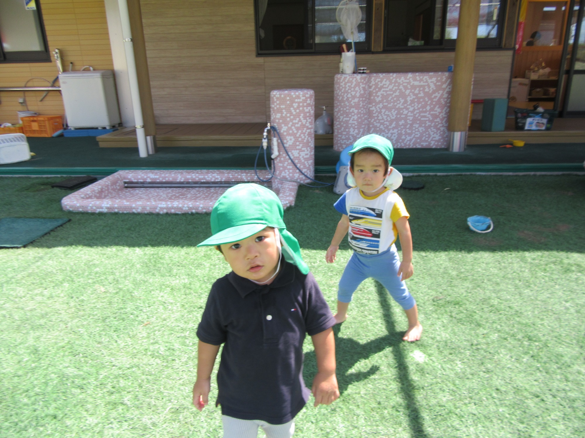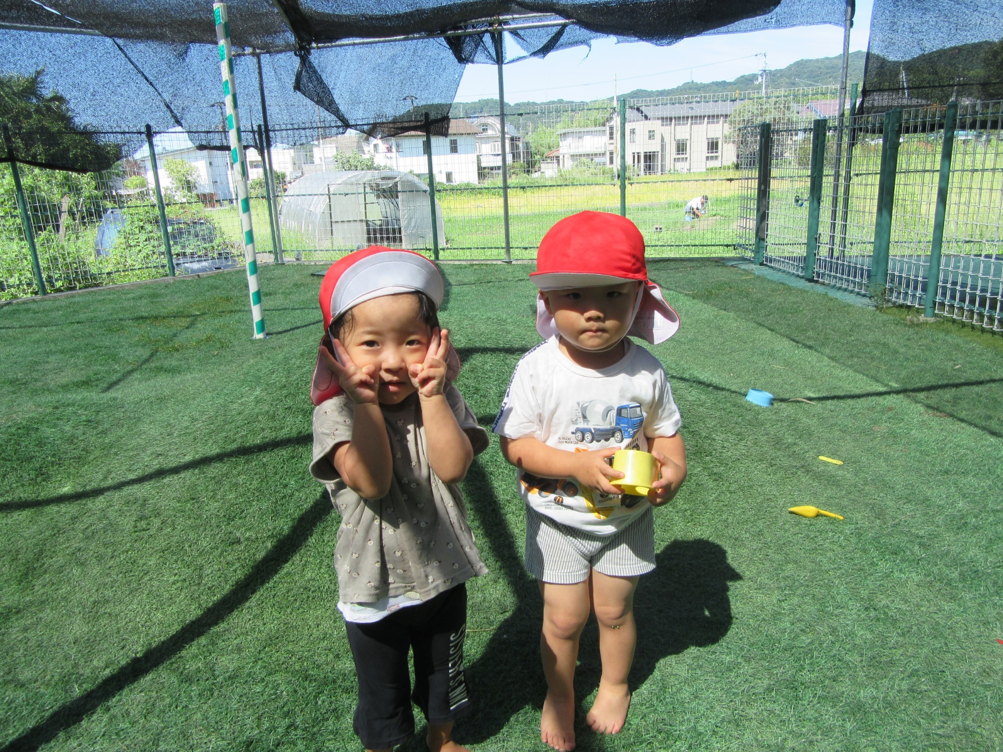 今日も元気に外遊び!とても楽しそうです。だけど、熱中症には気をつけて水分補給はしっかりとしていきたいですね。