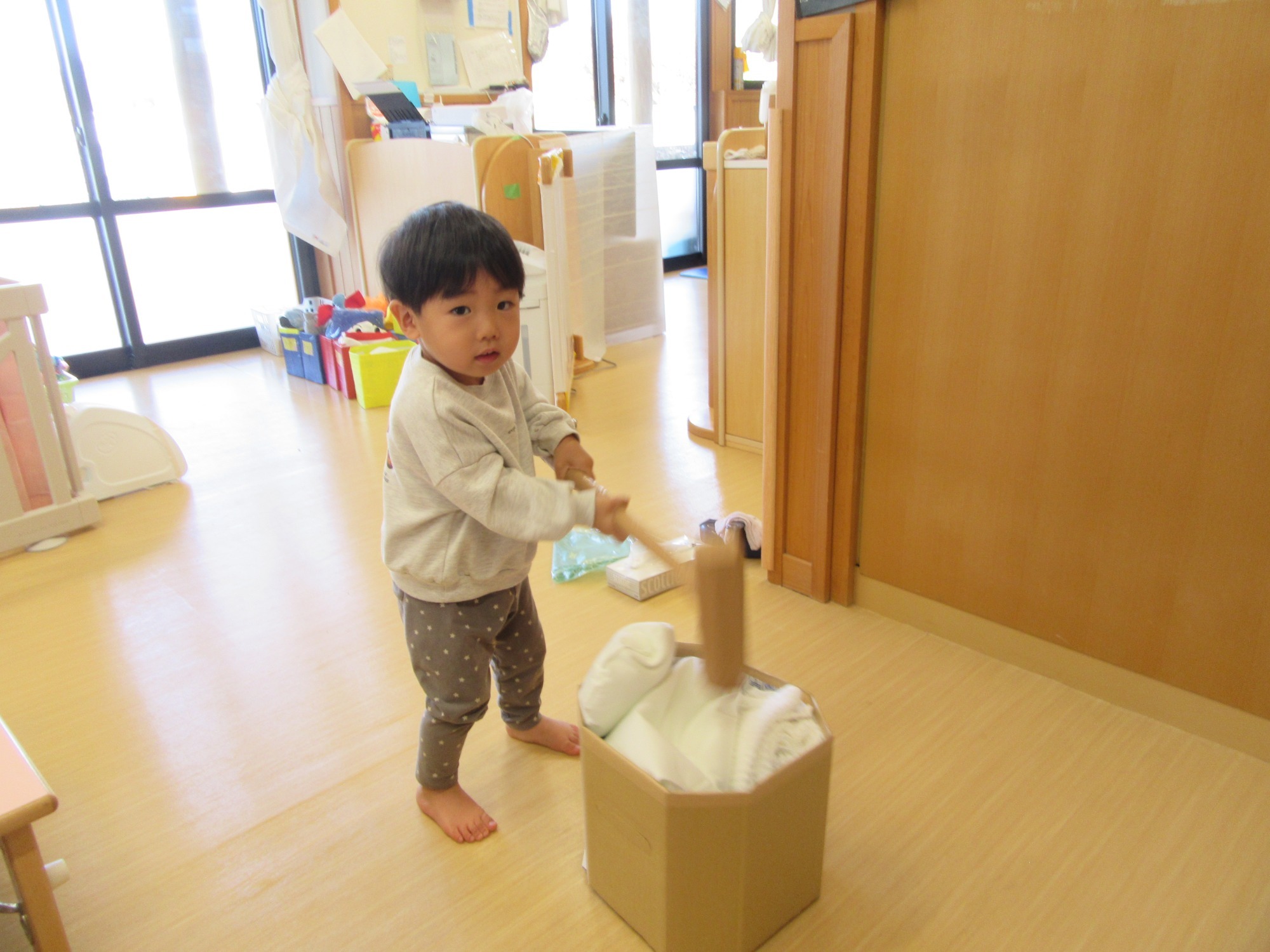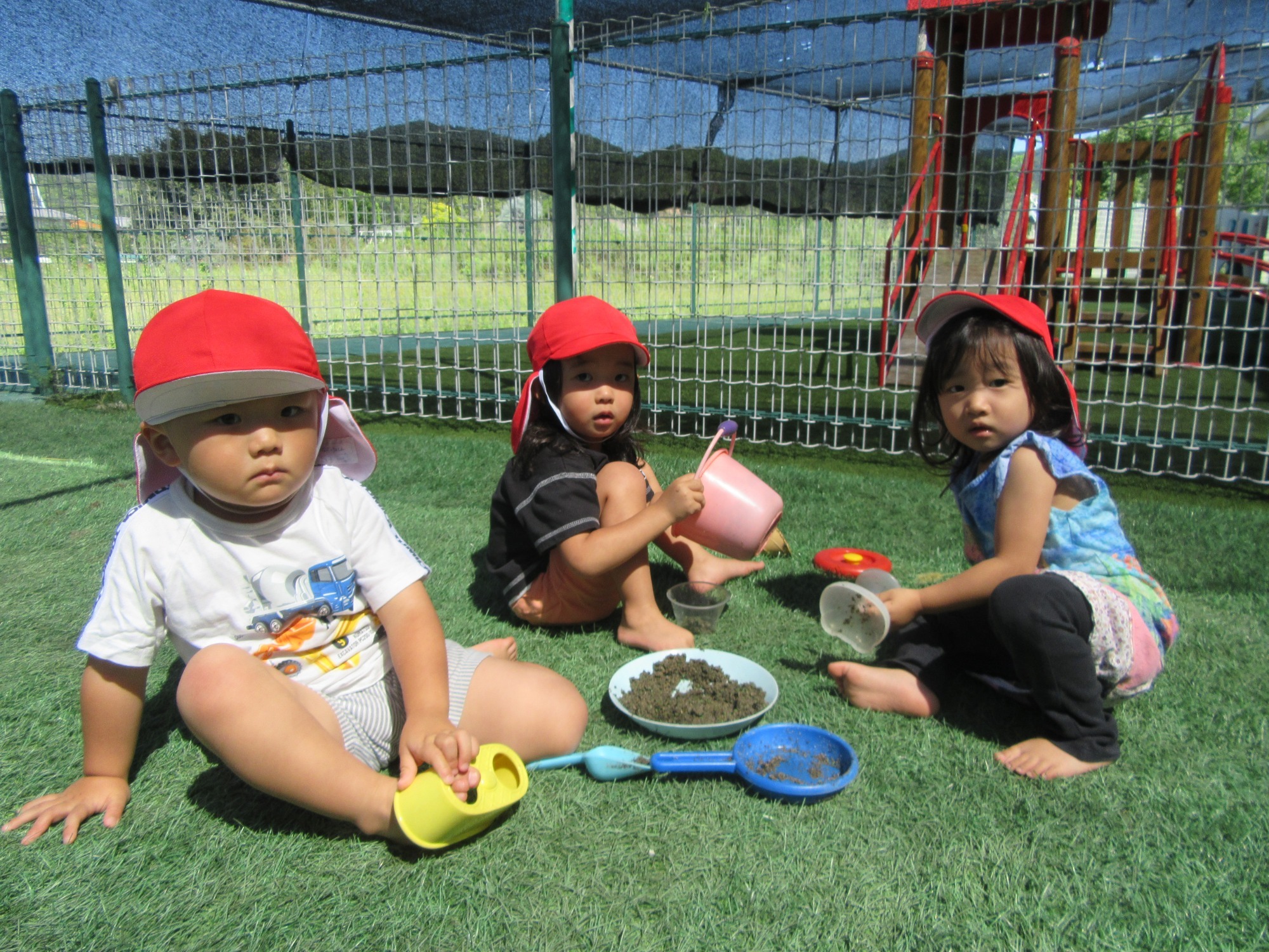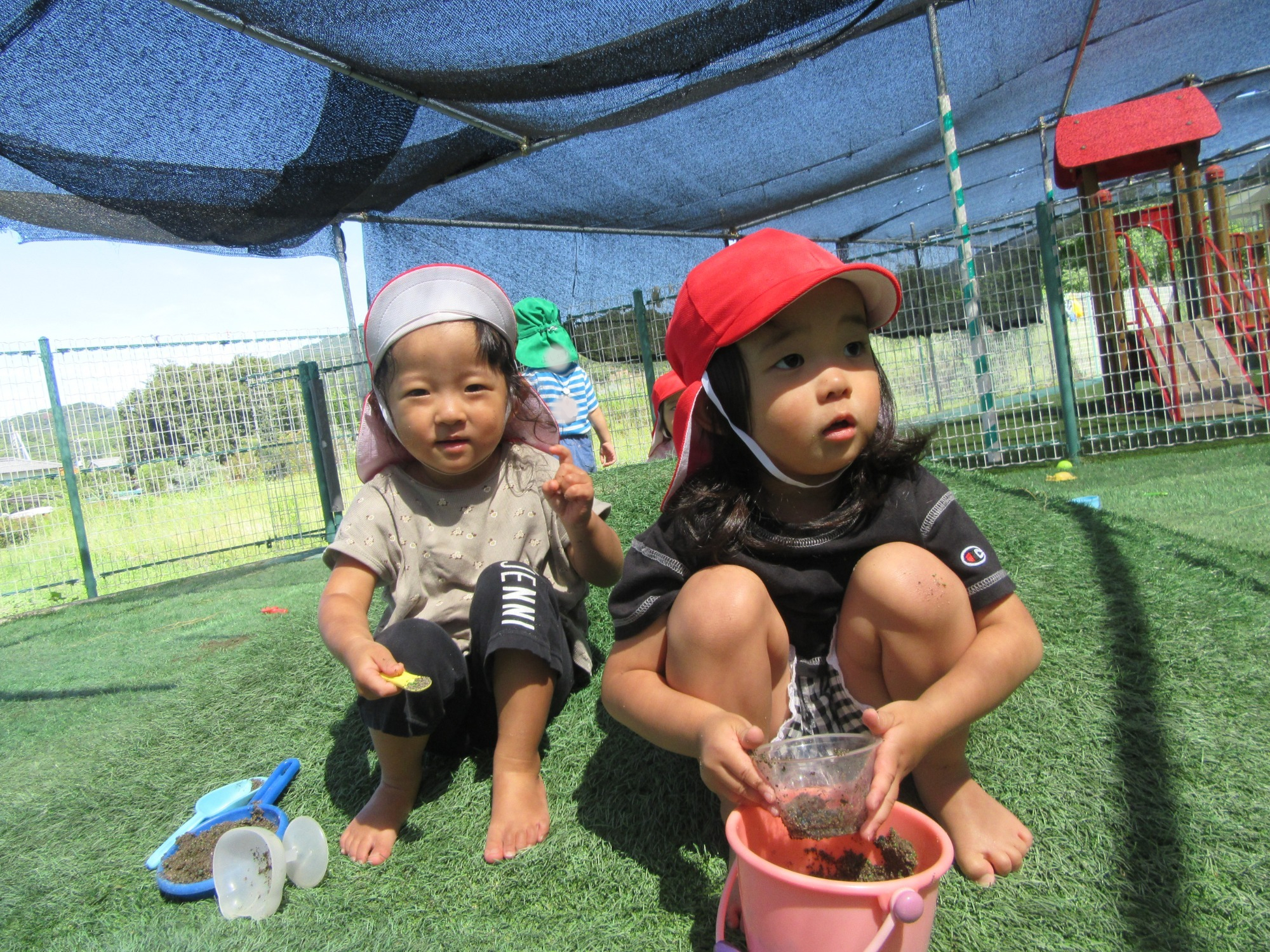 こあら・らっこ組さんが中庭で遊んでいます♪らっこ組さんは遊びの幅も増え、お友達とごっこ遊びをするようになっています。今日はお料理を作っていました♪写真を撮るときのポーズも上手になりましたね♡かわいいです♡