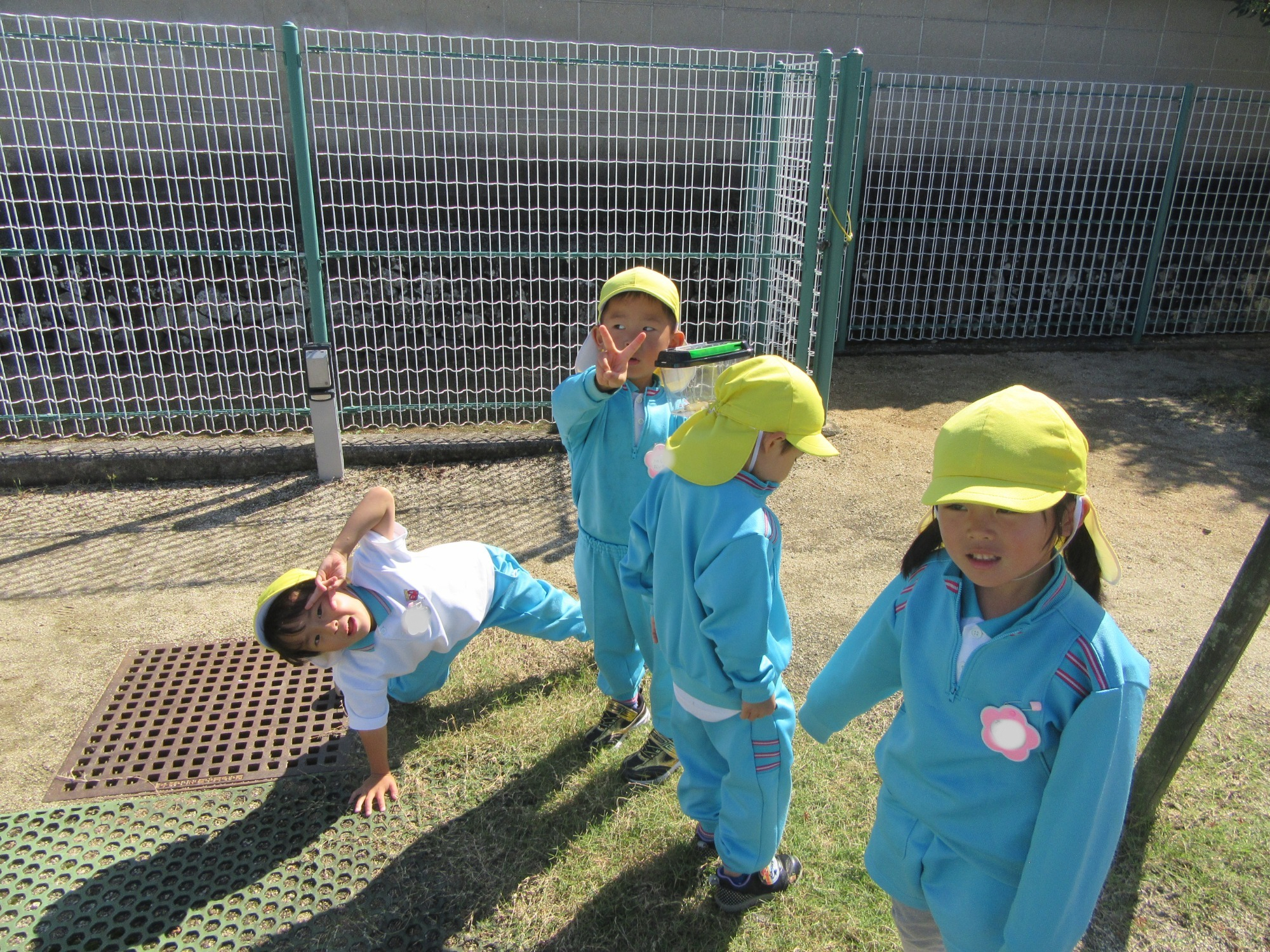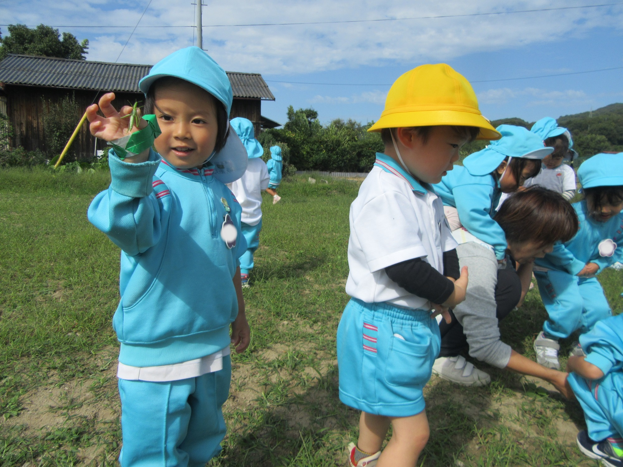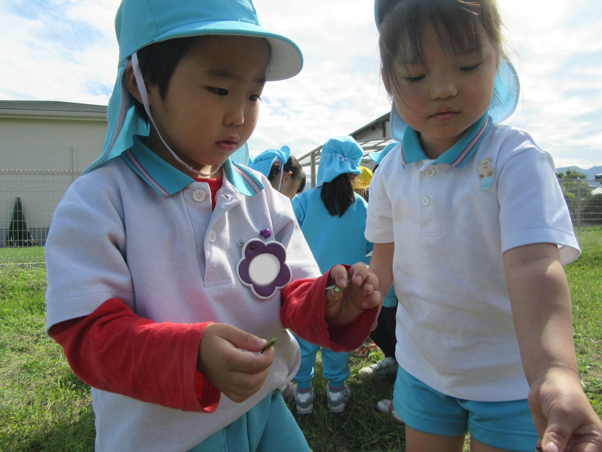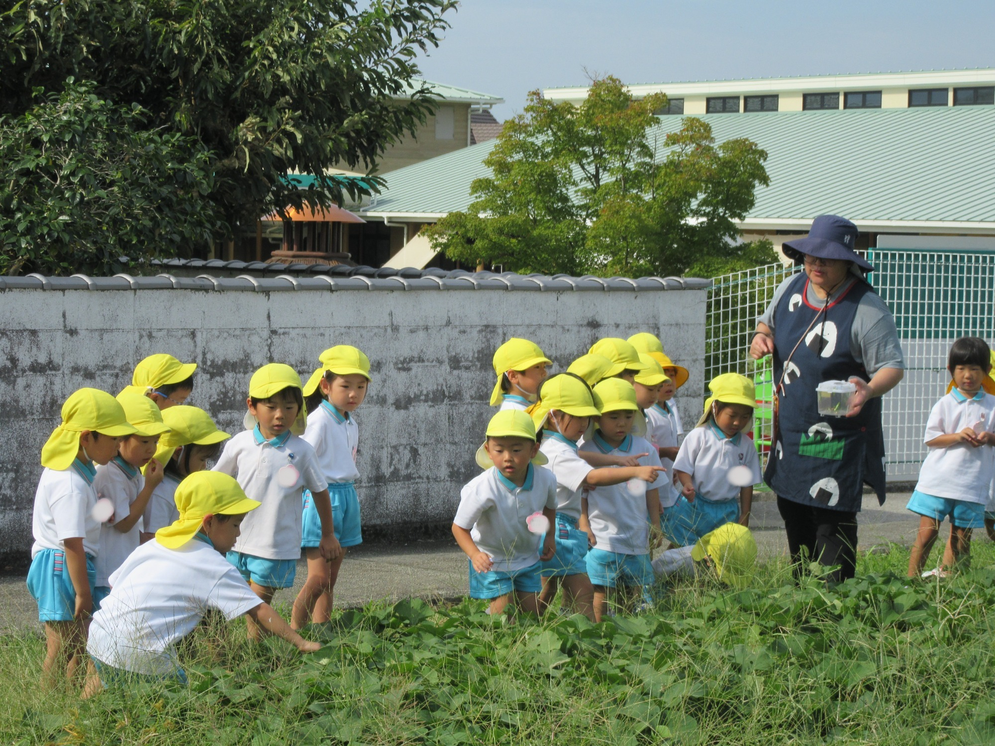 幼稚園のちびっこ農園で、季節ごとにいろいろな作物を育てています。今はさつま芋が順調に??土の中で大きくなっているはずです。土の上ではつるが伸びて葉も茂っています。そこにバッタがたくさんいたので、子供たちは夢中で捕まえていました!帰ろうとしたところ、「あそこにカマキリがいる!!」とカマキリを発見!見つけた以上は捕まえないと納得がいかない子供たちのために、先生は頑張ってなんとかゲットしました!ヤッタ♪