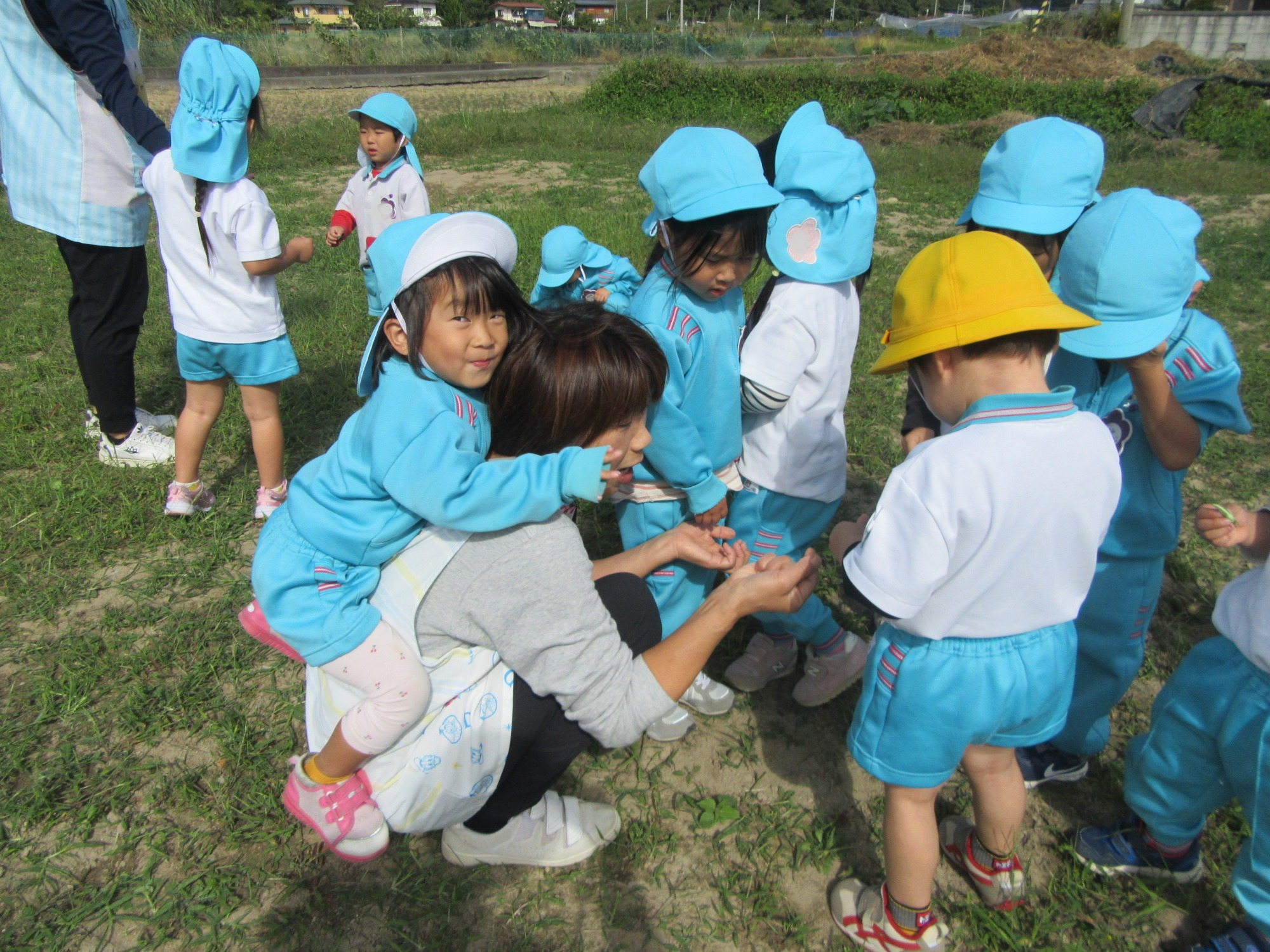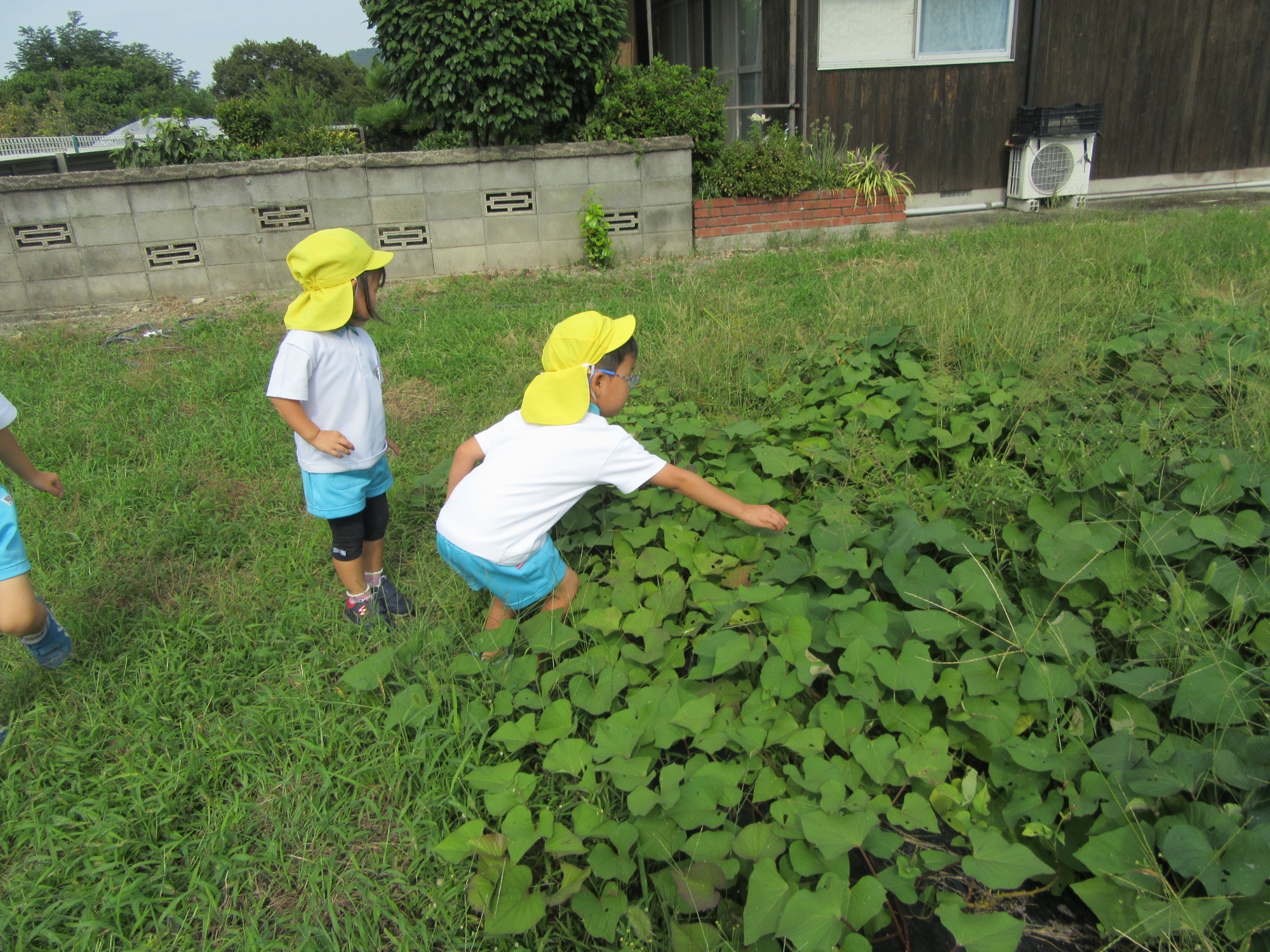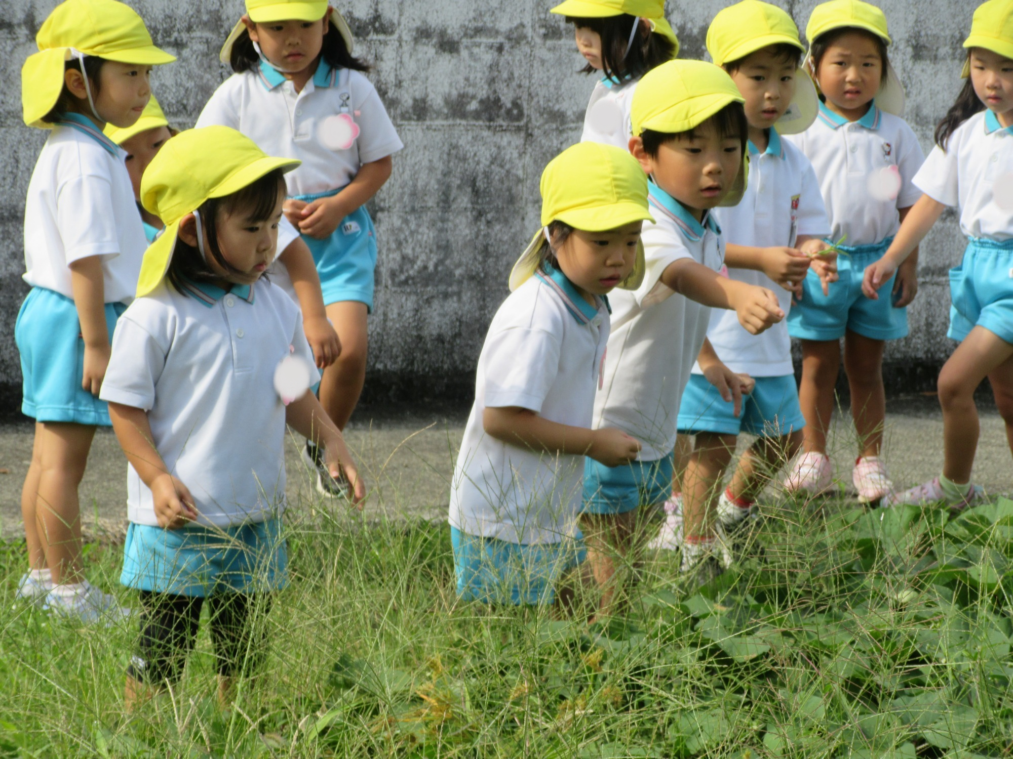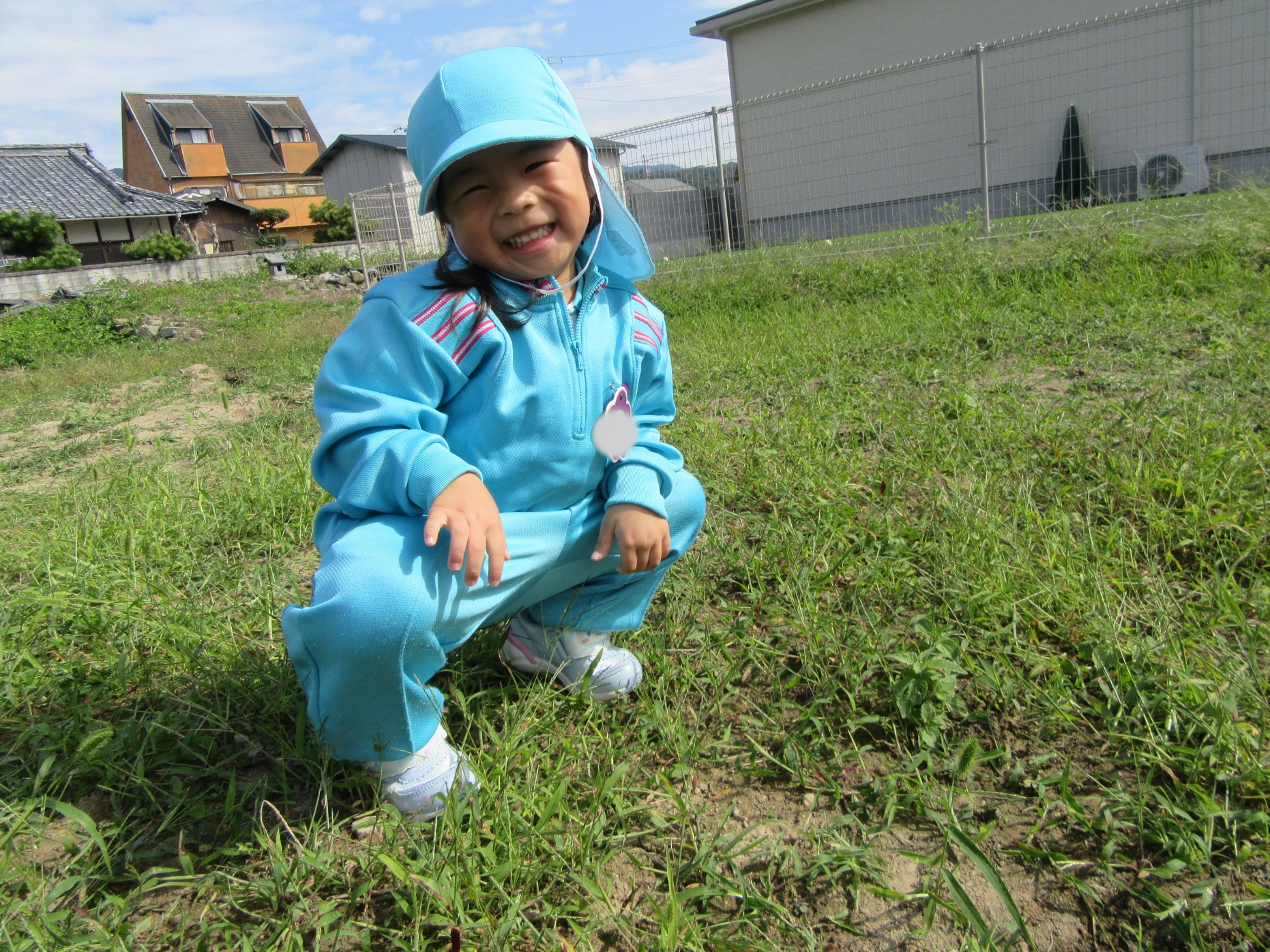 幼稚園のちびっこ農園で、季節ごとにいろいろな作物を育てています。今はさつま芋が順調に??土の中で大きくなっているはずです。土の上ではつるが伸びて葉も茂っています。そこにバッタがたくさんいたので、子供たちは夢中で捕まえていました!帰ろうとしたところ、「あそこにカマキリがいる!!」とカマキリを発見!見つけた以上は捕まえないと納得がいかない子供たちのために、先生は頑張ってなんとかゲットしました!ヤッタ♪