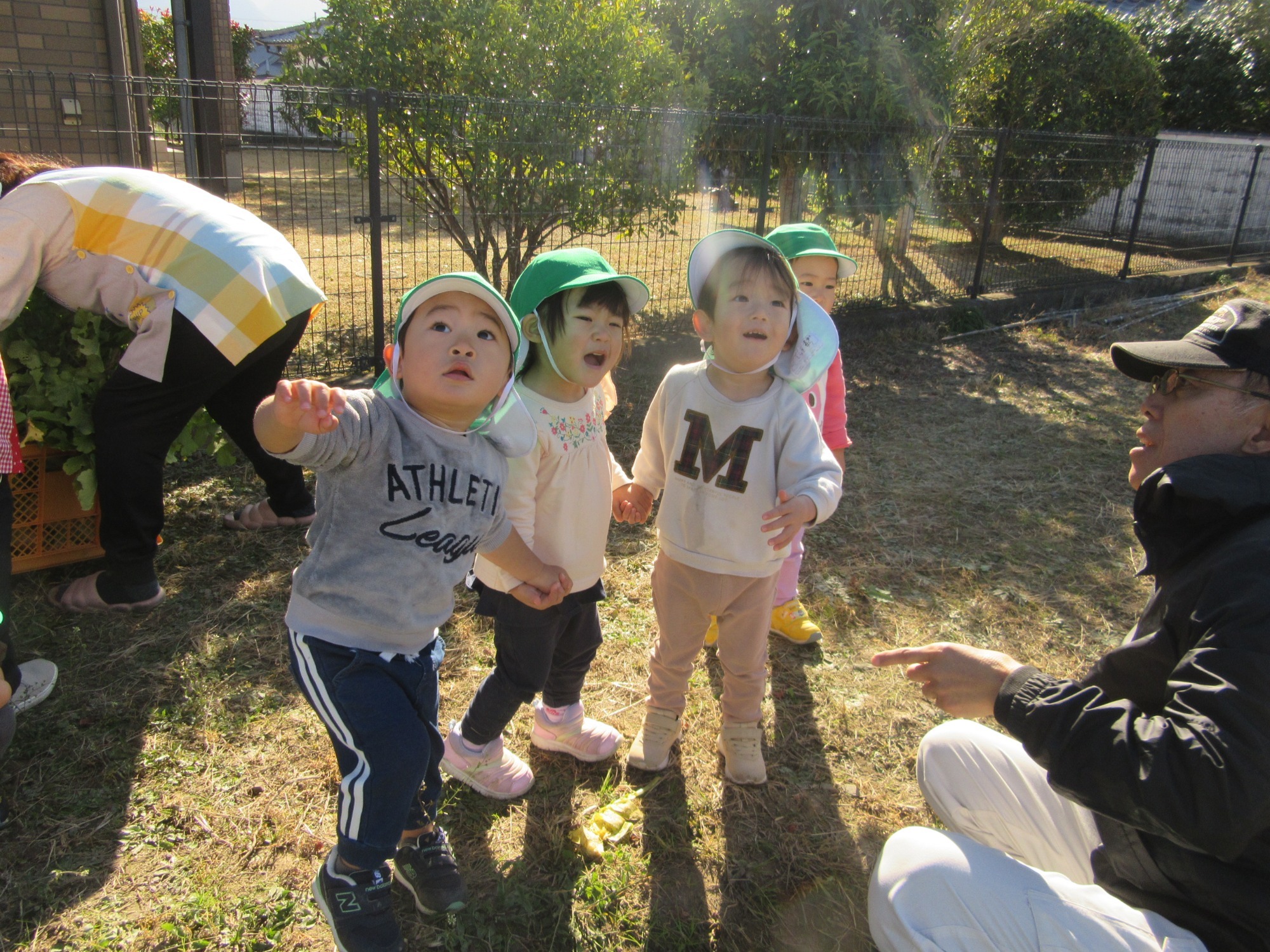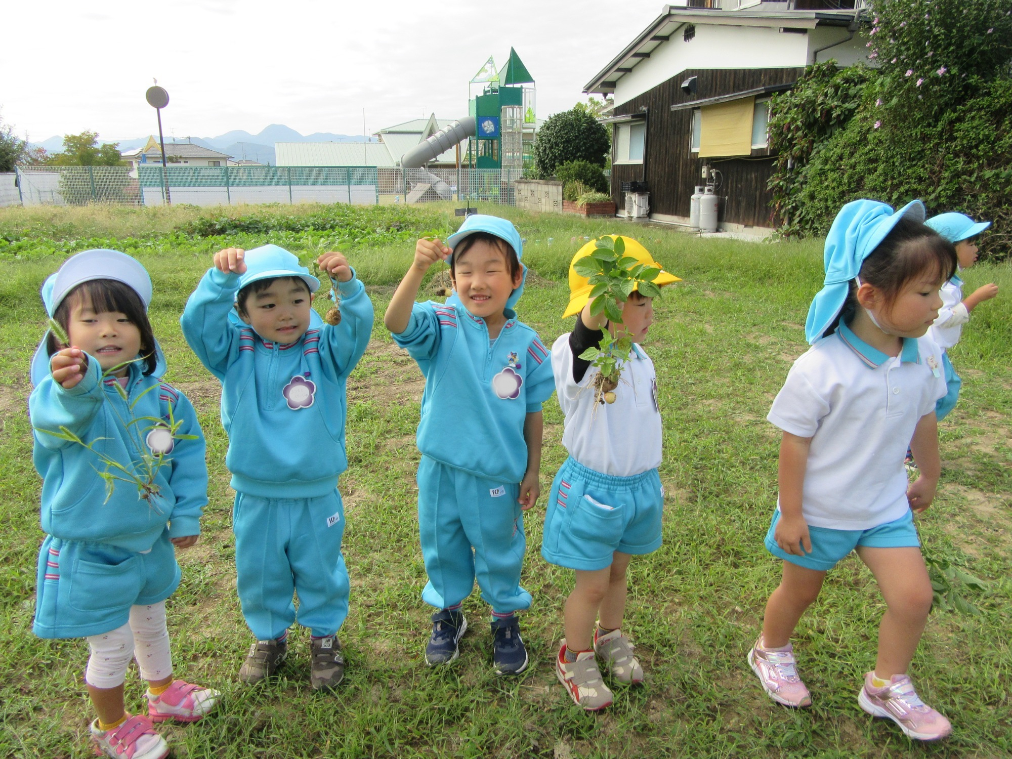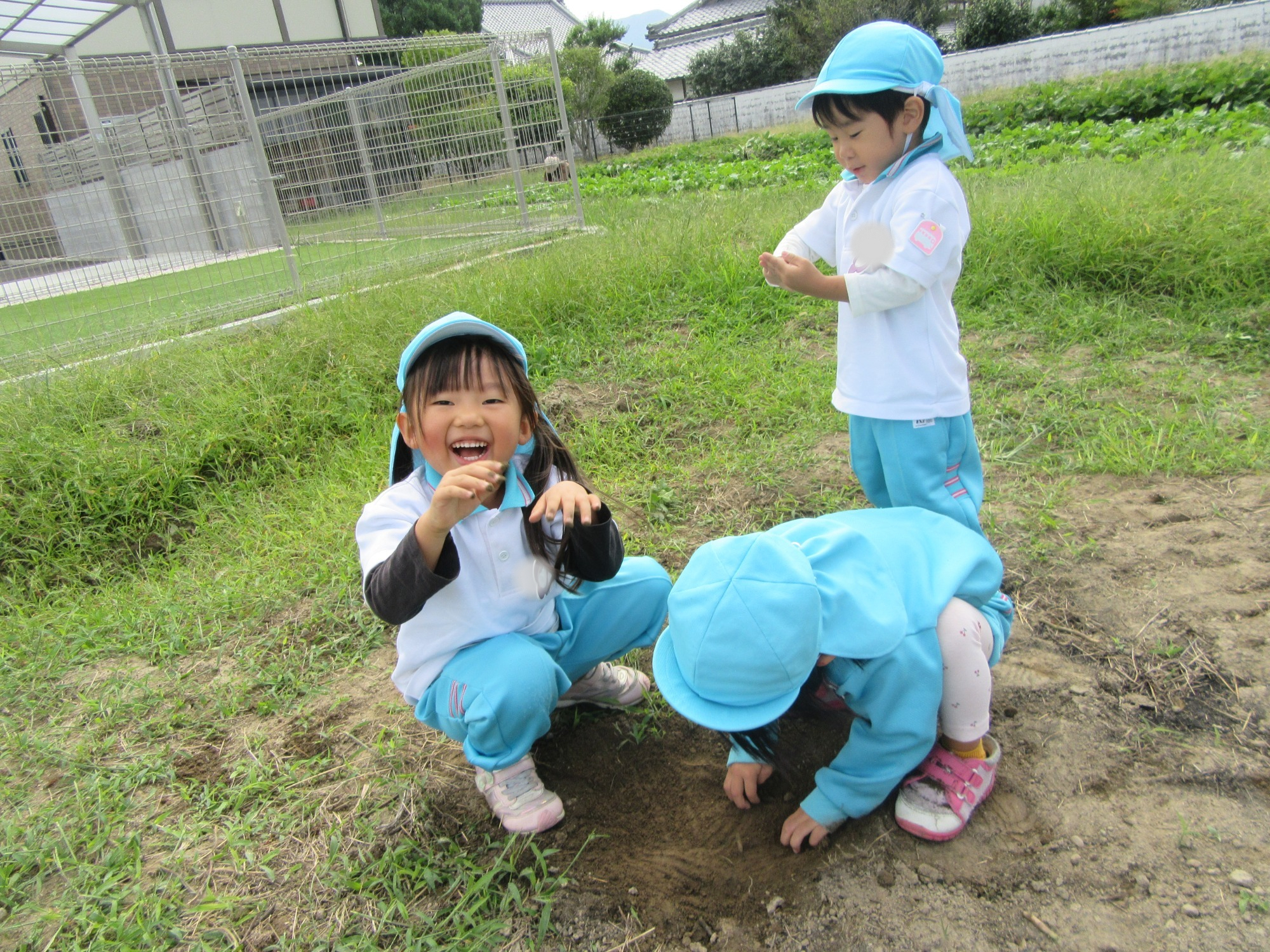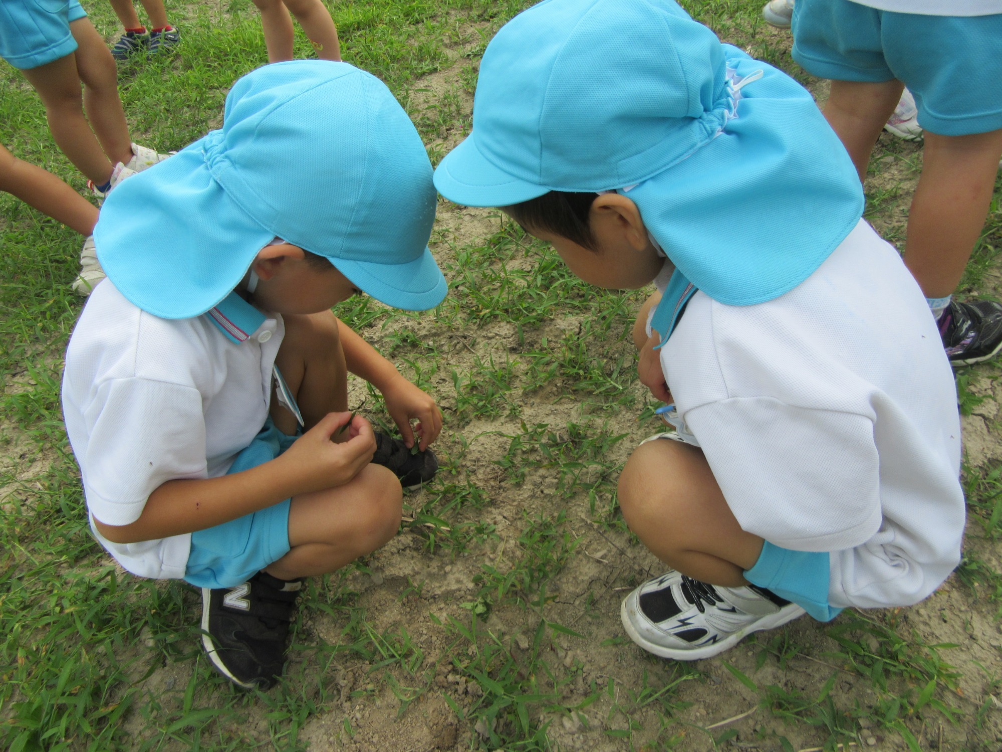 幼稚園のちびっこ農園で、季節ごとにいろいろな作物を育てています。今はさつま芋が順調に??土の中で大きくなっているはずです。土の上ではつるが伸びて葉も茂っています。そこにバッタがたくさんいたので、子供たちは夢中で捕まえていました!帰ろうとしたところ、「あそこにカマキリがいる!!」とカマキリを発見!見つけた以上は捕まえないと納得がいかない子供たちのために、先生は頑張ってなんとかゲットしました!ヤッタ♪