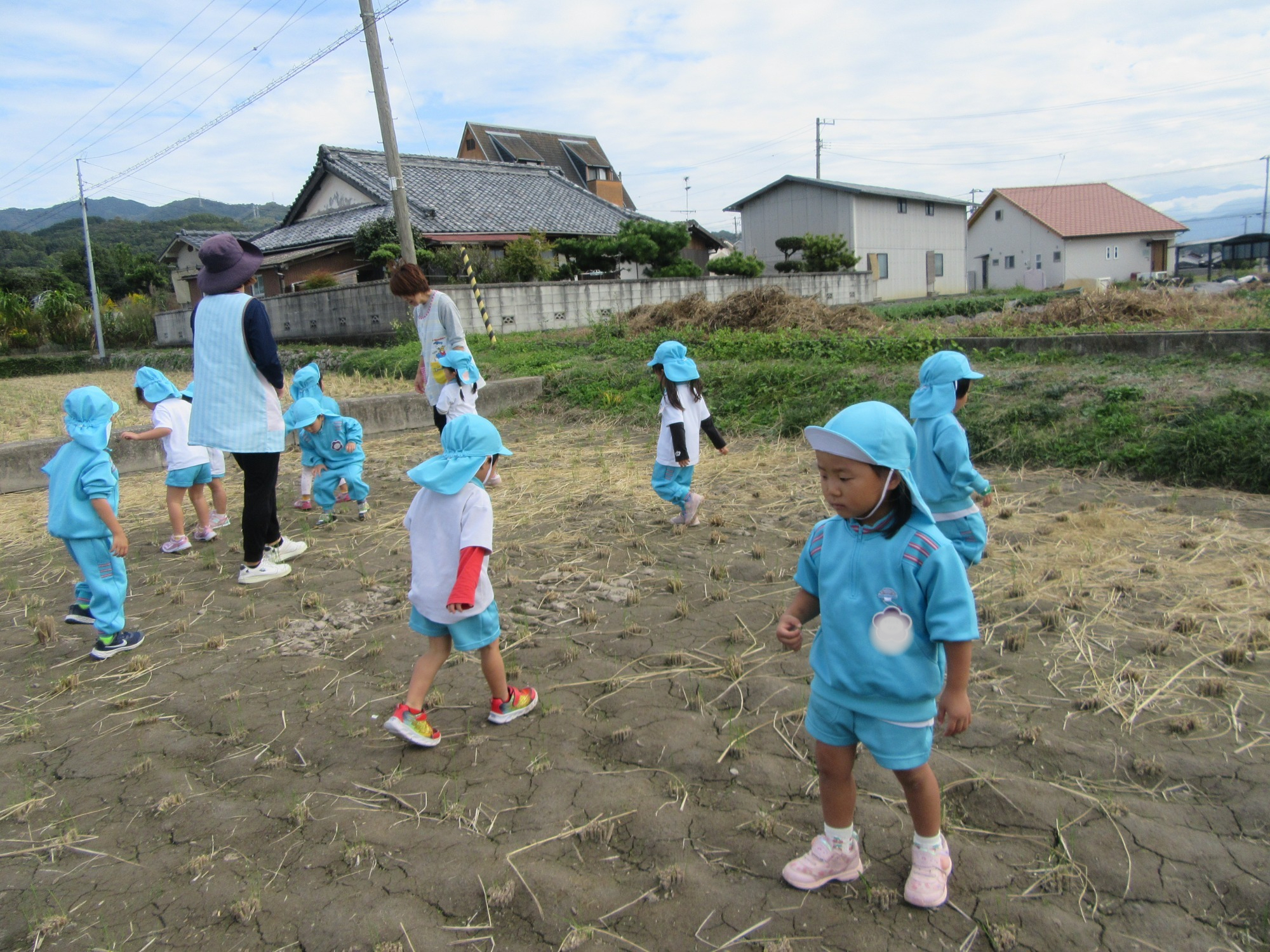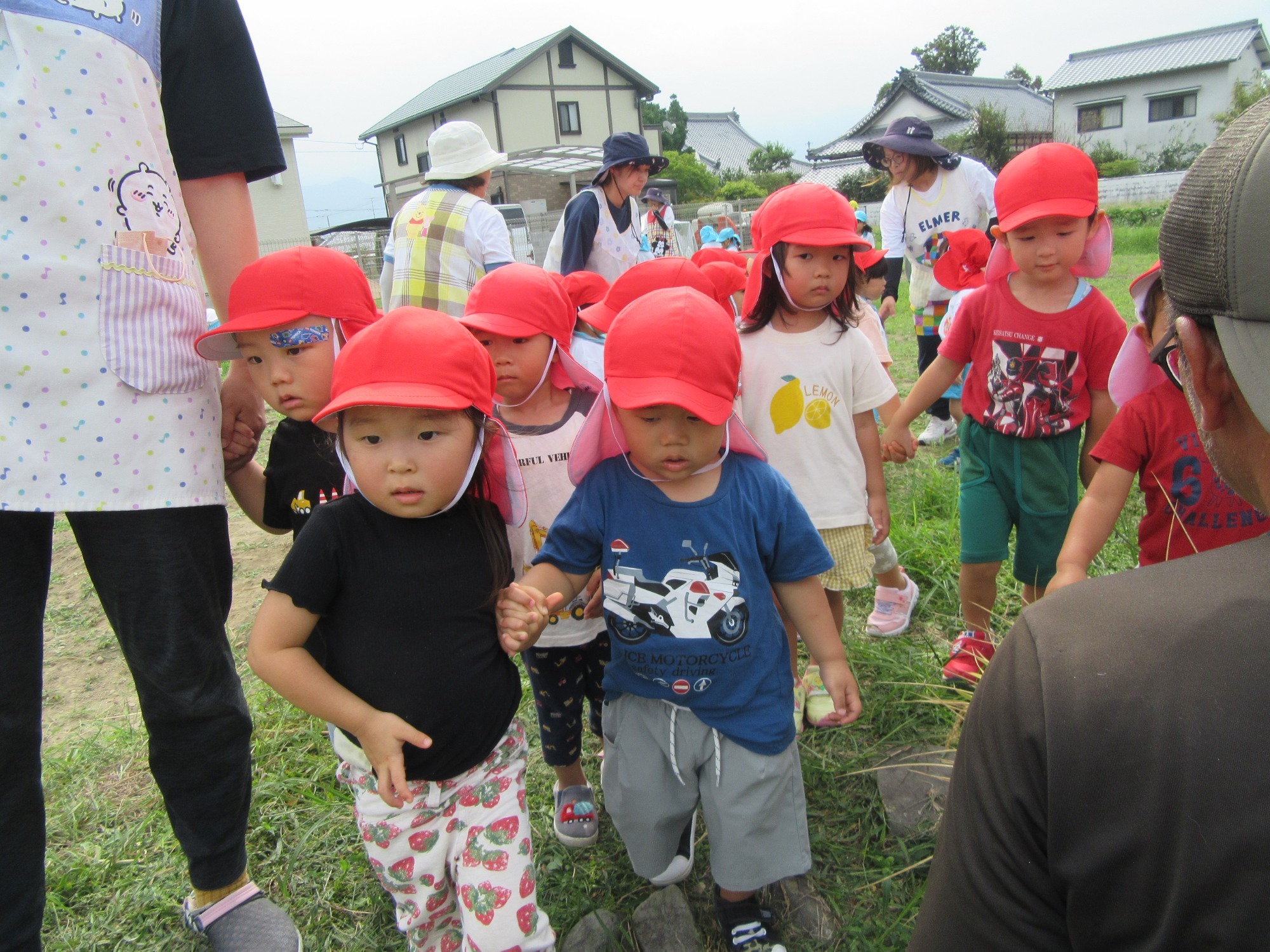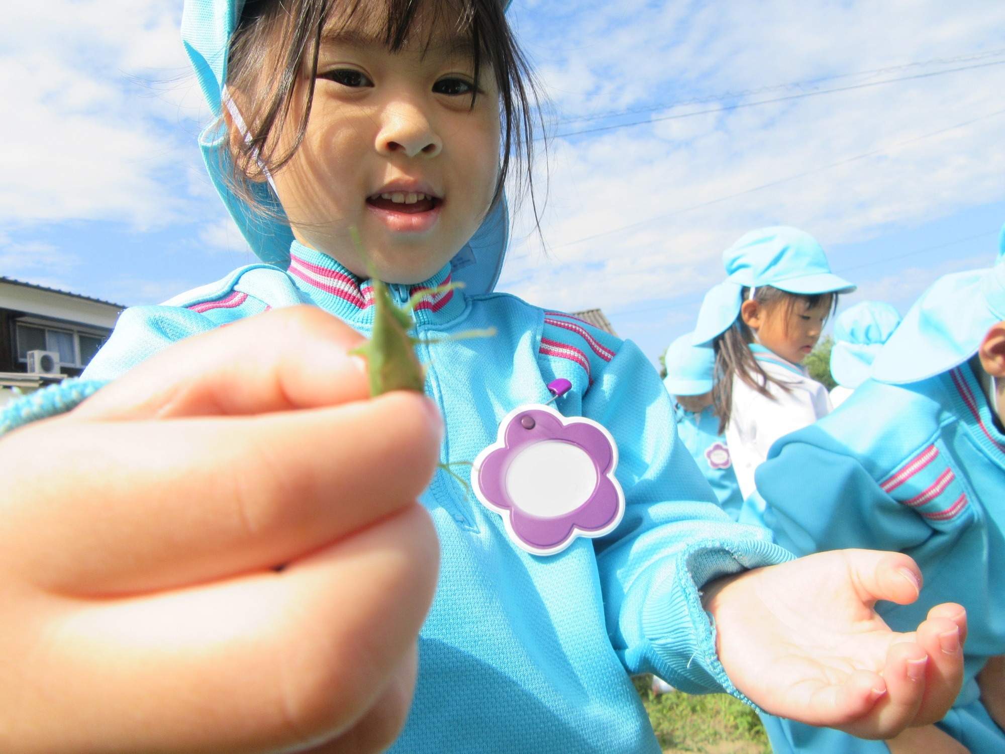 今日はぞう組さんとひよこ組さんが一緒に田んぼへお散歩です。見つけたバッタもカマキリも赤ちゃんばかりでした。赤ちゃんサイズならカマキリでもひょいっと捕まえられるのに、大きくなったら怖くて触れなくなってしまいます、、、みんなは大きなカマキリ触れるかな?