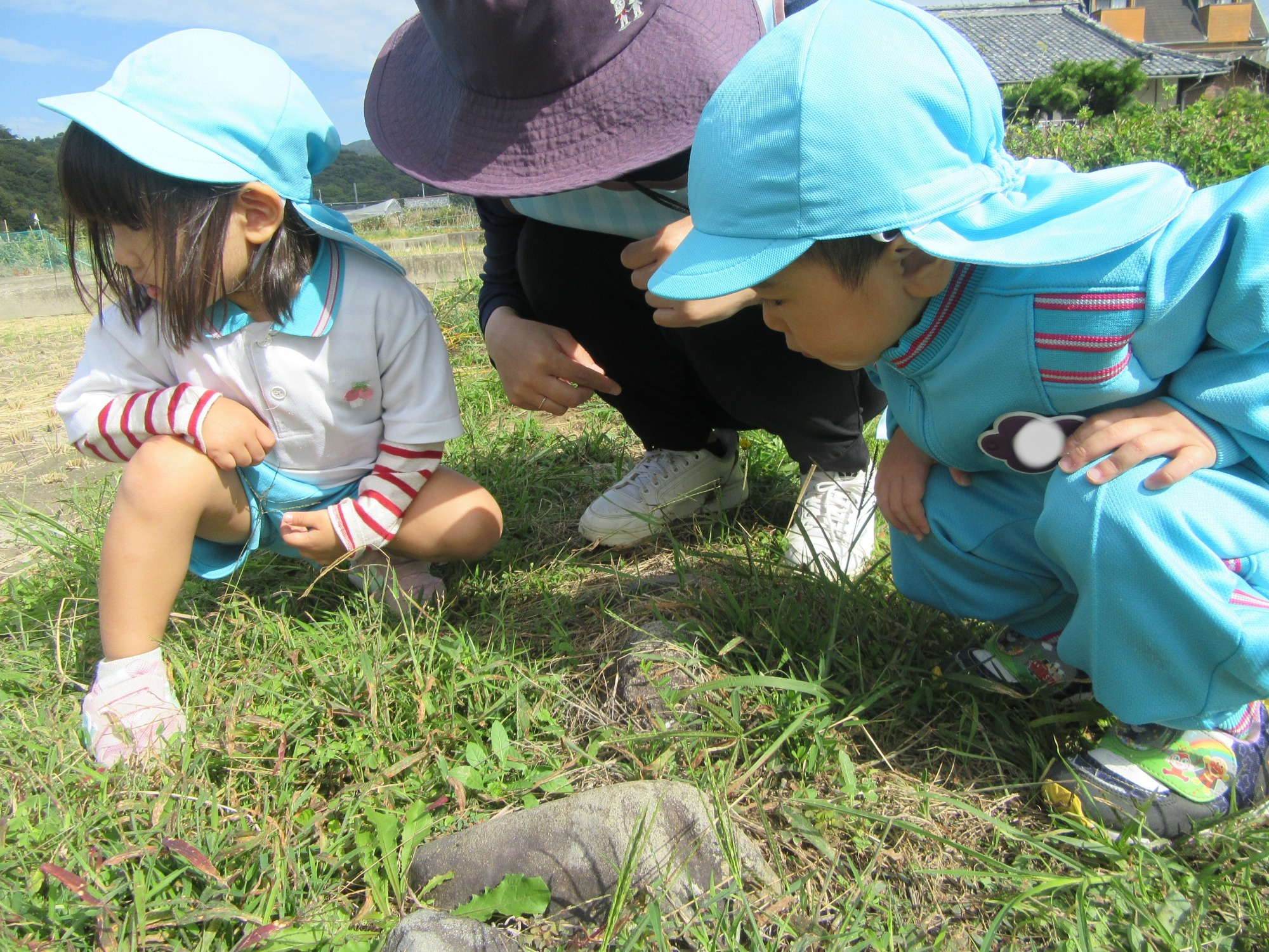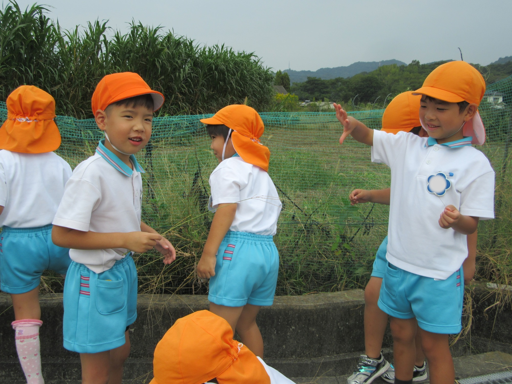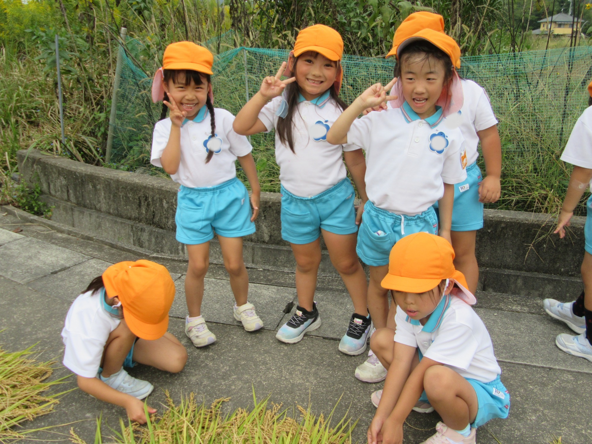 年長組さんが幼稚園の田んぼまで虫やお花を探しに行きました。図鑑とお散歩バックを持ってレッツゴー!なんとなんと、小さい赤ちゃん蛇にも遭遇!発見がいっぱいの田んぼでした!