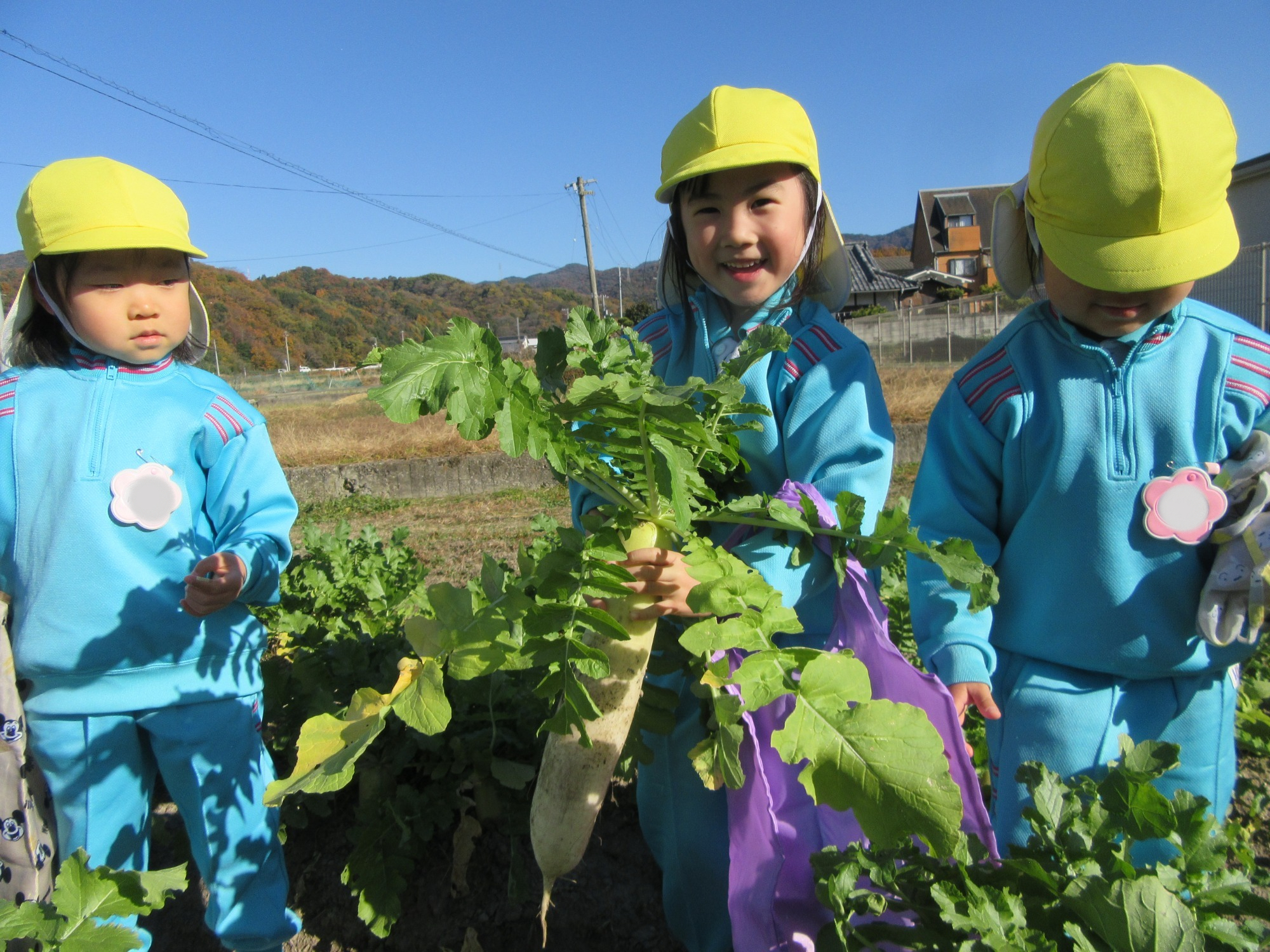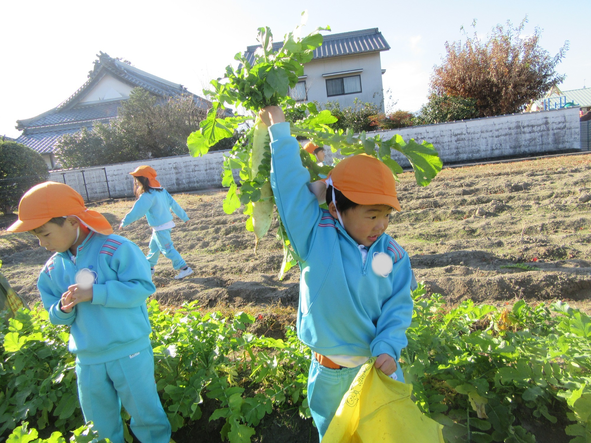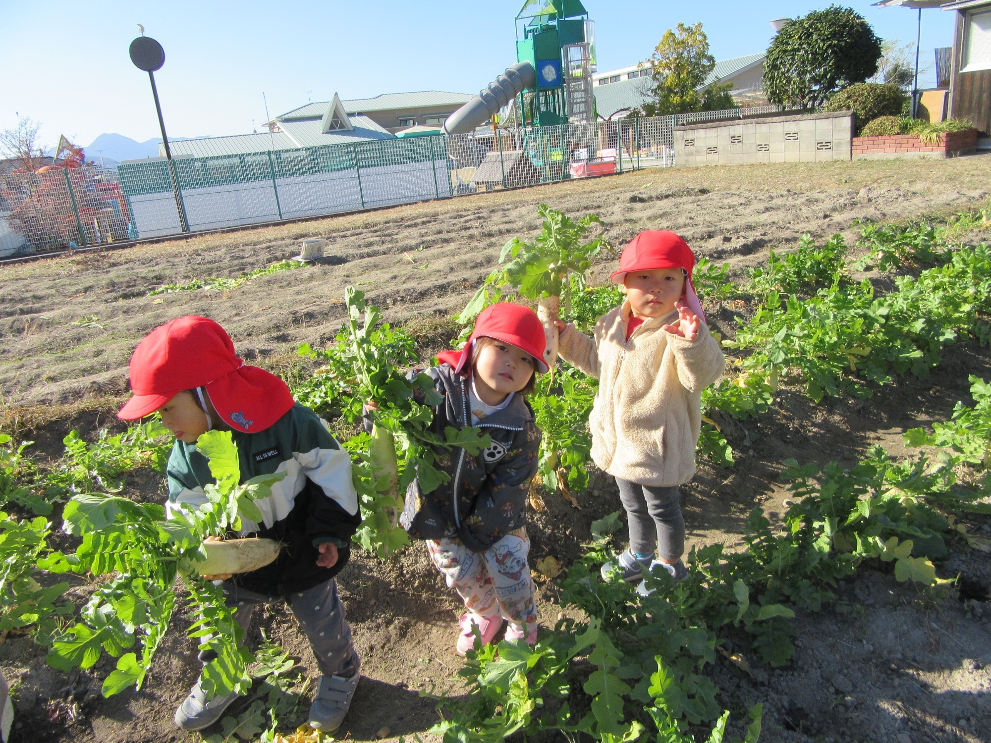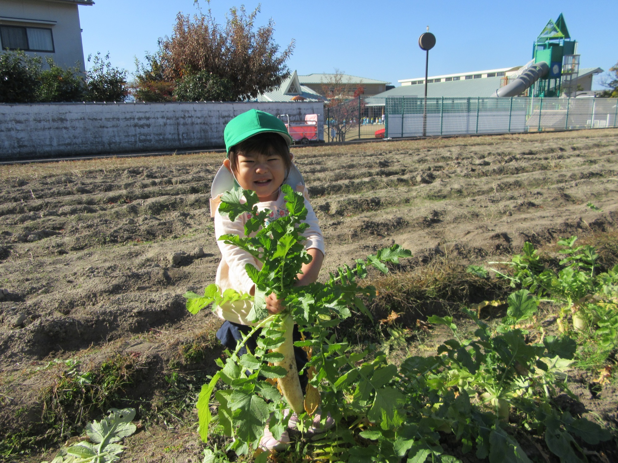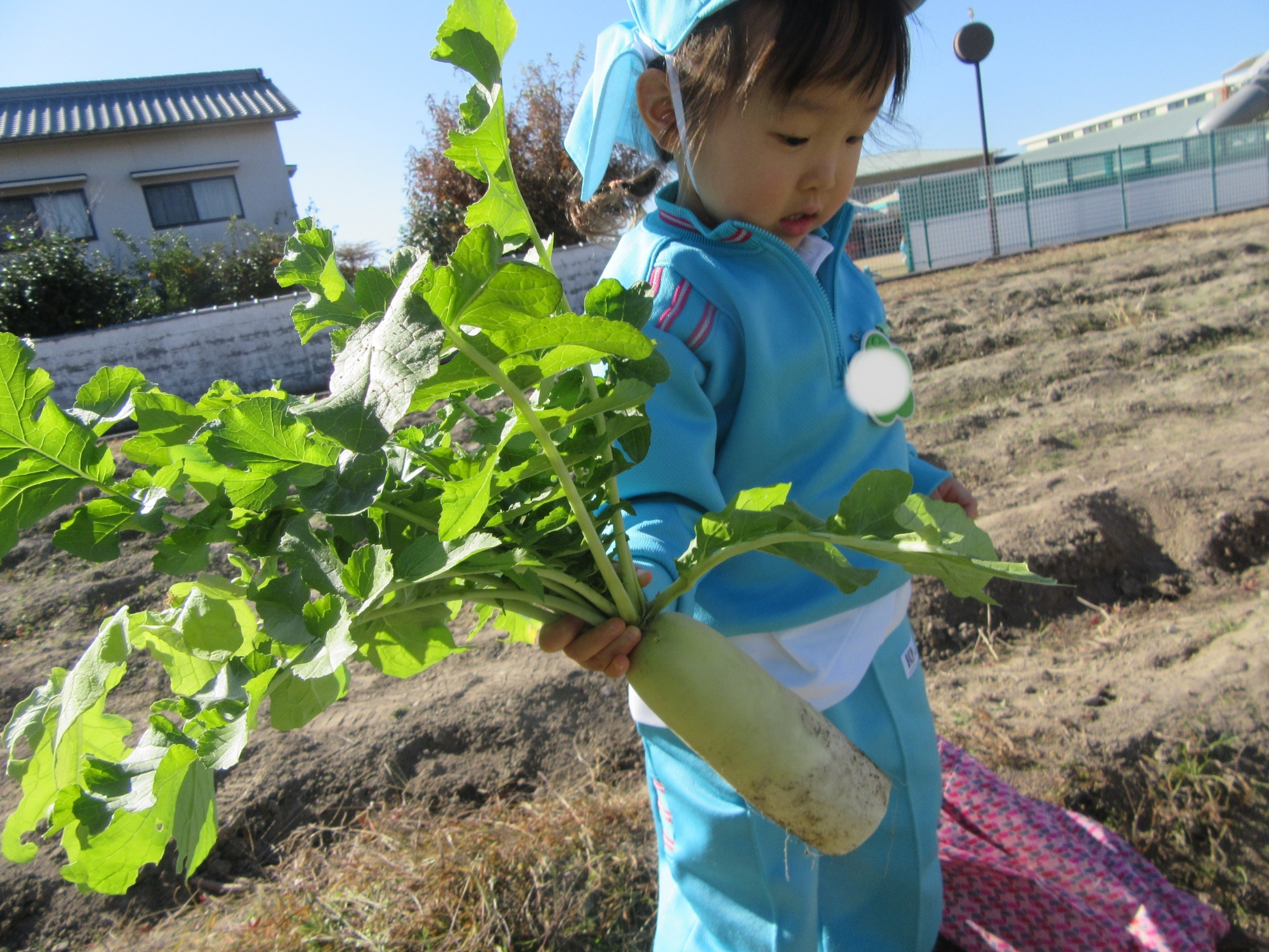幼稚園のちびっこ農園で、大根を収穫しました。少し小さいのもありましたが、美味しそうな大根です!何の料理になったかな?