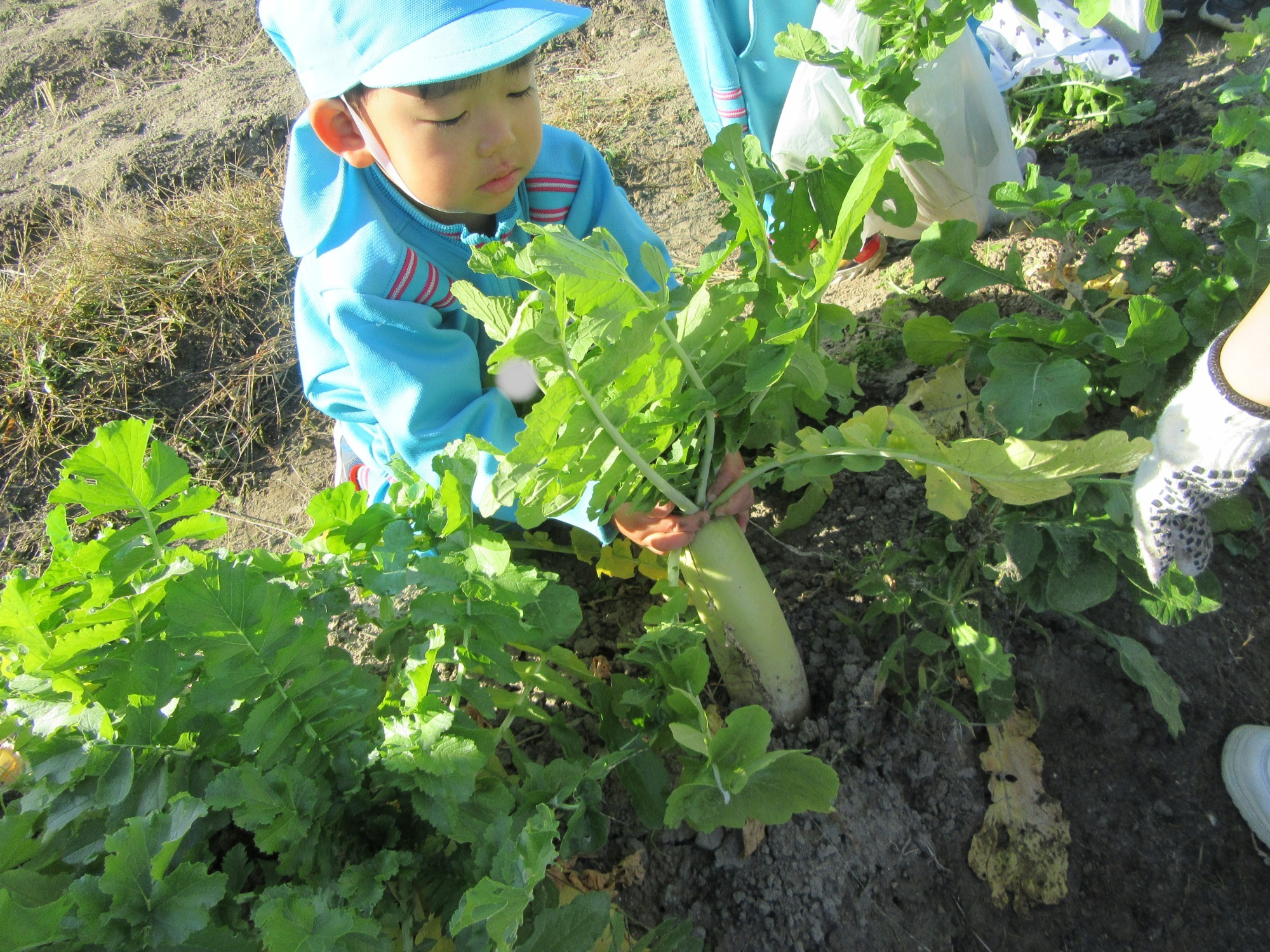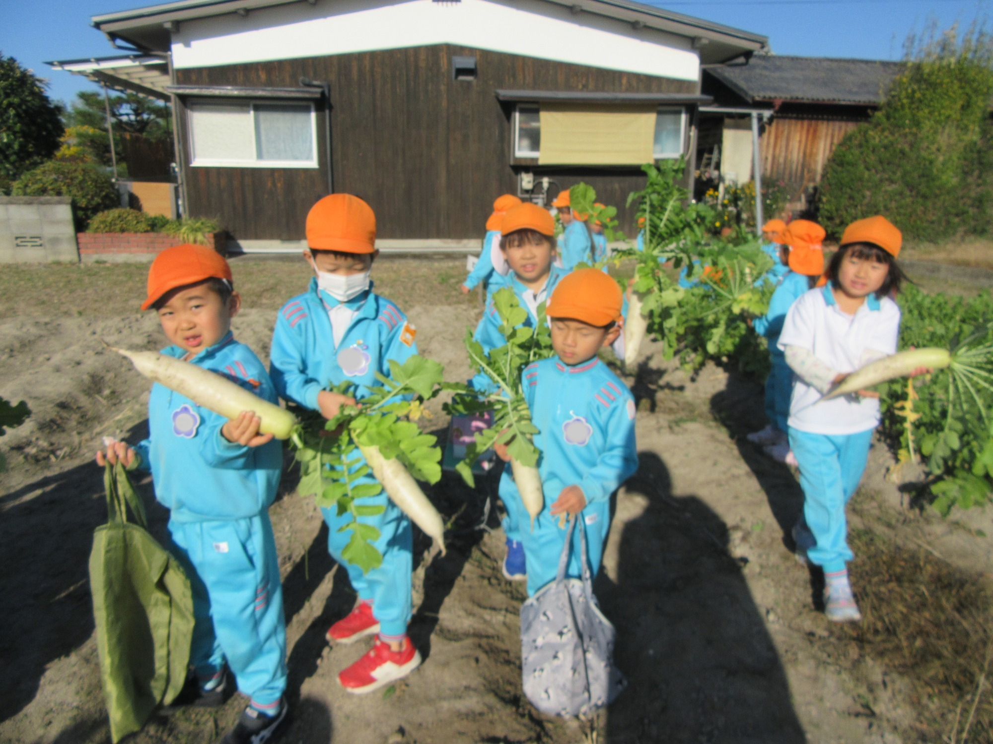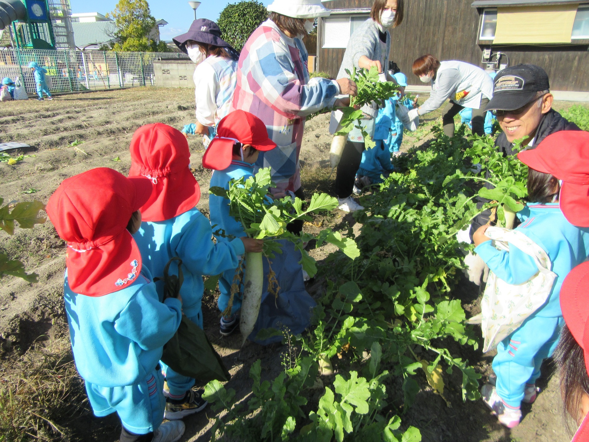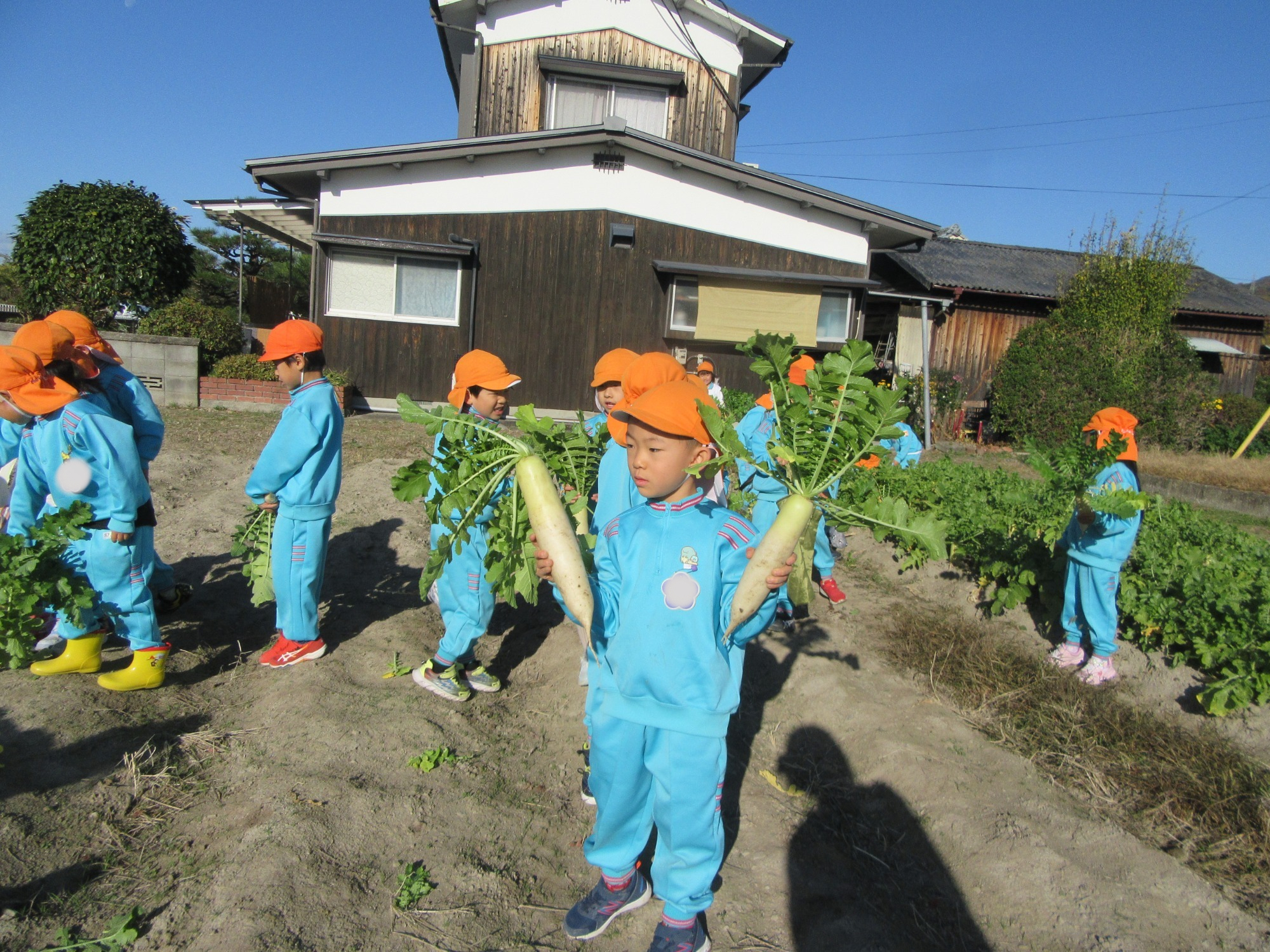 幼稚園のちびっこ農園で、大根を収穫しました。少し小さいのもありましたが、美味しそうな大根です!何の料理になったかな?