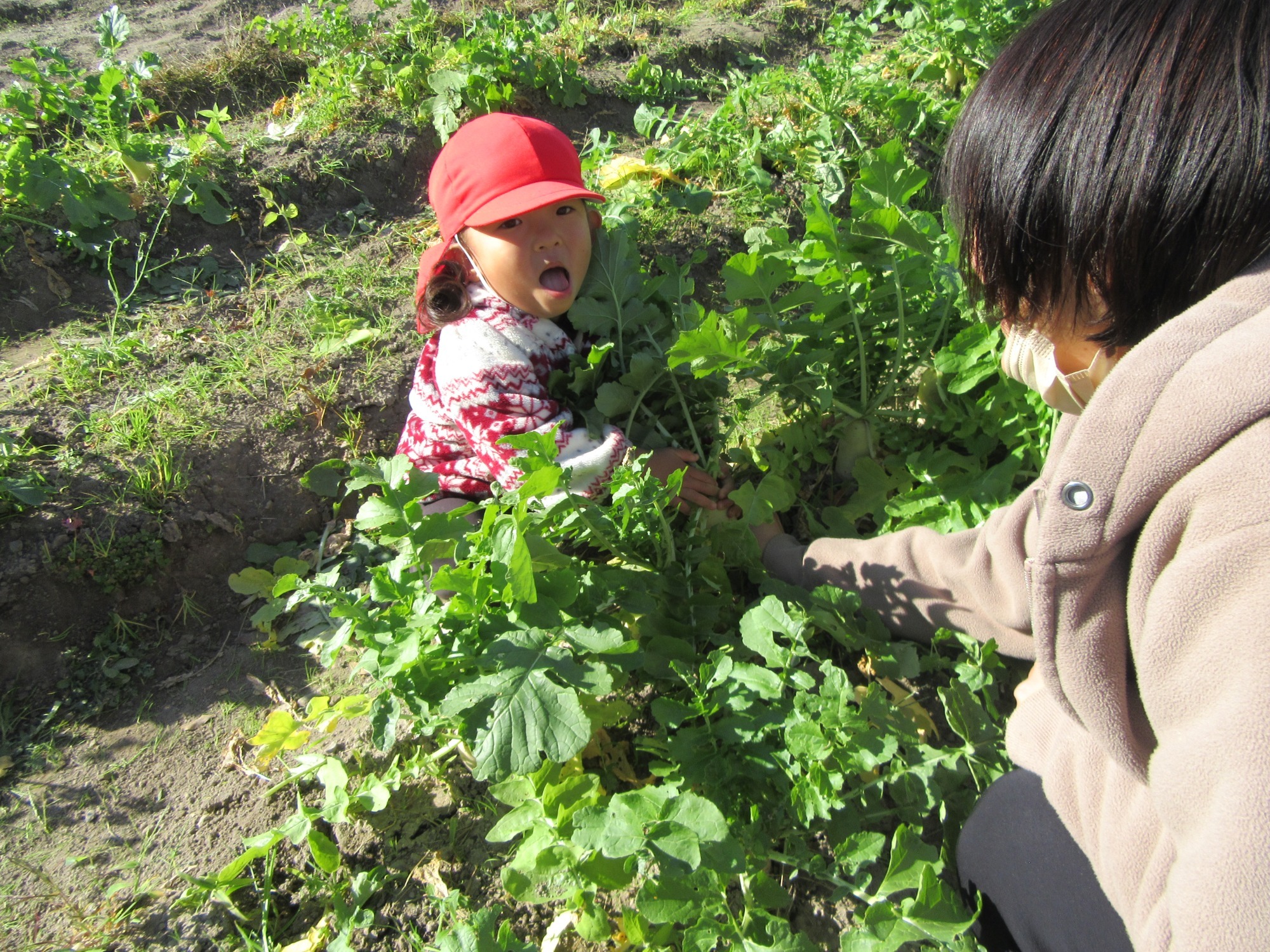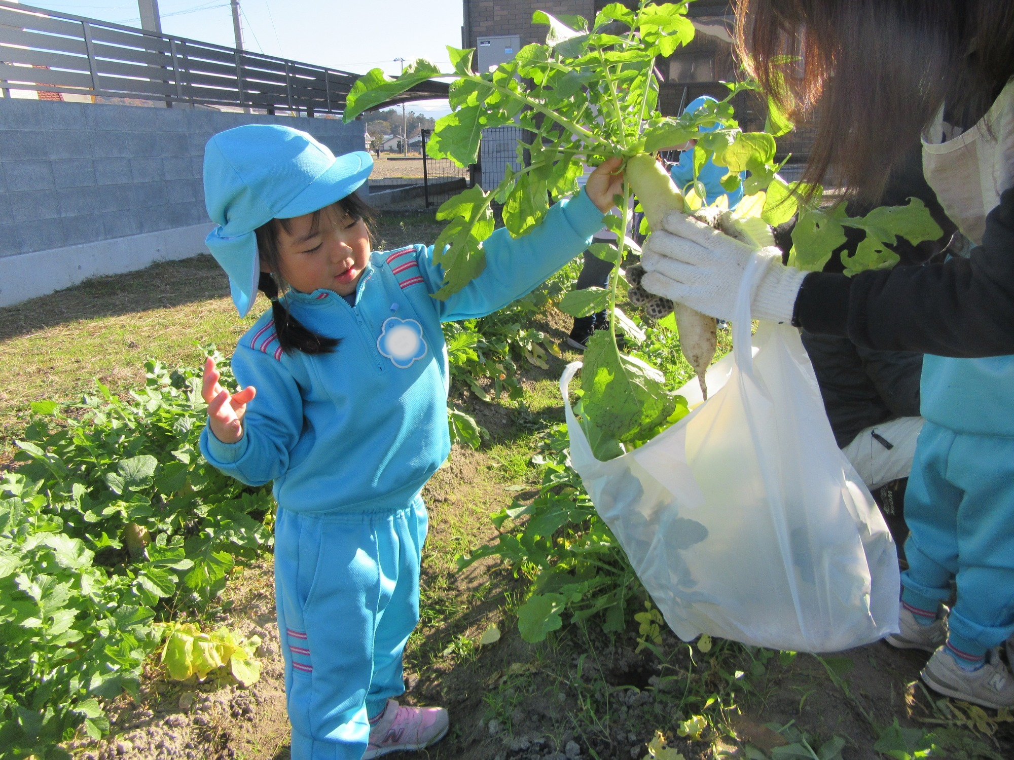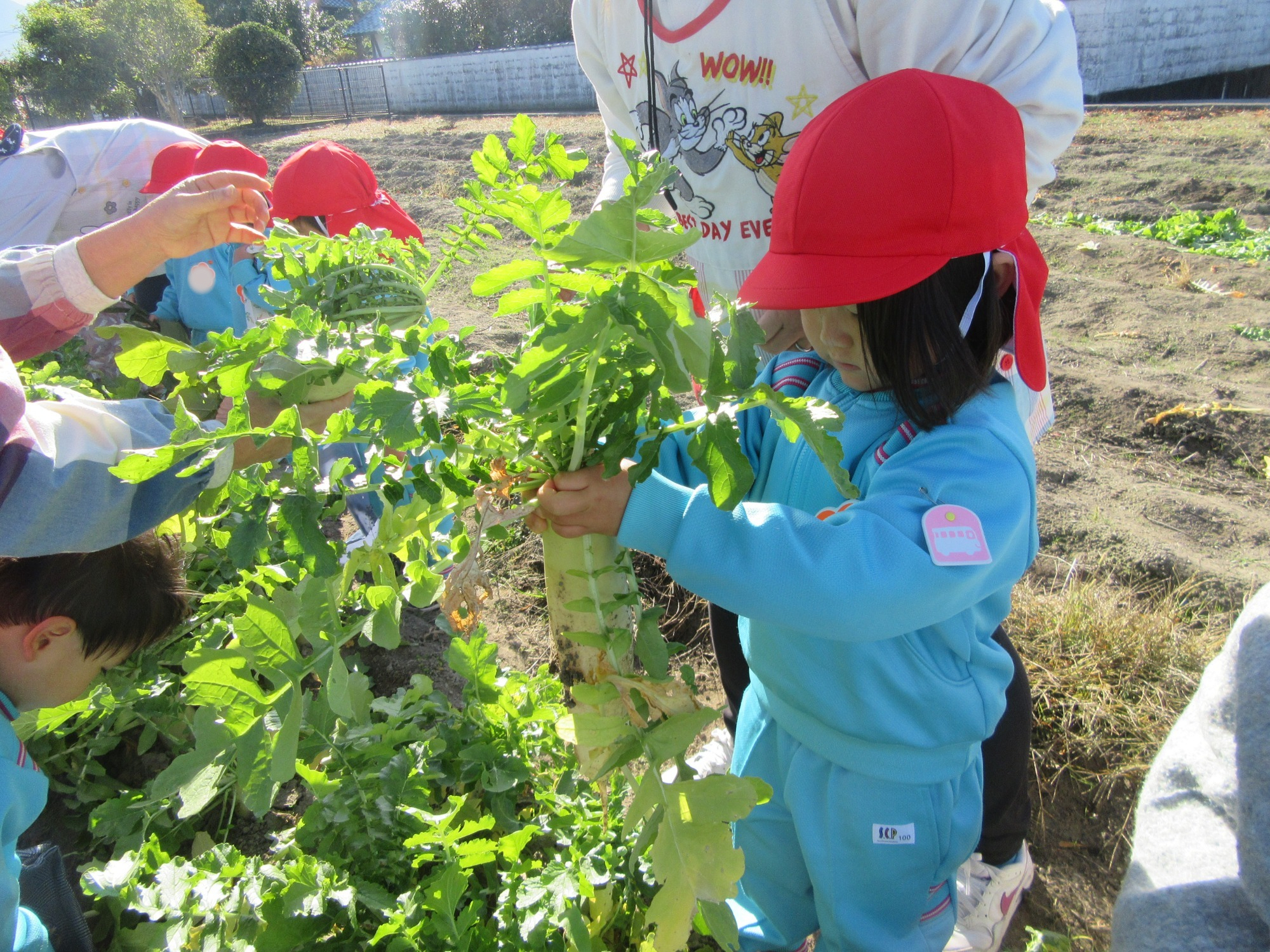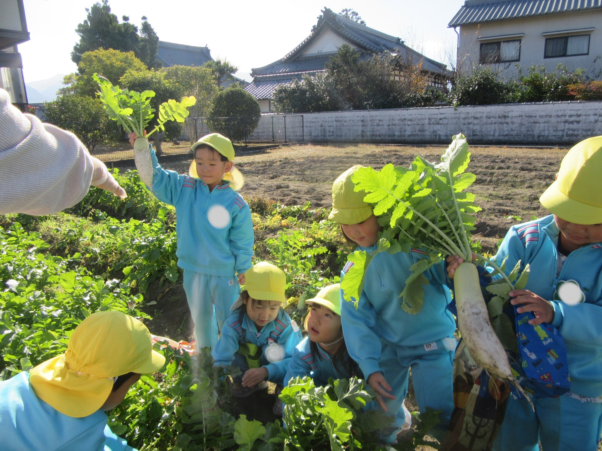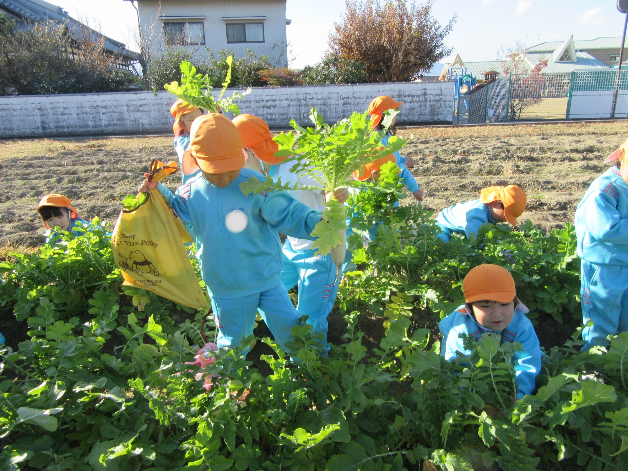 幼稚園のちびっこ農園で、大根を収穫しました。少し小さいのもありましたが、美味しそうな大根です!何の料理になったかな?