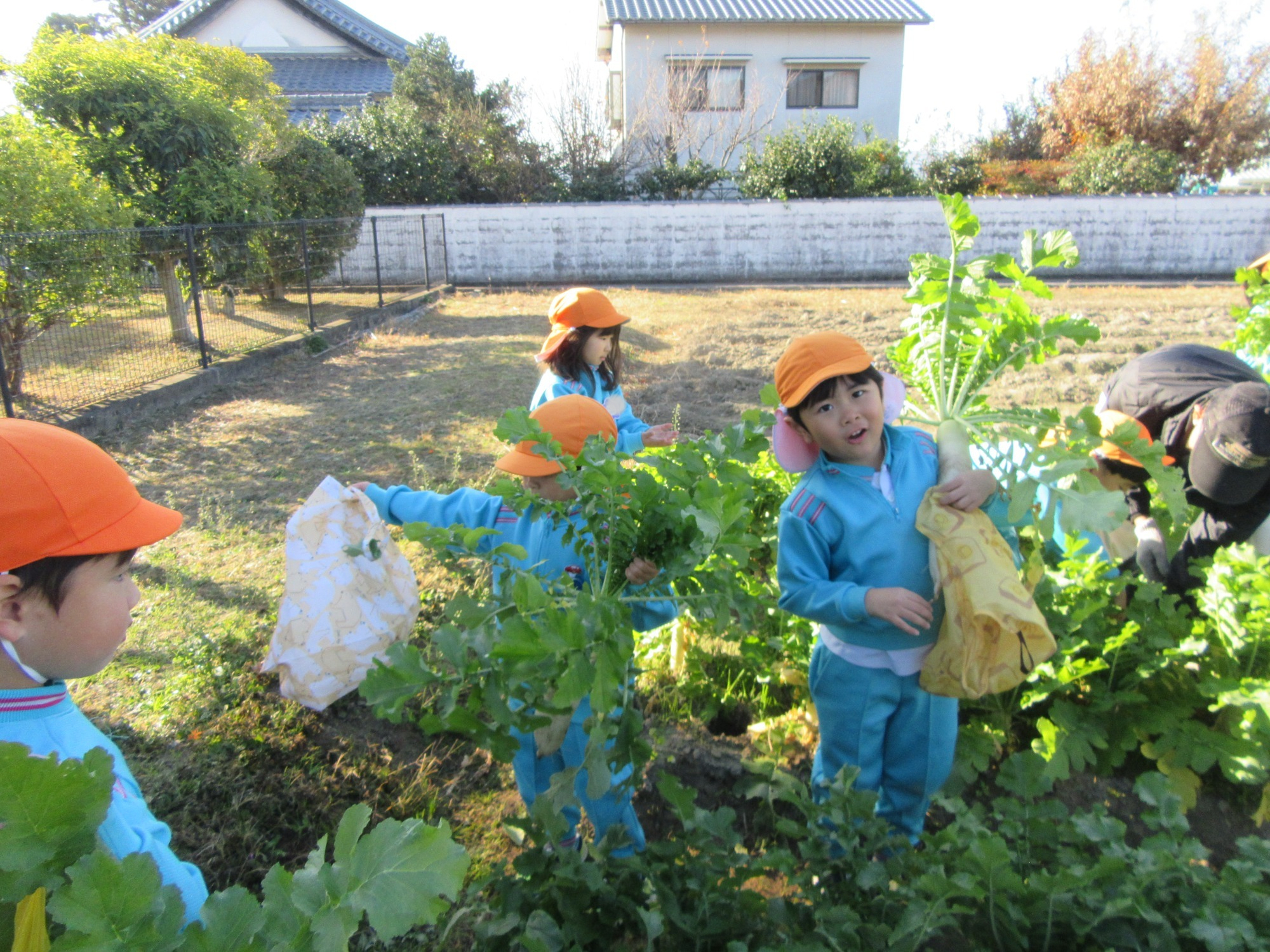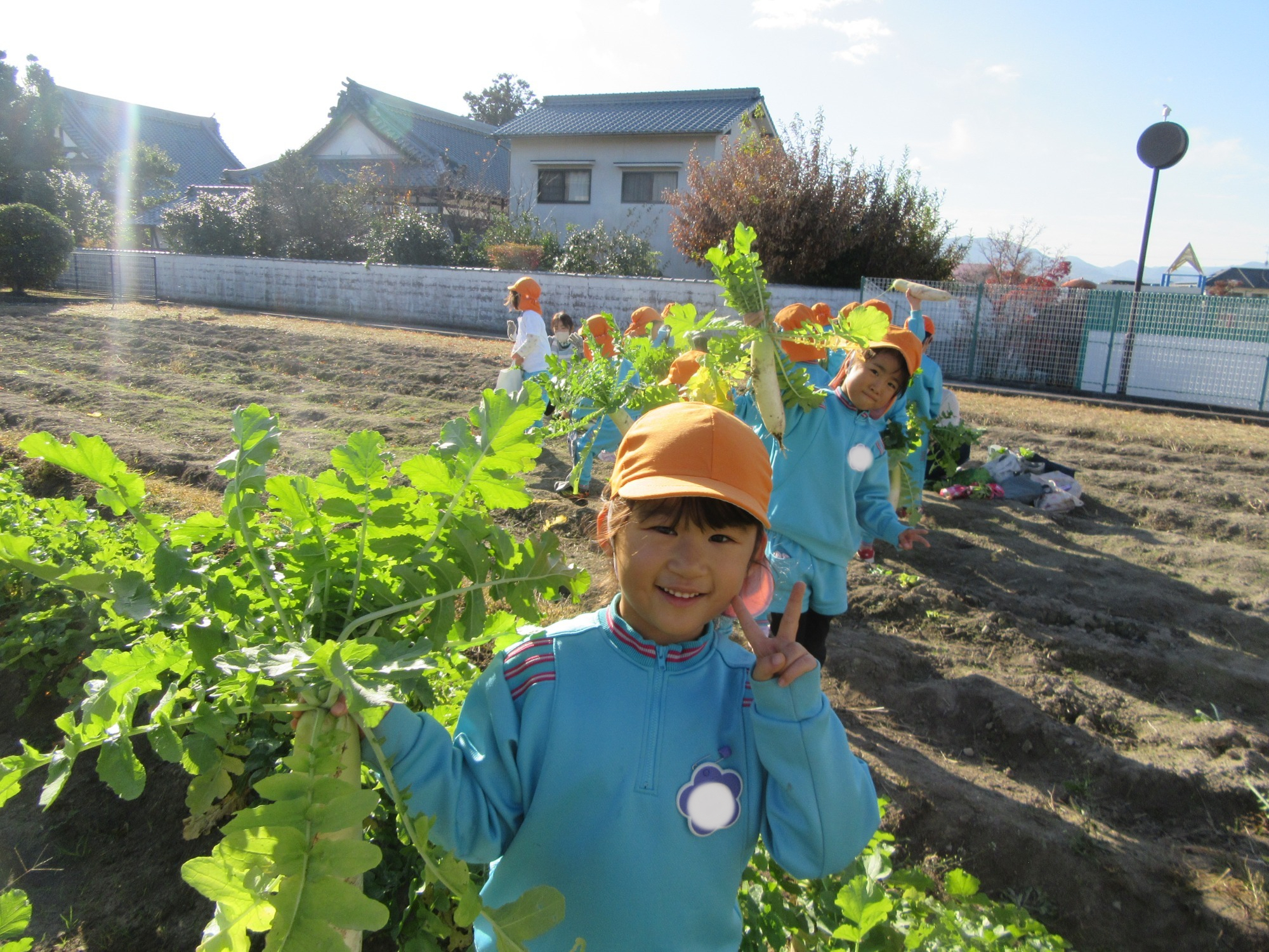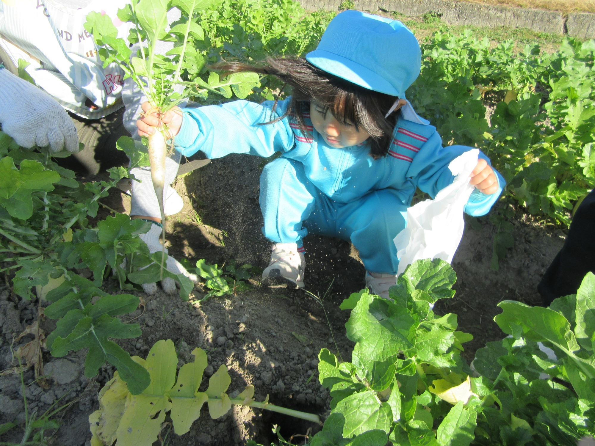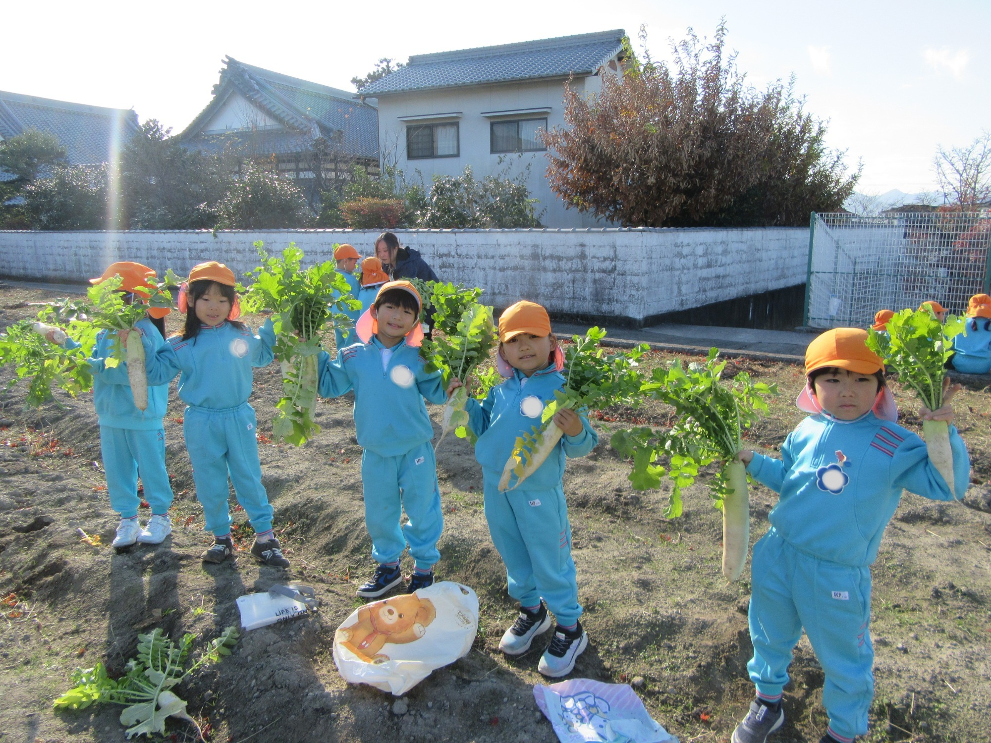 幼稚園のちびっこ農園で、大根を収穫しました。少し小さいのもありましたが、美味しそうな大根です!何の料理になったかな?