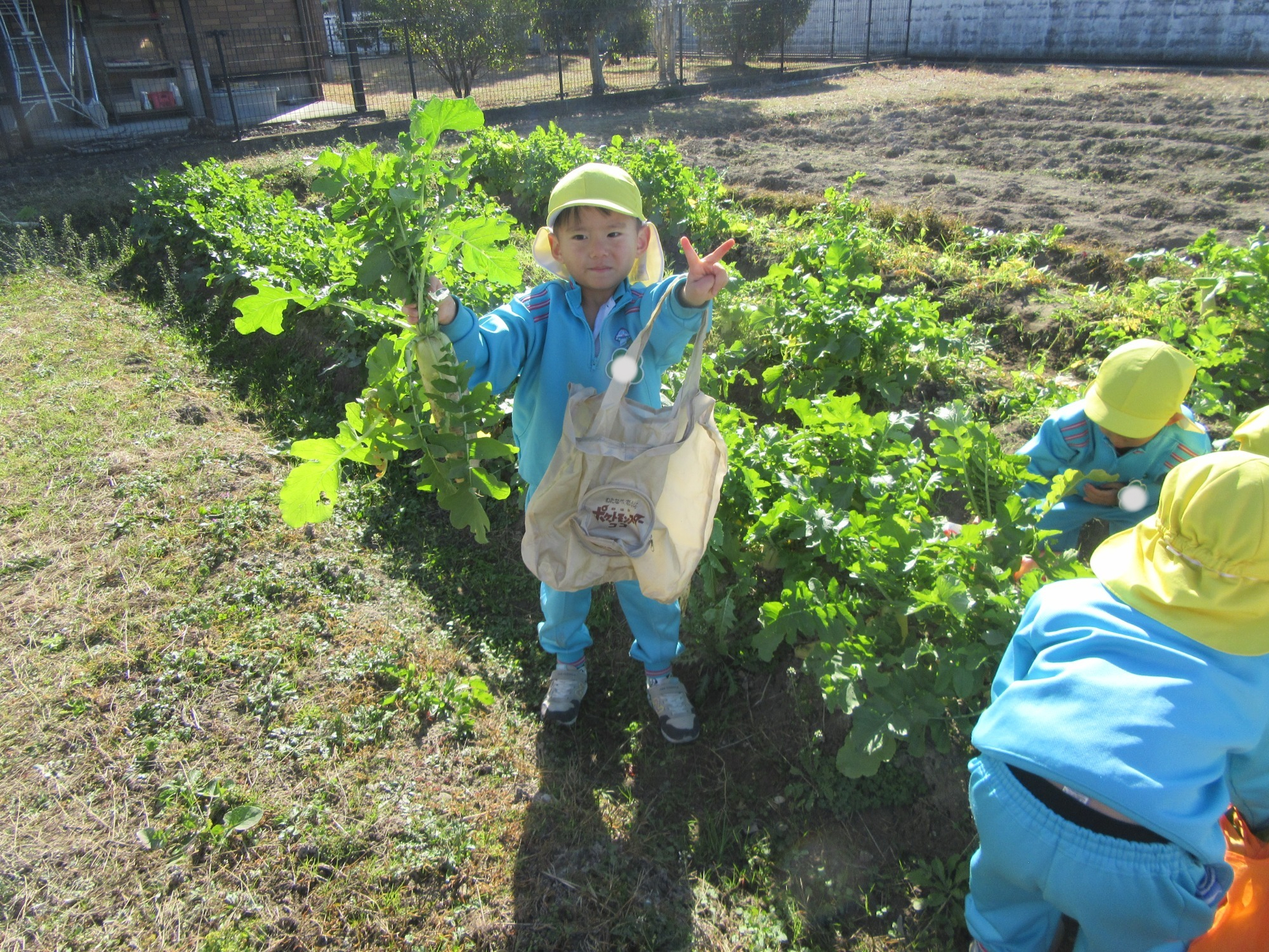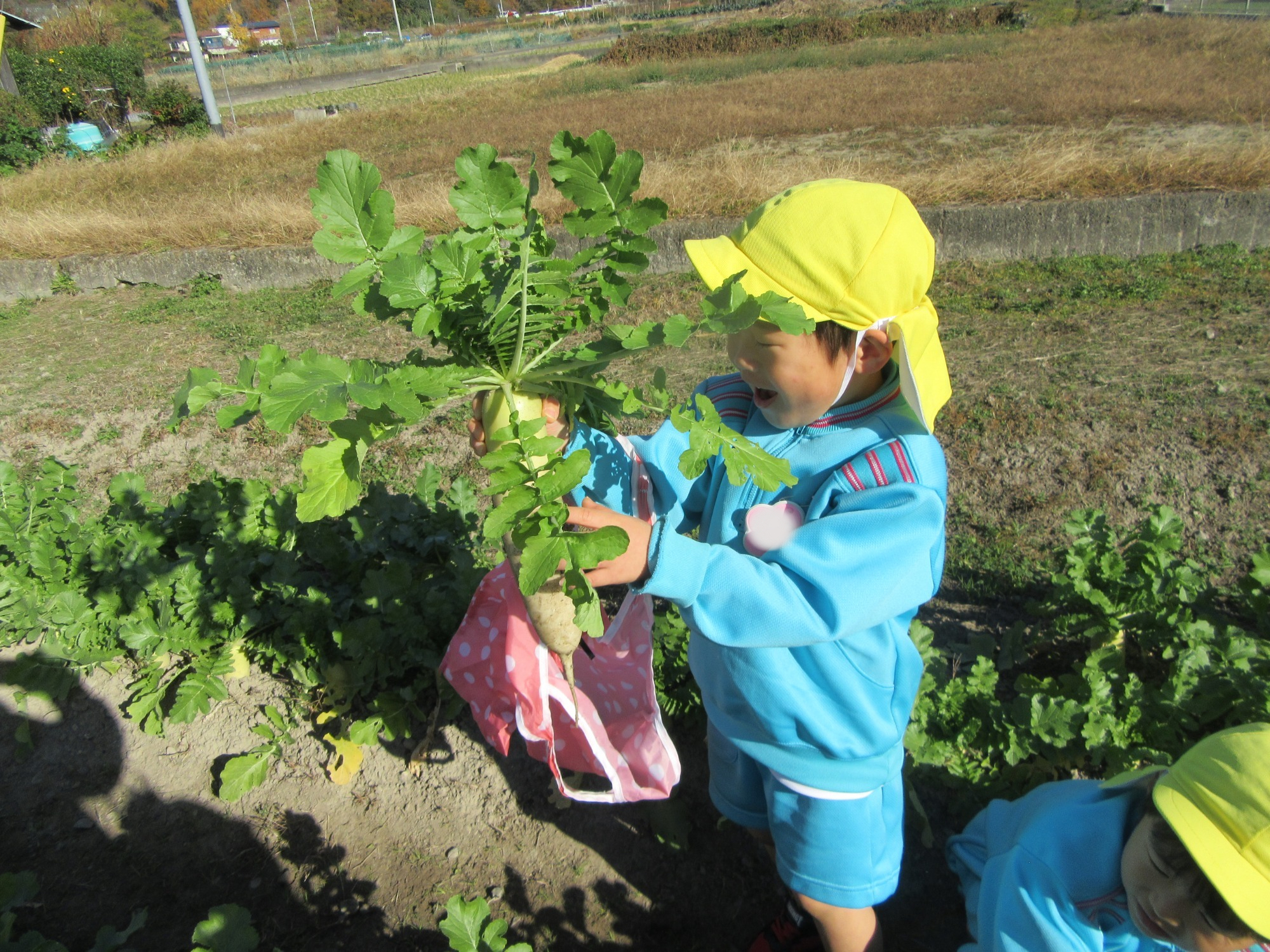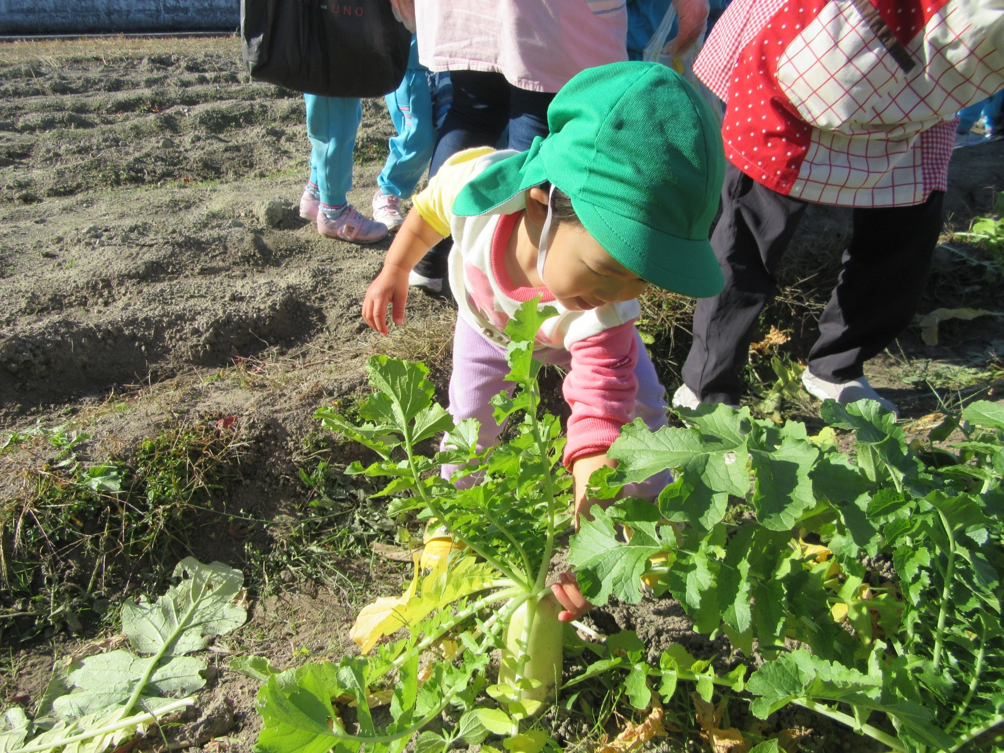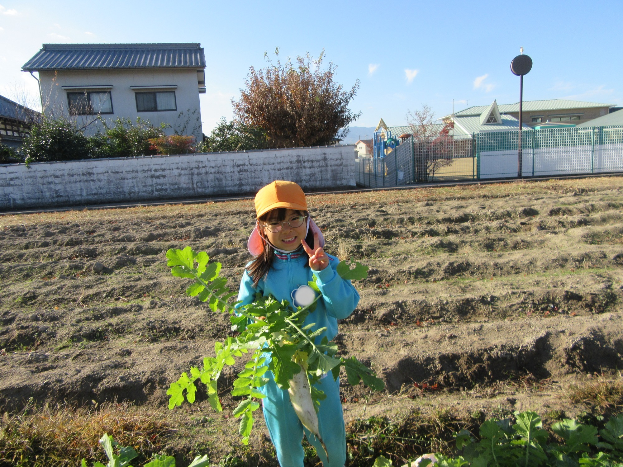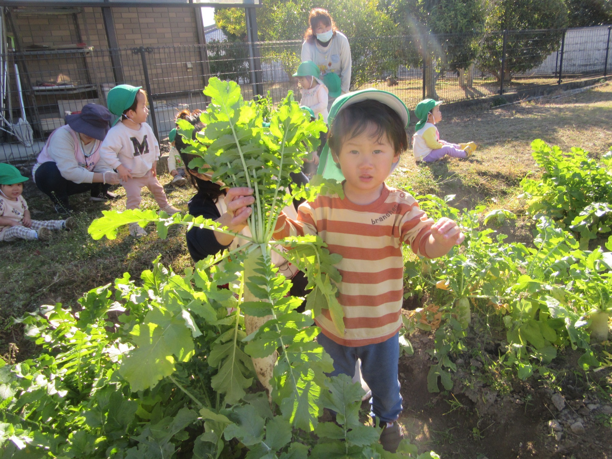 幼稚園のちびっこ農園で、大根を収穫しました。少し小さいのもありましたが、美味しそうな大根です!何の料理になったかな?