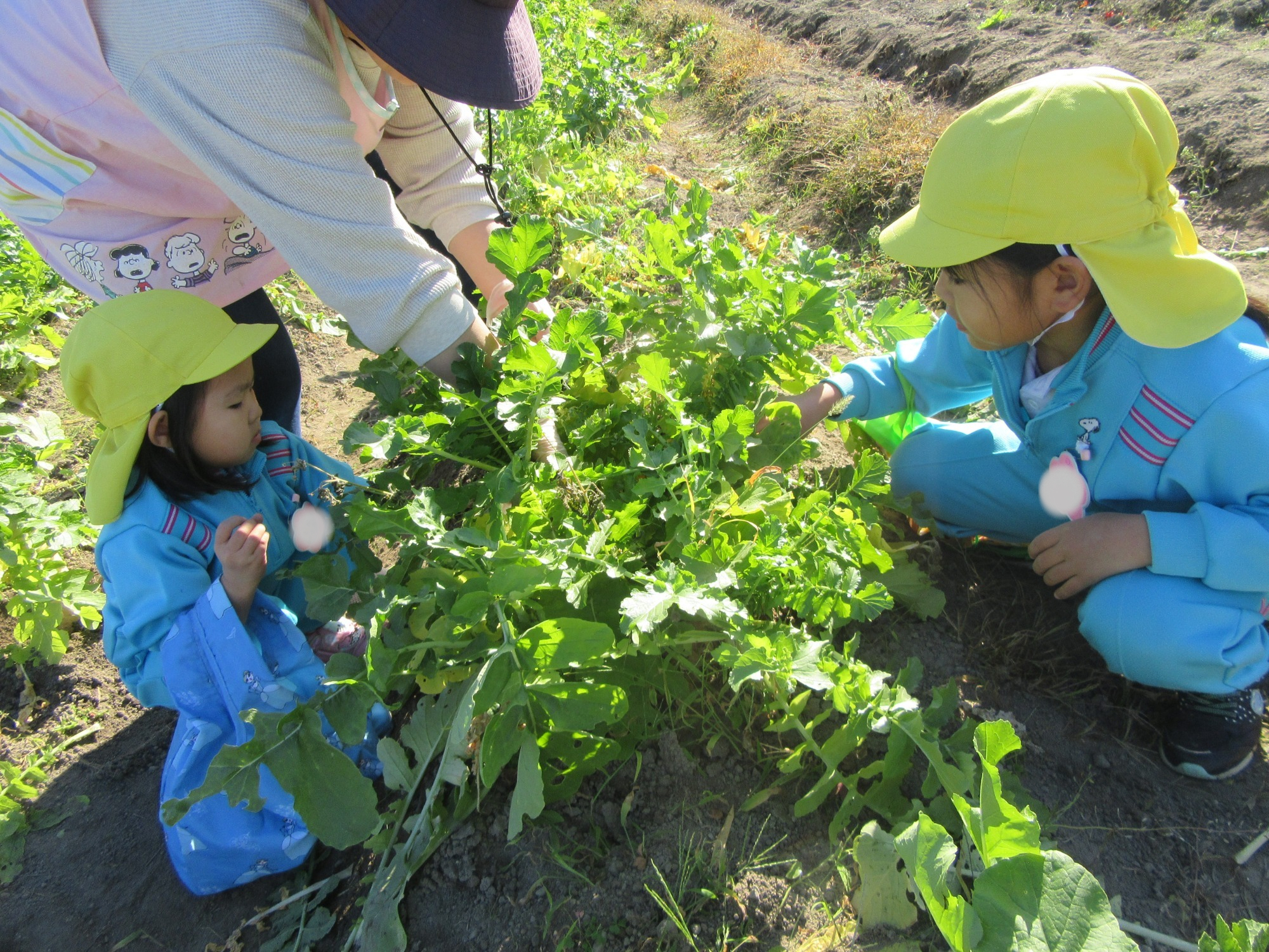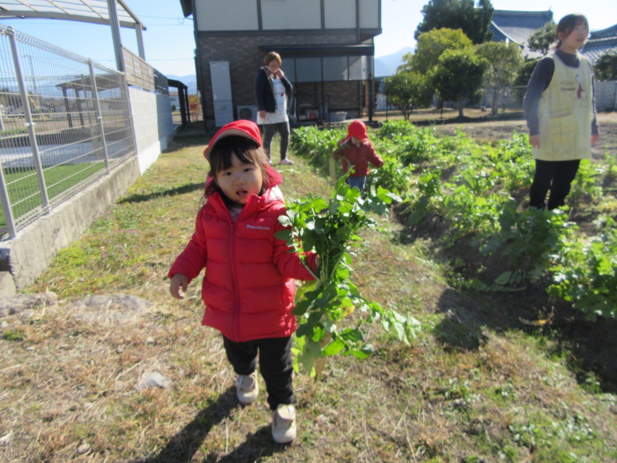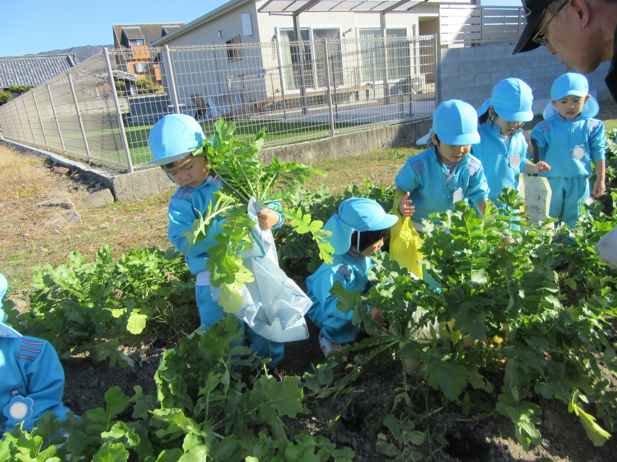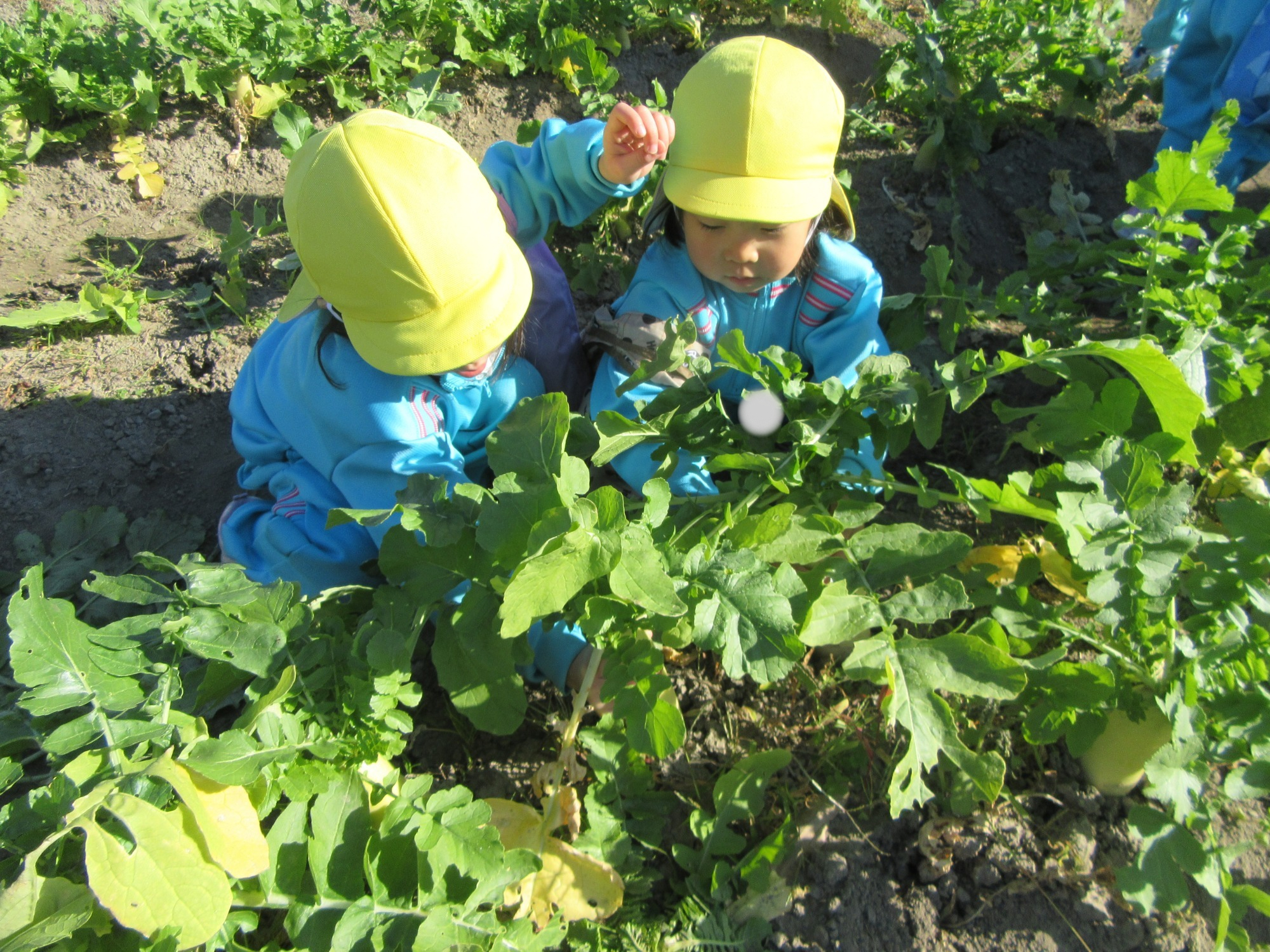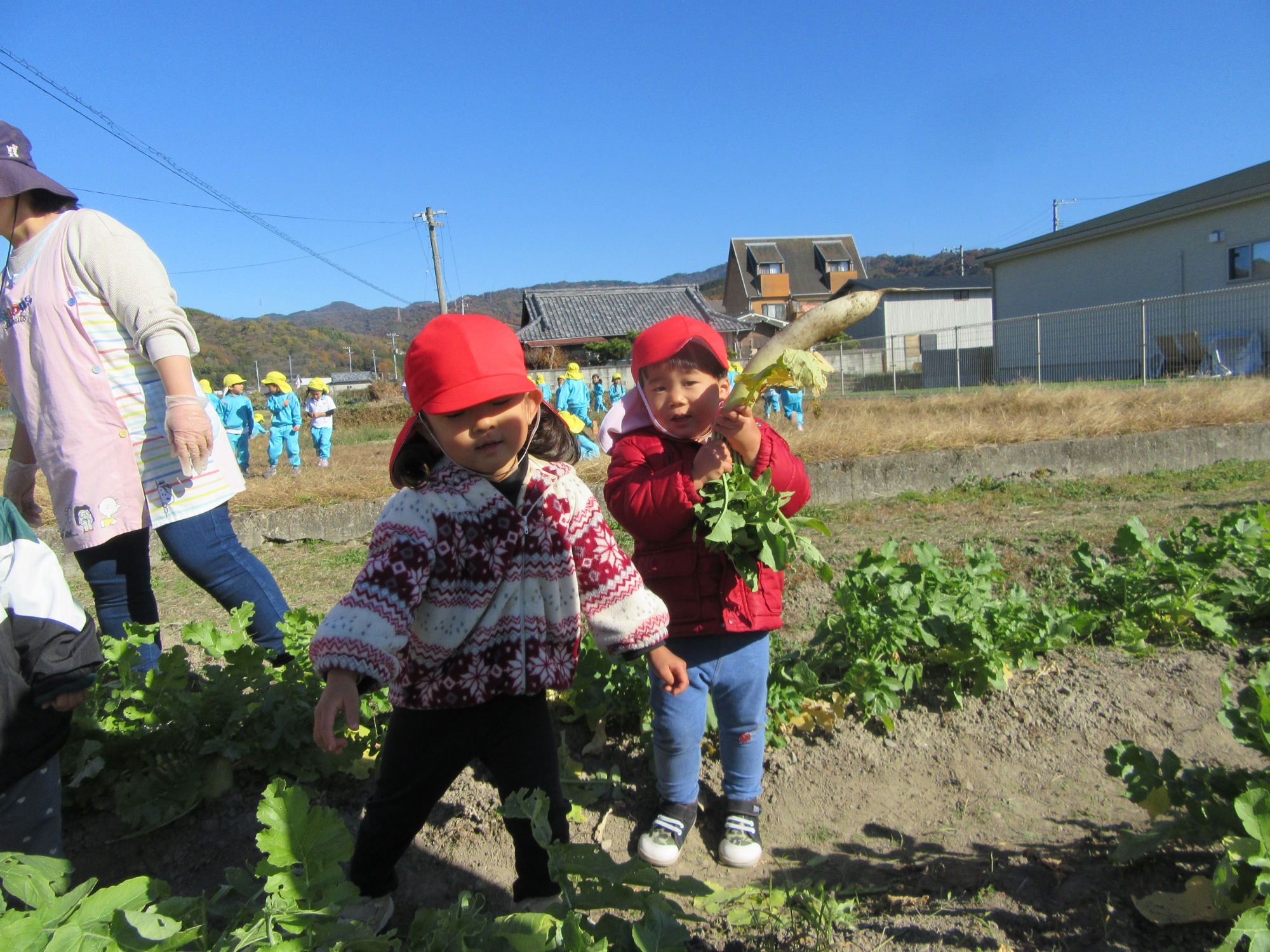幼稚園のちびっこ農園で、大根を収穫しました。少し小さいのもありましたが、美味しそうな大根です!何の料理になったかな?