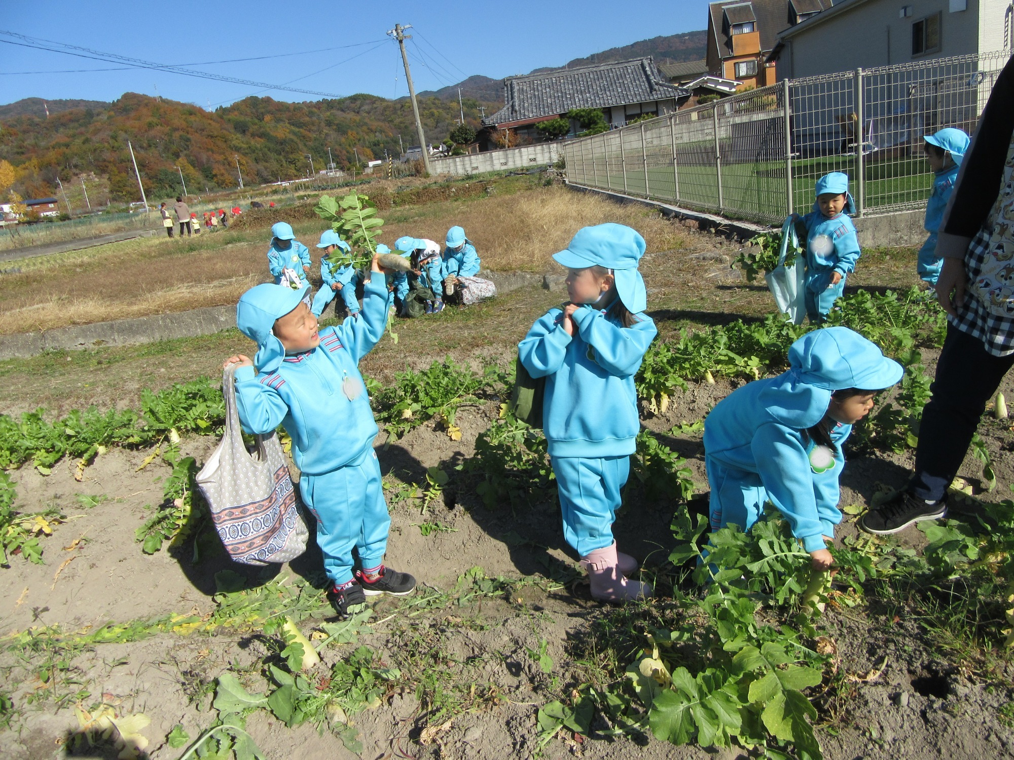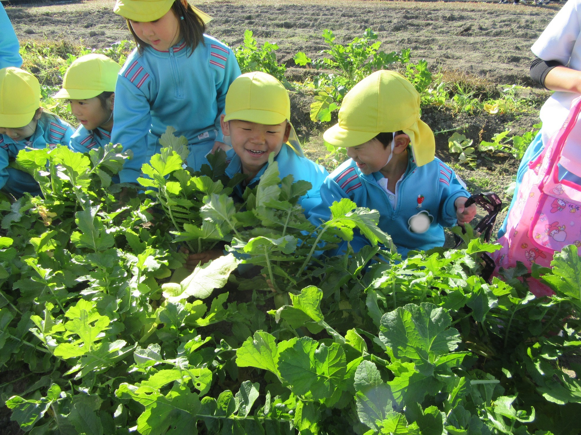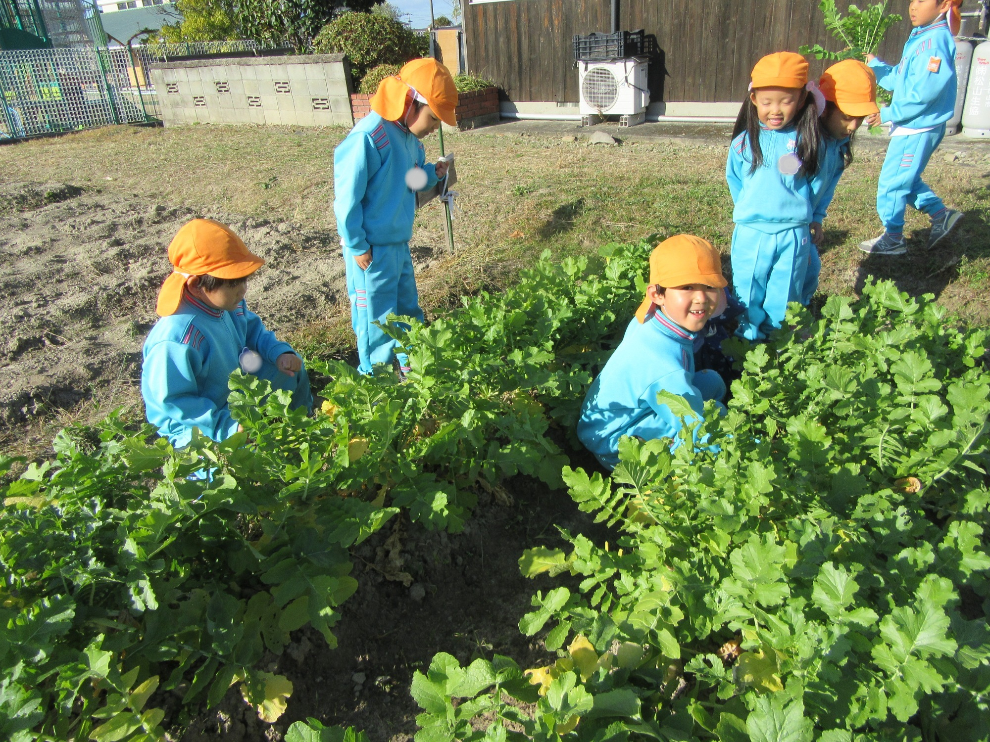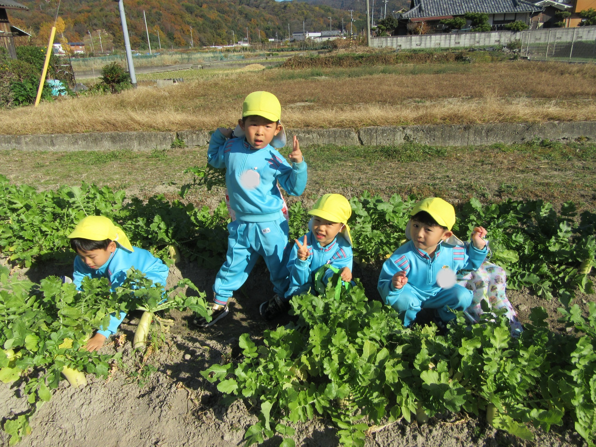 幼稚園のちびっこ農園で、大根を収穫しました。少し小さいのもありましたが、美味しそうな大根です!何の料理になったかな?