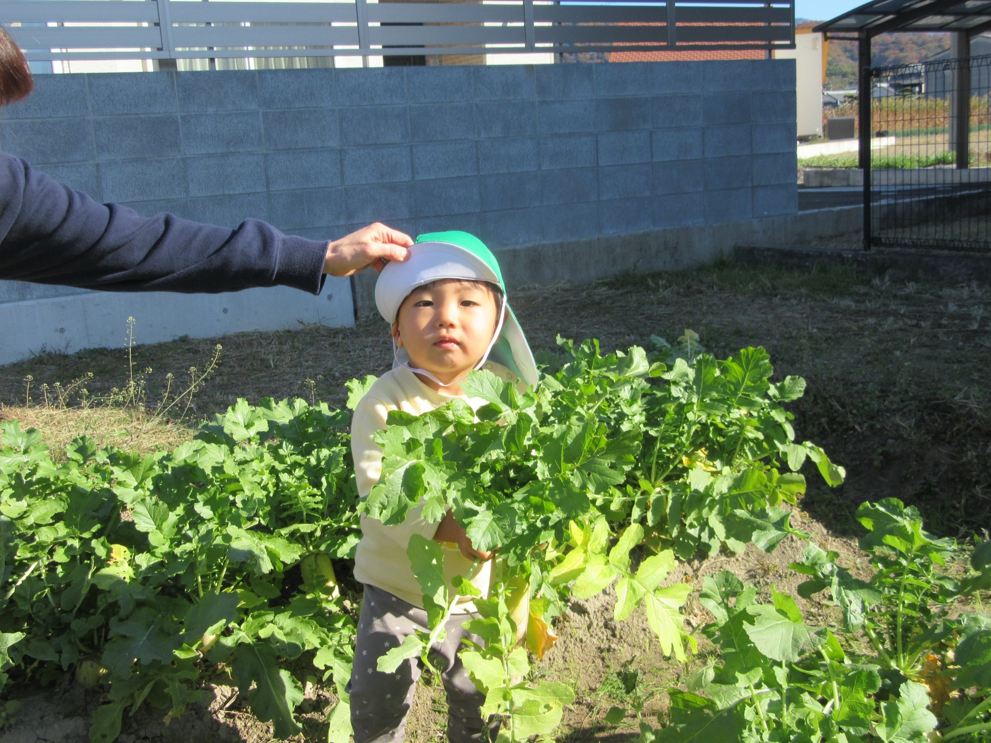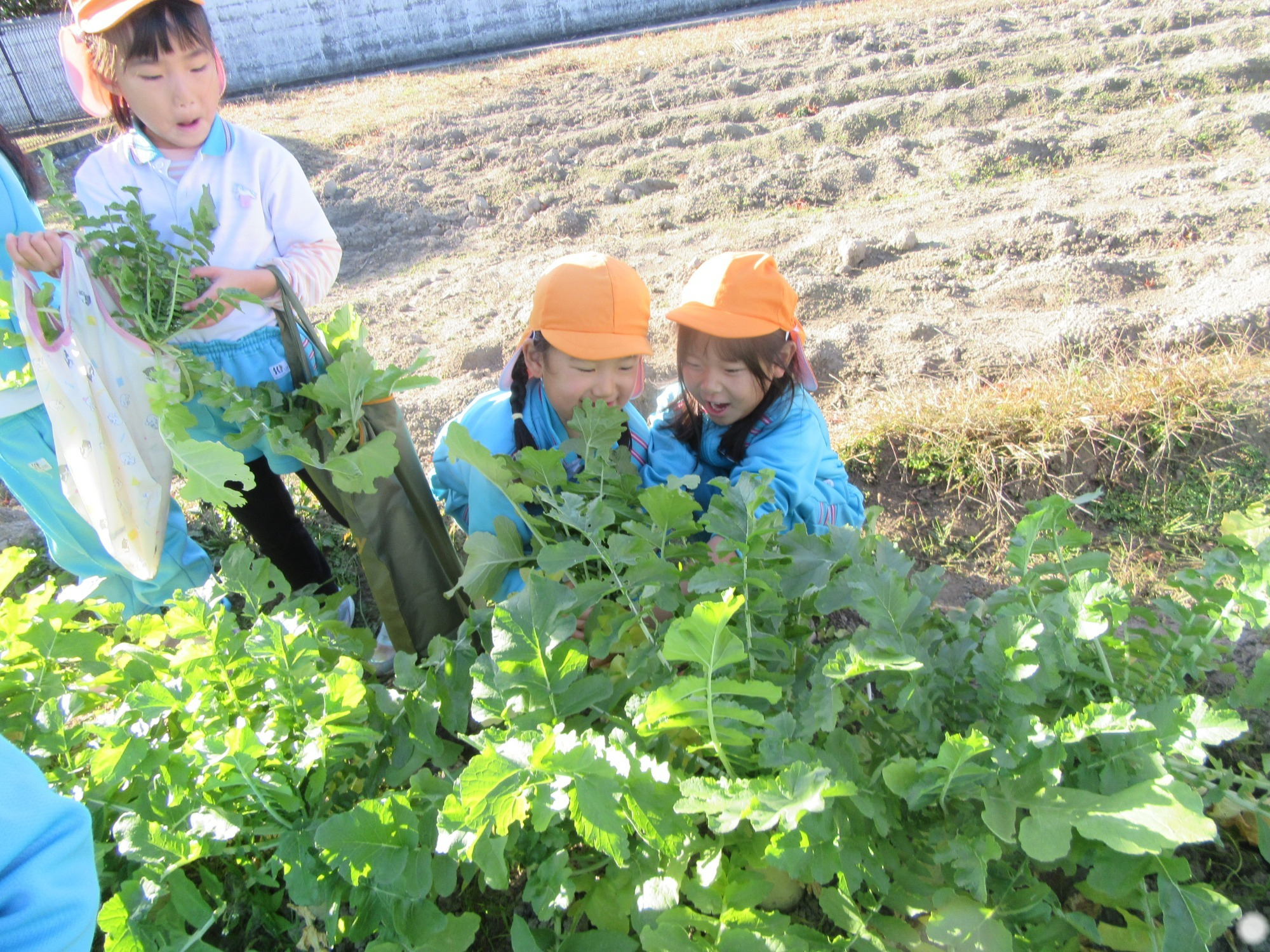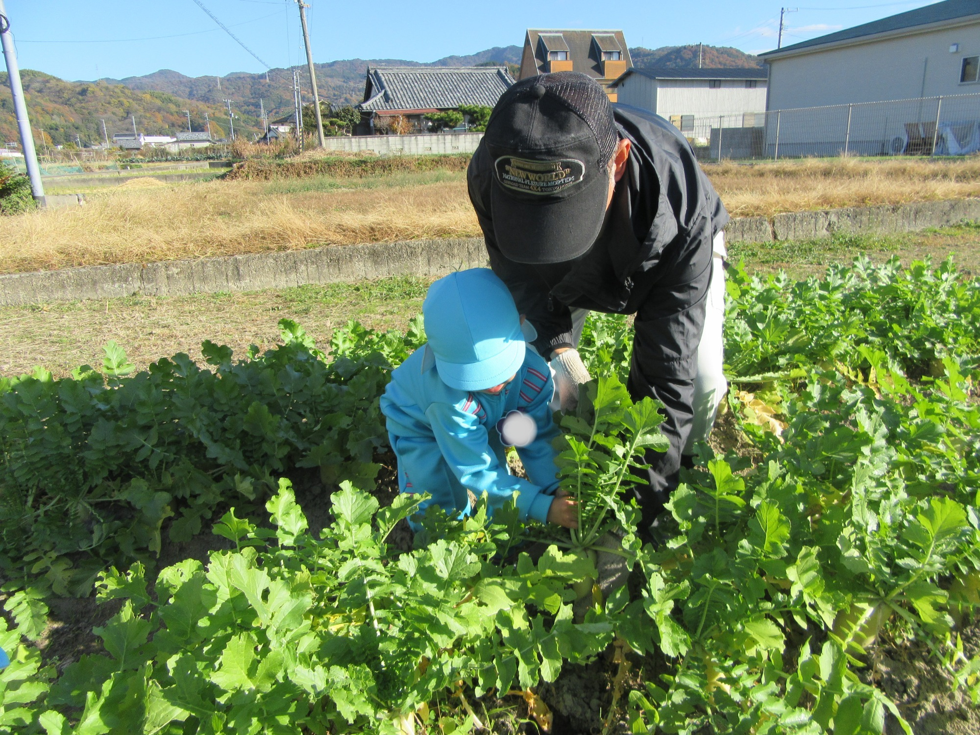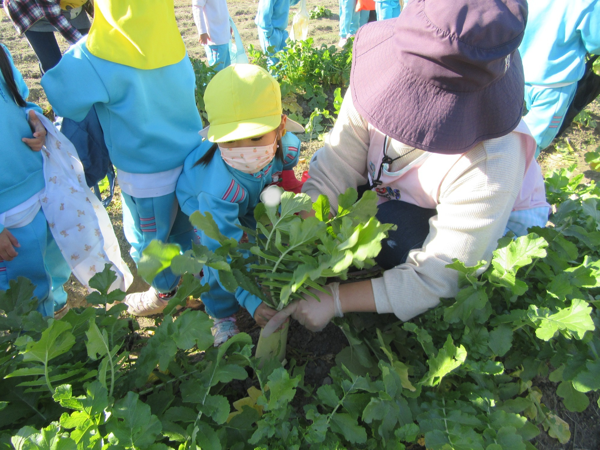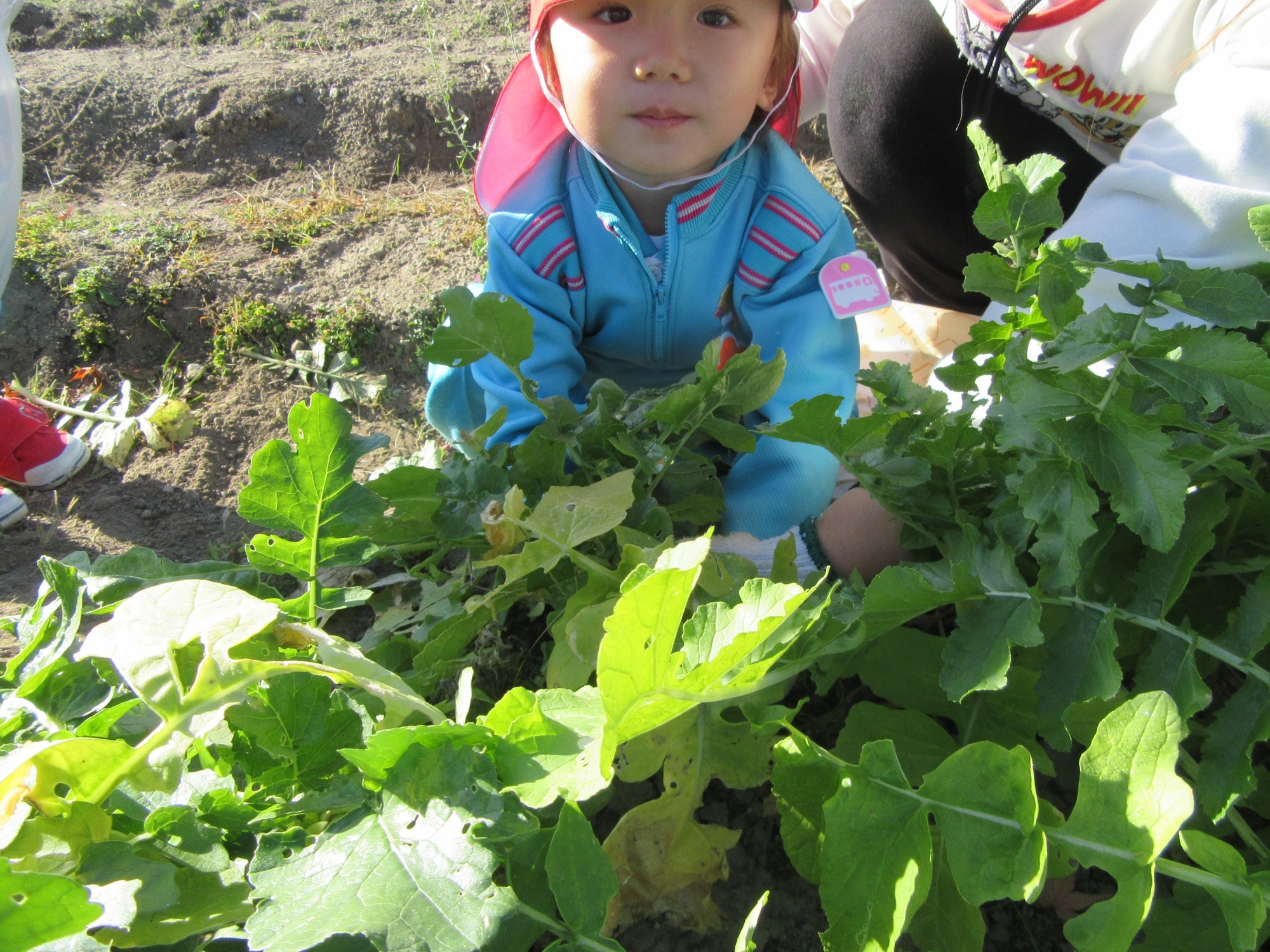 幼稚園のちびっこ農園で、大根を収穫しました。少し小さいのもありましたが、美味しそうな大根です!何の料理になったかな?
