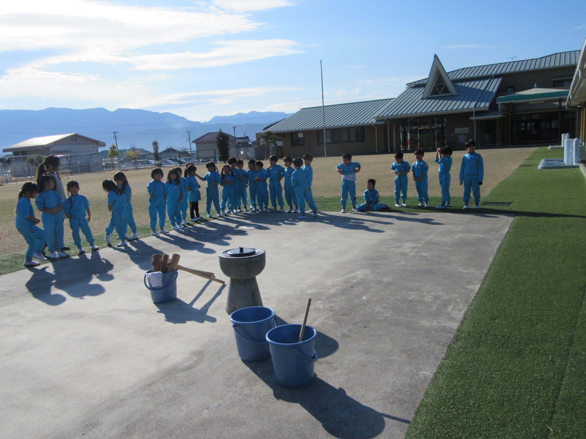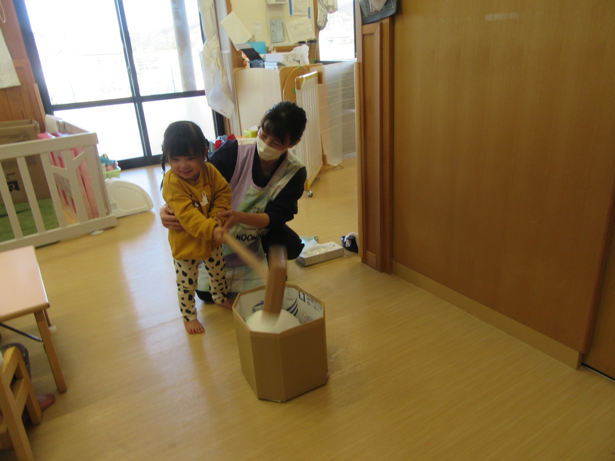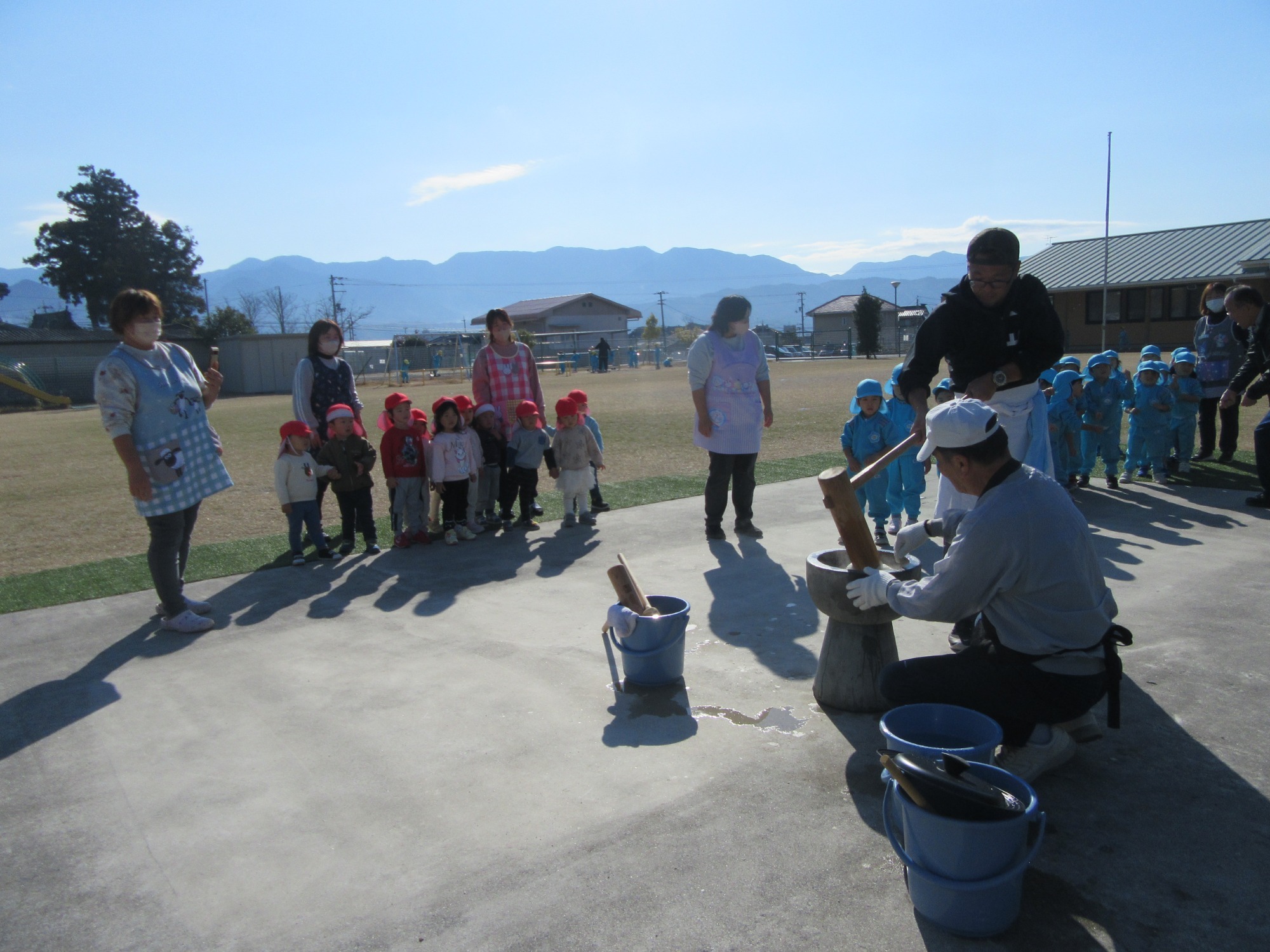 秋に稲刈りしたもち米を使って、お餅つきをしました!園児も先生も楽しみにしていました♪よいせ!よいせ!の掛け声でぺったんぺったんつきました!今年は一段と柔らかくて白くてとても美味しかったです☆美味しすぎてほっぺもとろーり落ちちゃいそう!