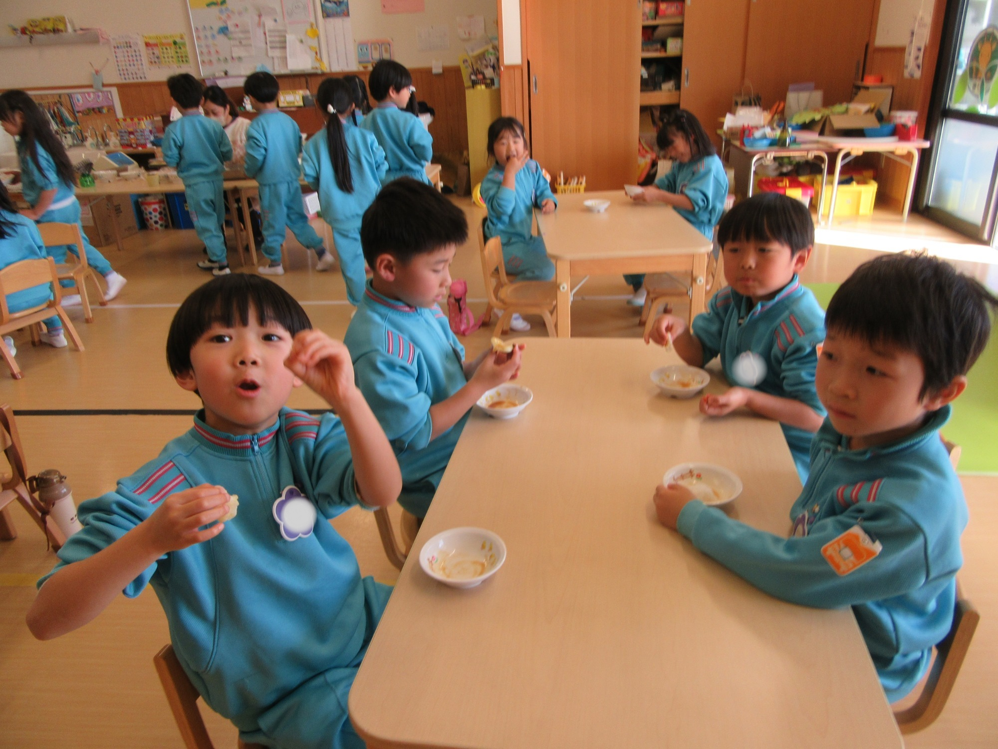 みんなで作るカレーの日です。年少さんは前日にじゃがいもを洗って、年中さんはじゃがいもとにんじんの皮むき、そして年長さんは切って、混ぜる工程をします。「おいしくなーれ」の魔法もかけて、味はバッチリ!!とーっても美味しいカレーの出来上がりです♪美味しいお顔、たくさんいただきました☆