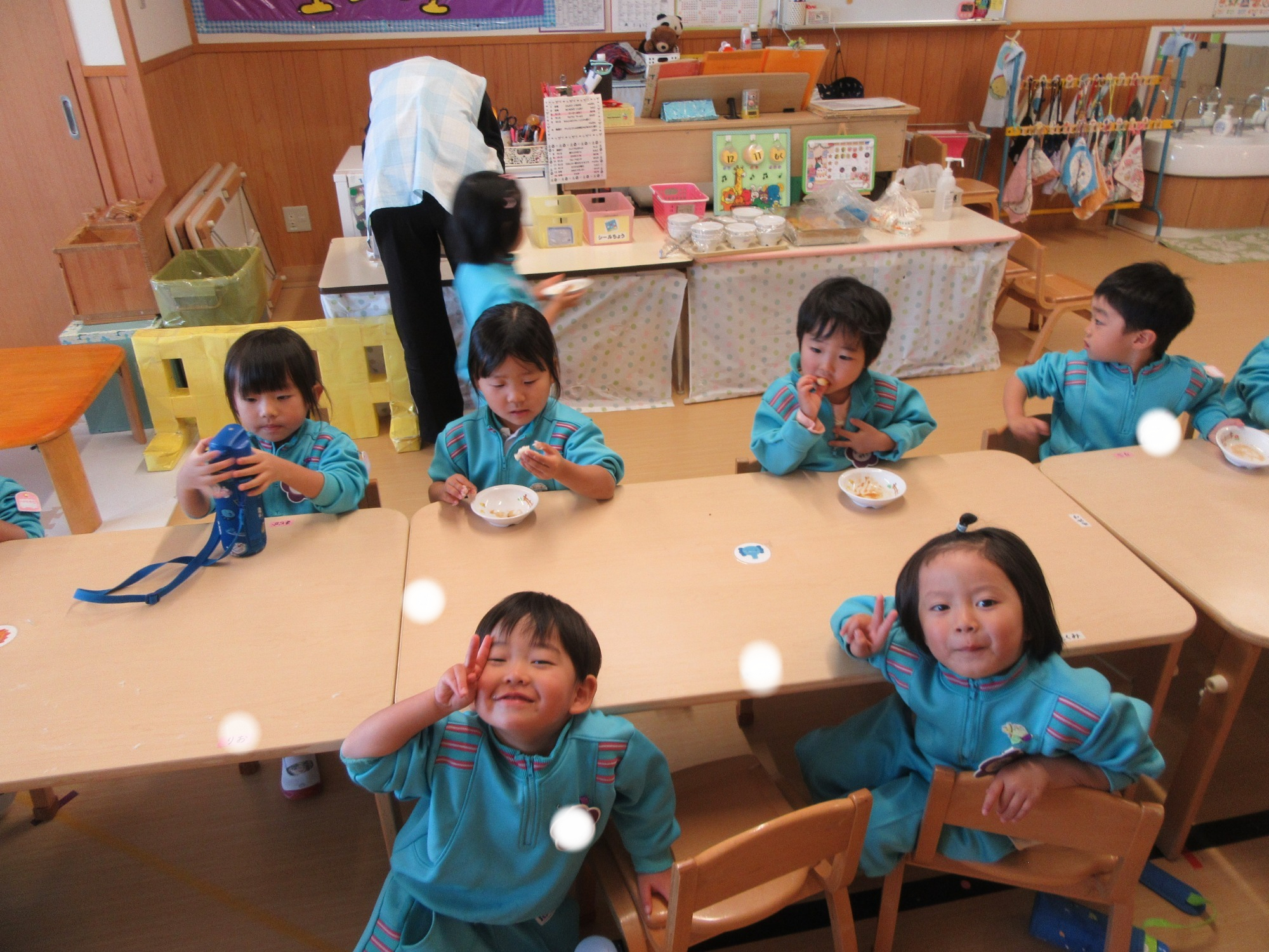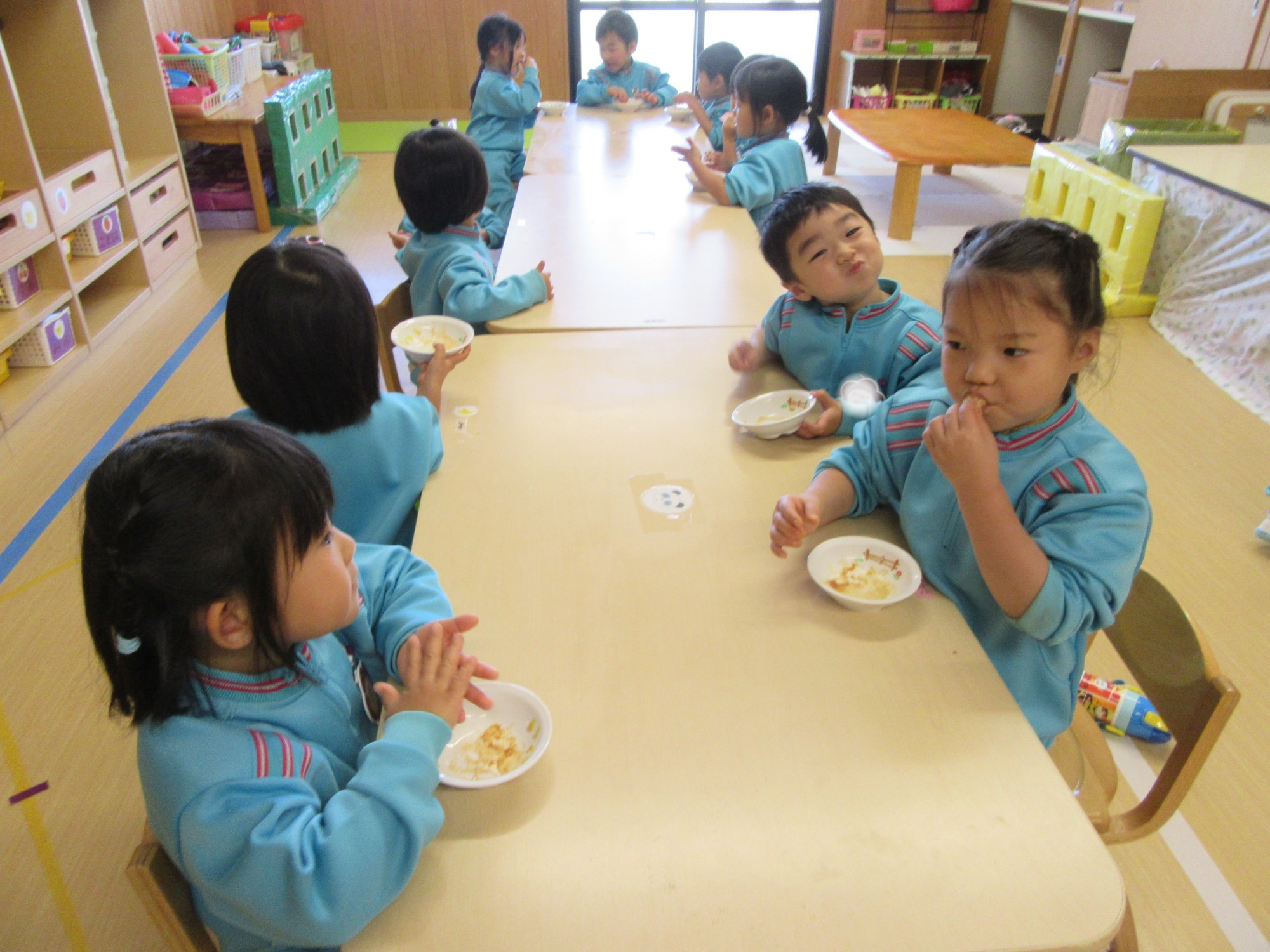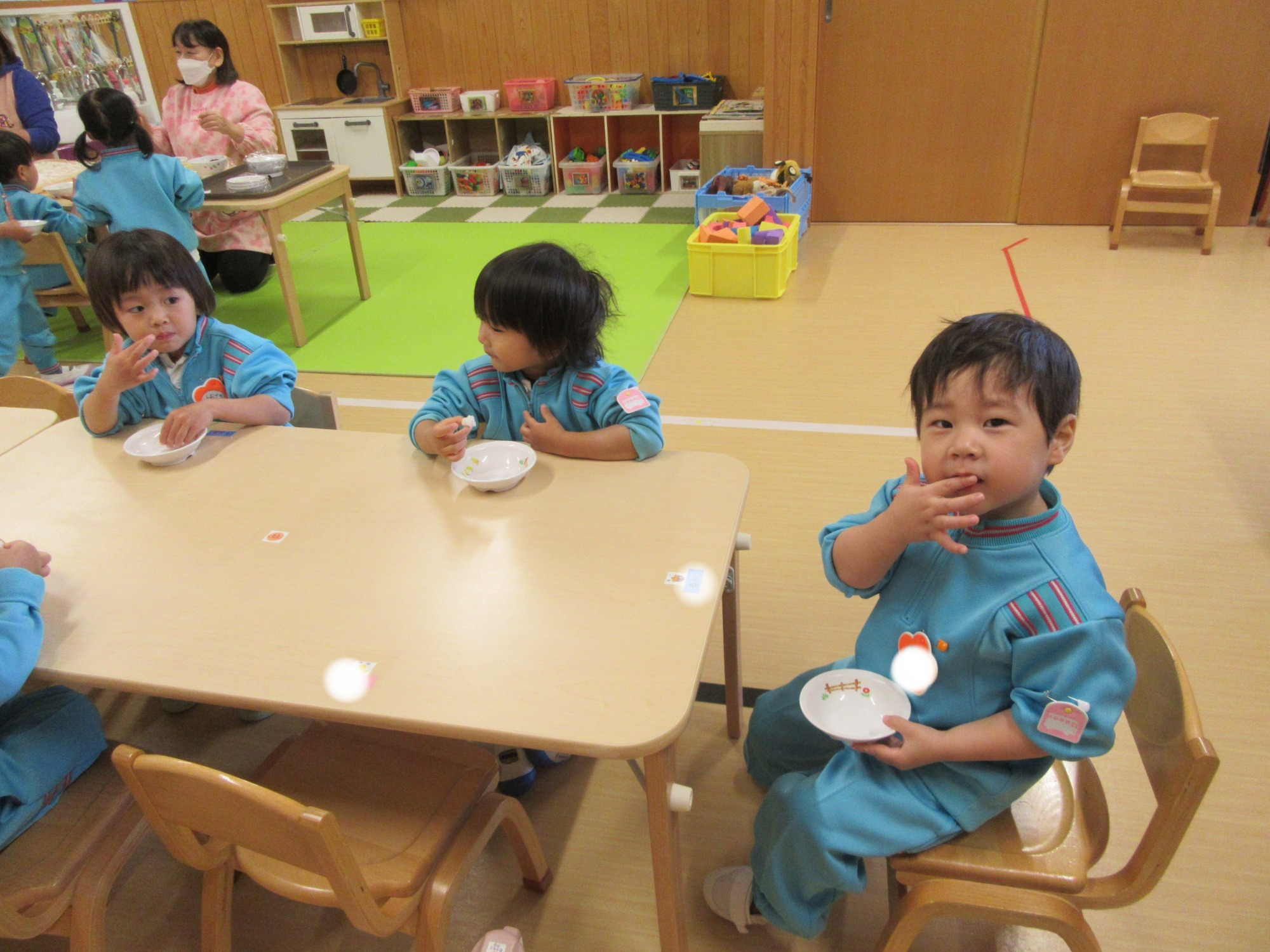 この日はとーってもいいお天気でした🌞しかも給食はカレー!となると、お外で食べるしかない!ということで、きりん組とぞう組さんが一緒にブルーシートを敷いてランチタイム!美味しそうだし、気持ちよさそうだし、楽しそうだし、羨ましい!!