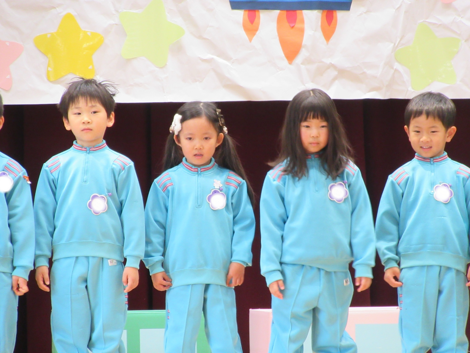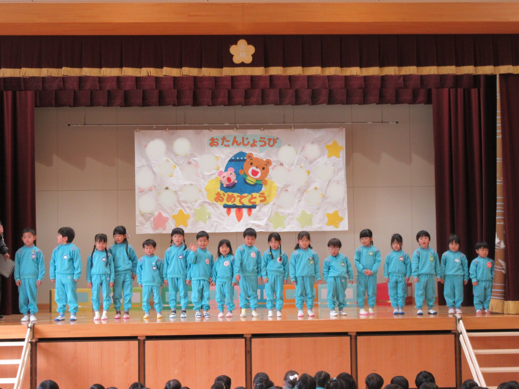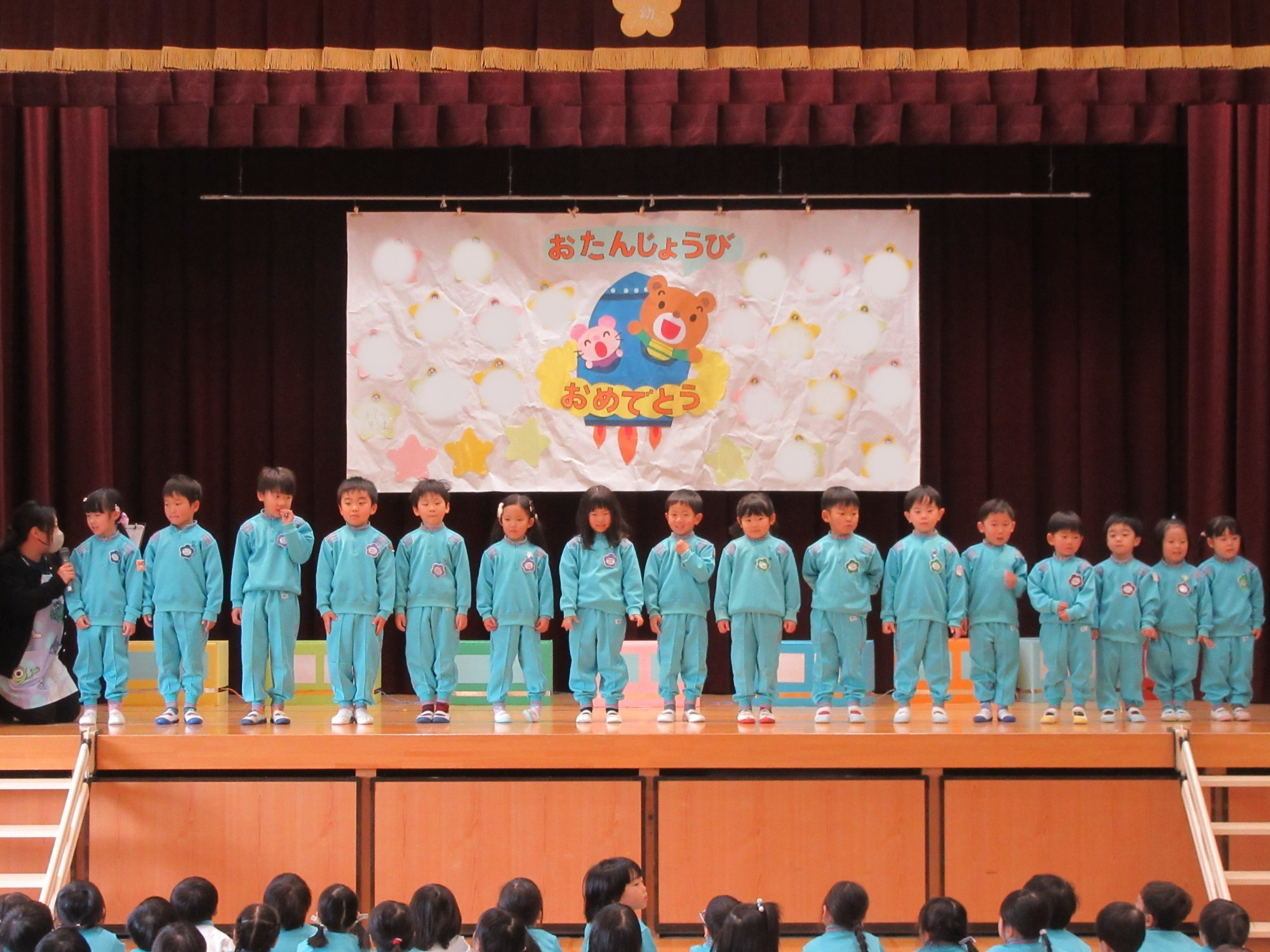 今日は5月生まれさんの誕生会でした。4月生まれのぱんだ組さんもいます。いつも元気いっぱいのお友だちもステージの上では少し緊張しています。発表は全員上手にできました♪5月生まれさん、おめでとう☆