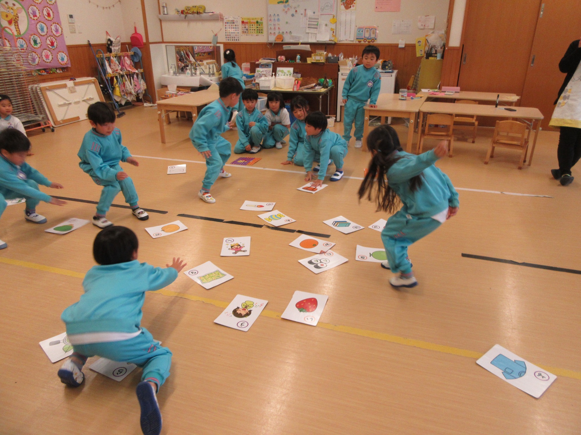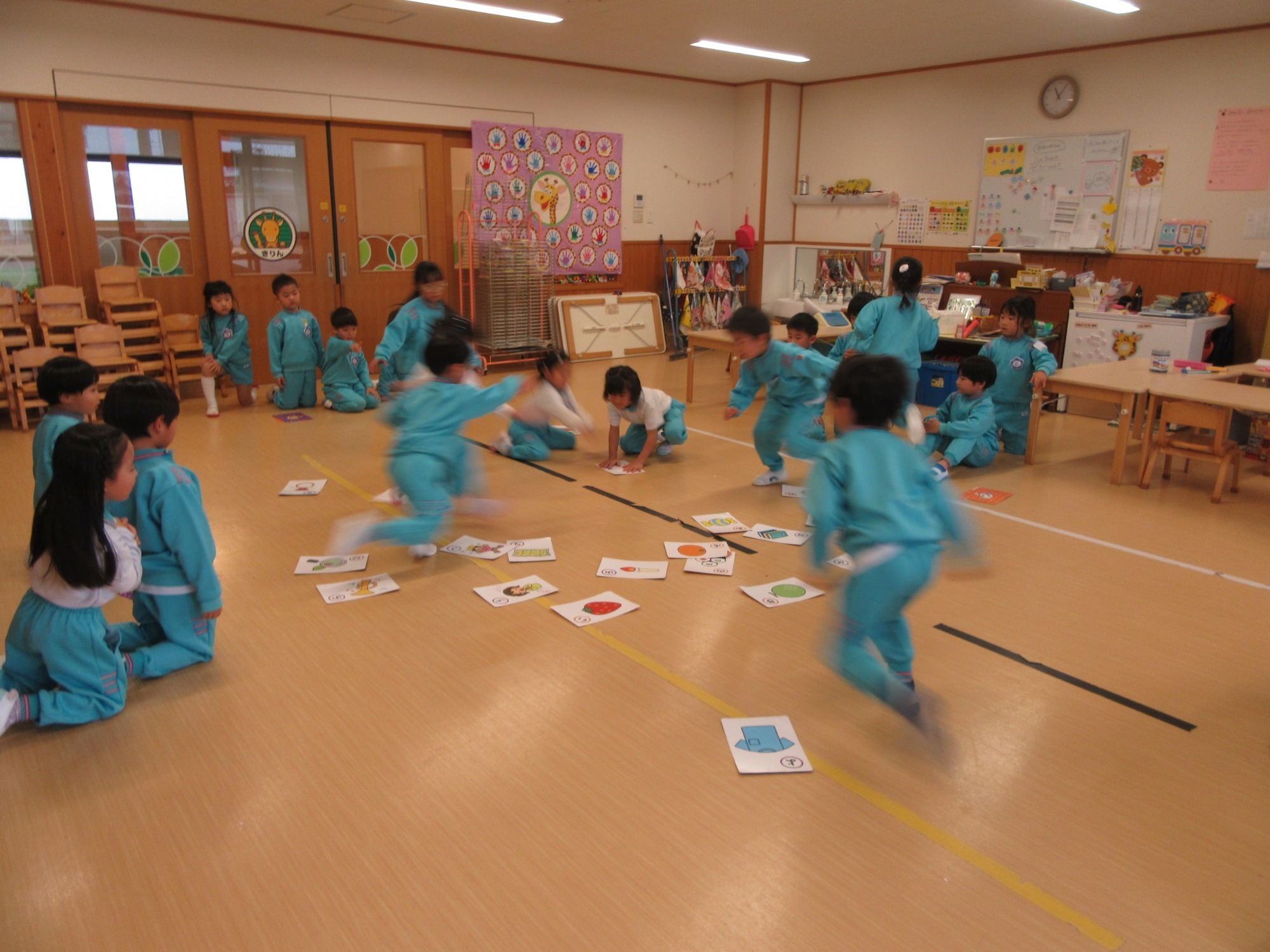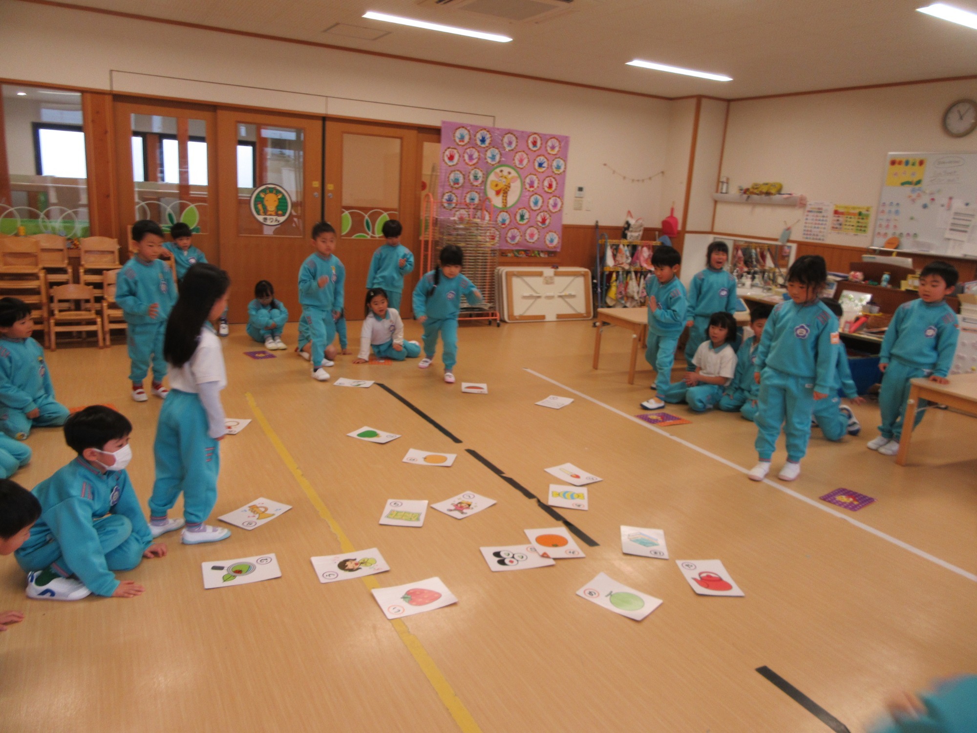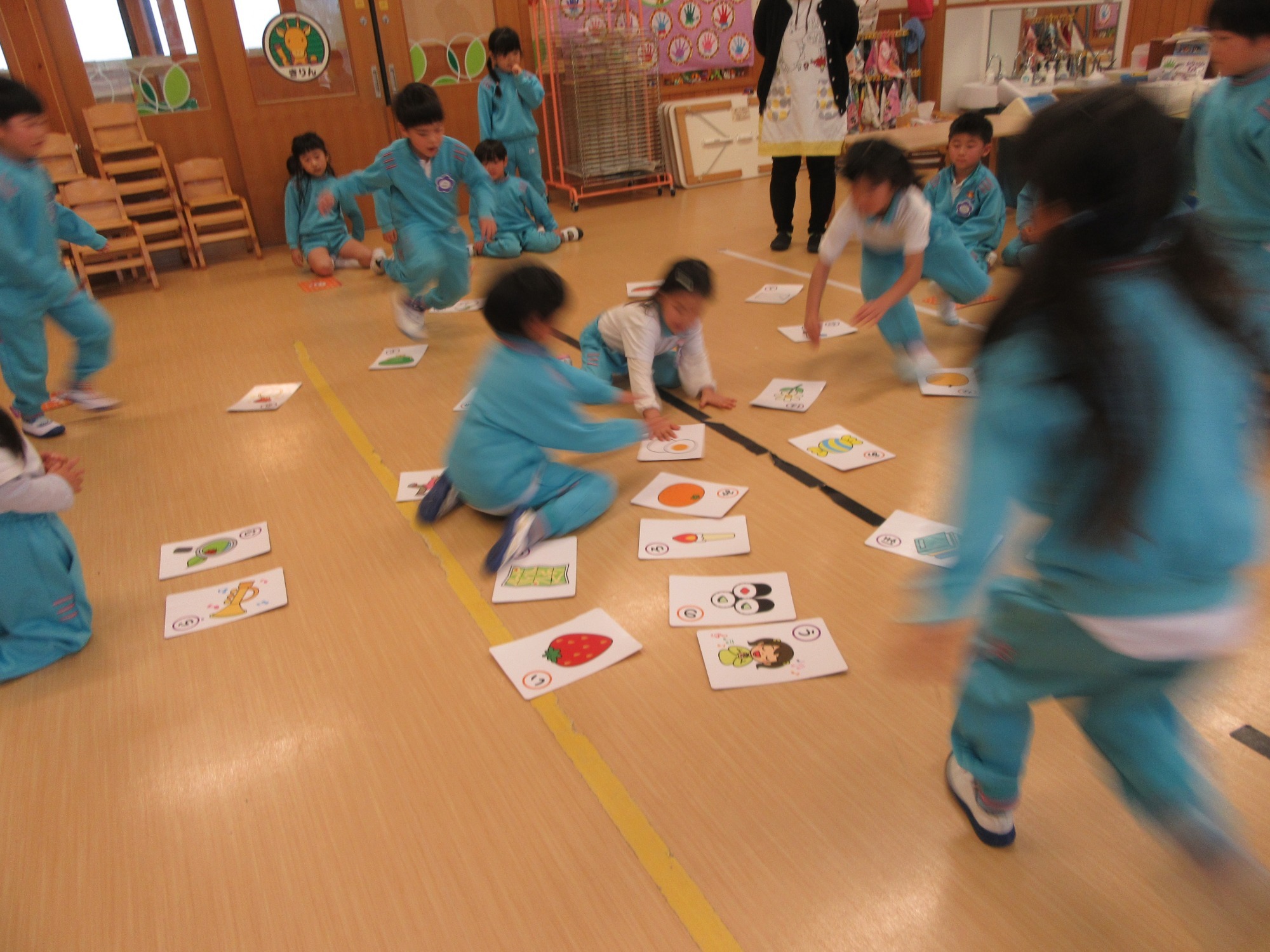 年長さんがかるたで遊んでいます。よく見て、よく聞いてね!ひらがなも覚えてるかな?