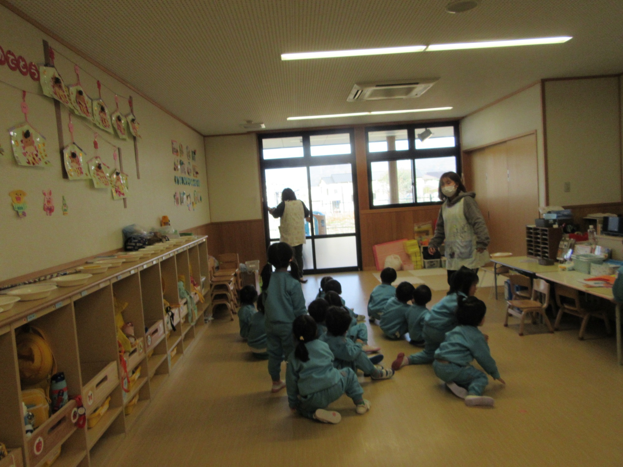 幼稚園に不審者が来たという想定で訓練を行いました。年少さんはびっくりした子もいたかもしれませんが、大切な訓練だと伝え、いざという時に先生のお話をきちんと聞いて行動するように指導しました。