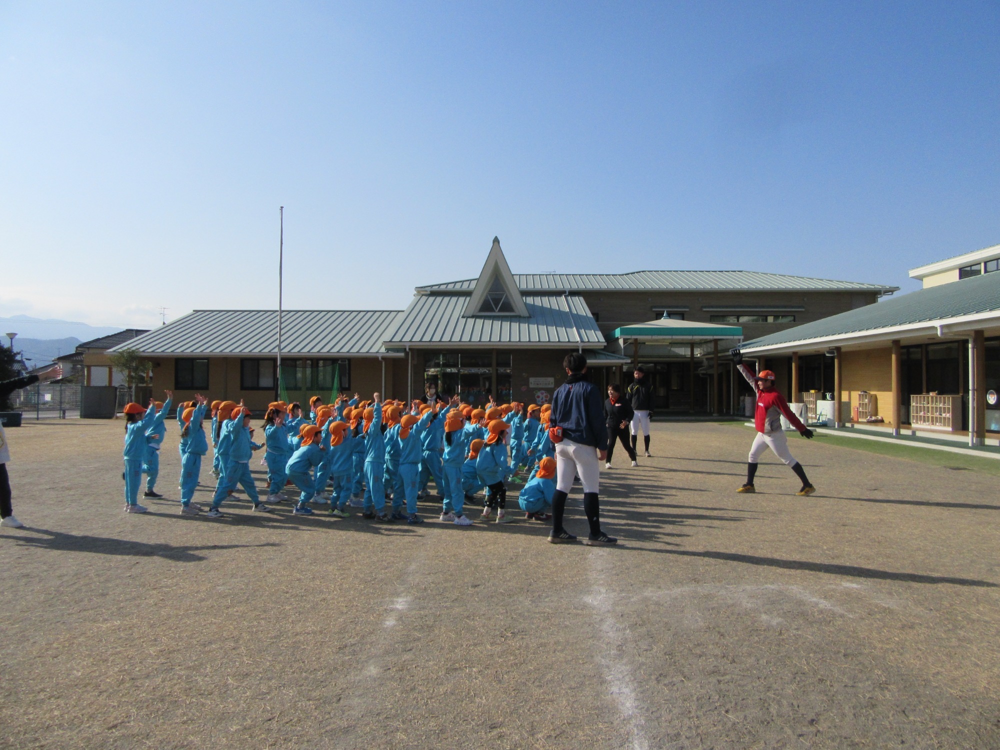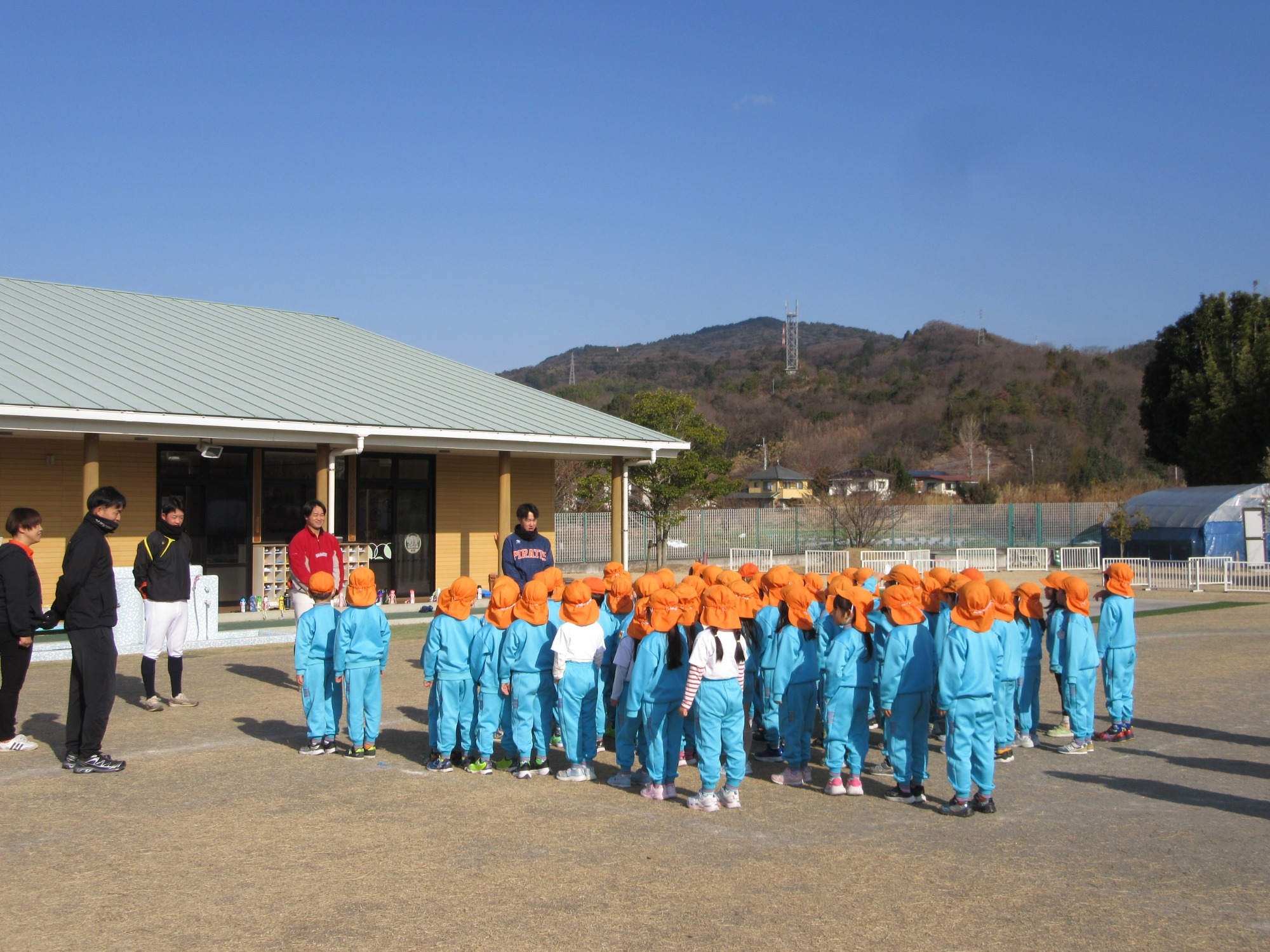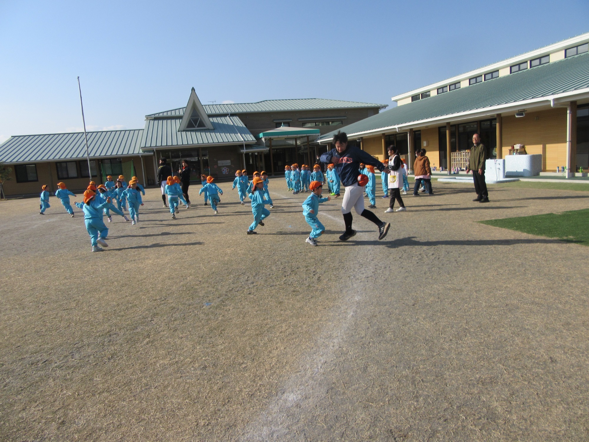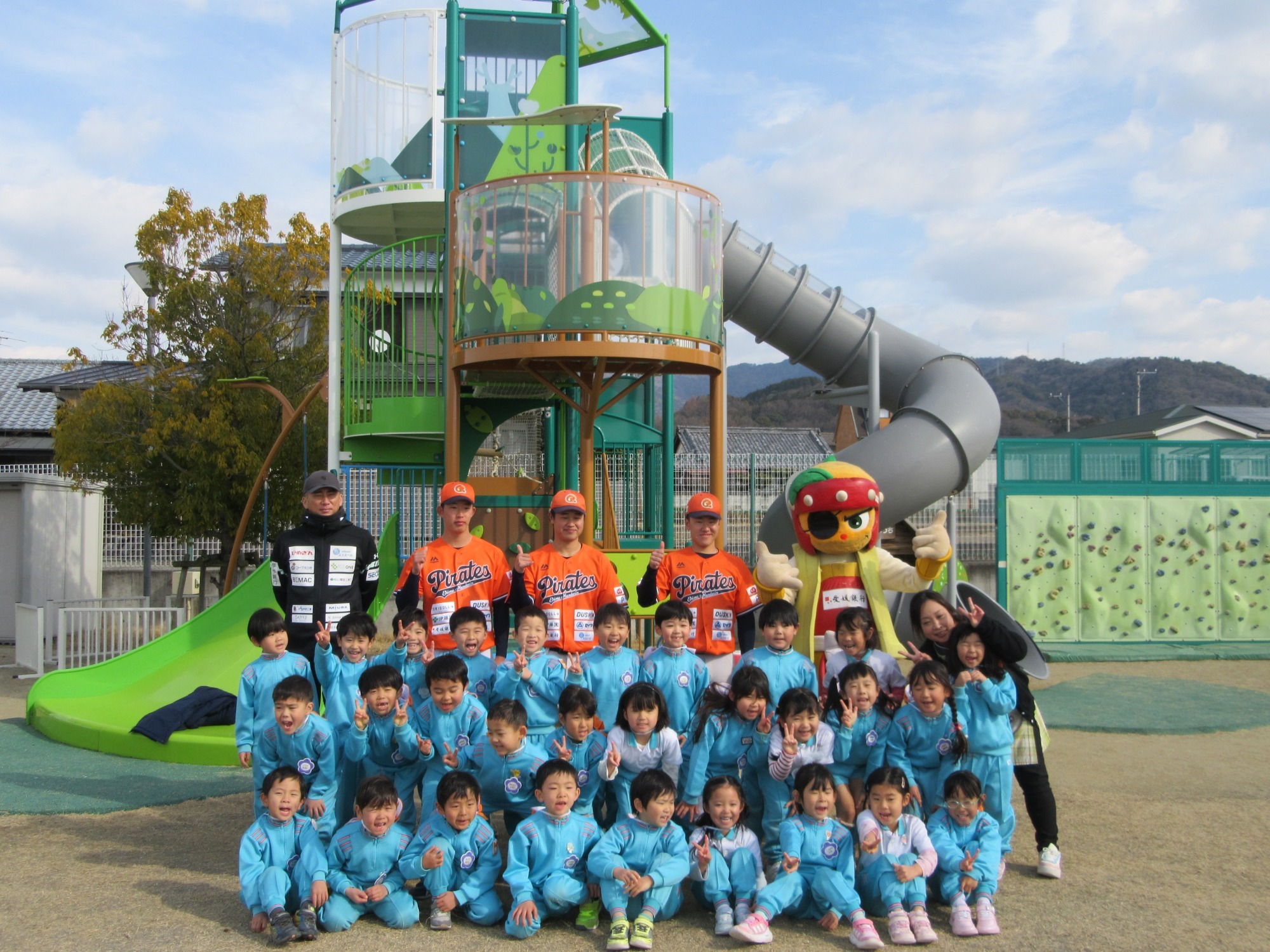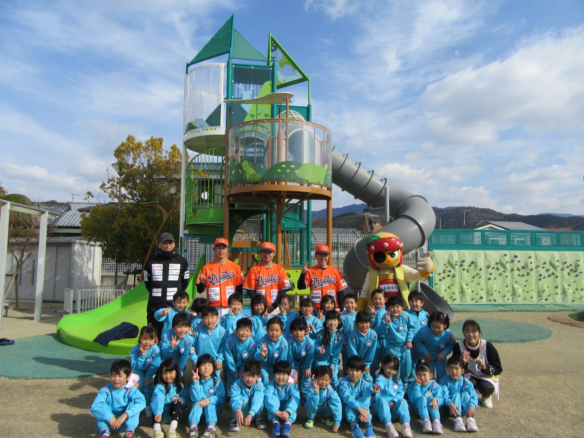 マンダリンパイレーツの監督と選手の方が年長さんを対象に野球教室を開いてくれました。はじめは選手のみなさん対子供たちで鬼ごっこです。選手の腰に挟んだキャップを取ったら勝ち!ですが、さすがは現役の選手。機敏な身のこなしで園児をかわし、なかなか取れませんでした!その後は、打つ、投げる、の基本を教えていただきました。みんな上手に楽しくできていましたね♪最後はもちろんマッピーが来てくれました!!年中、年少さんも出てきて、みんなで交流できました。マンダリンパイレーツの皆さんありがとうございました。3月に新シーズンが開幕します!みんなで応援しましょう!!
