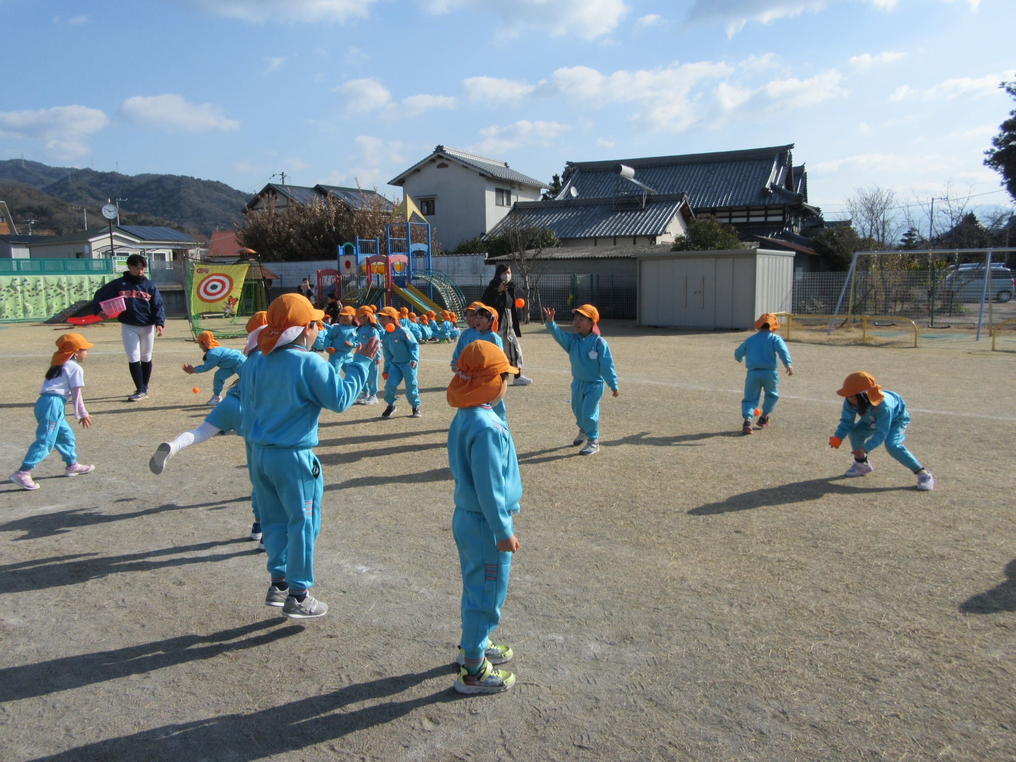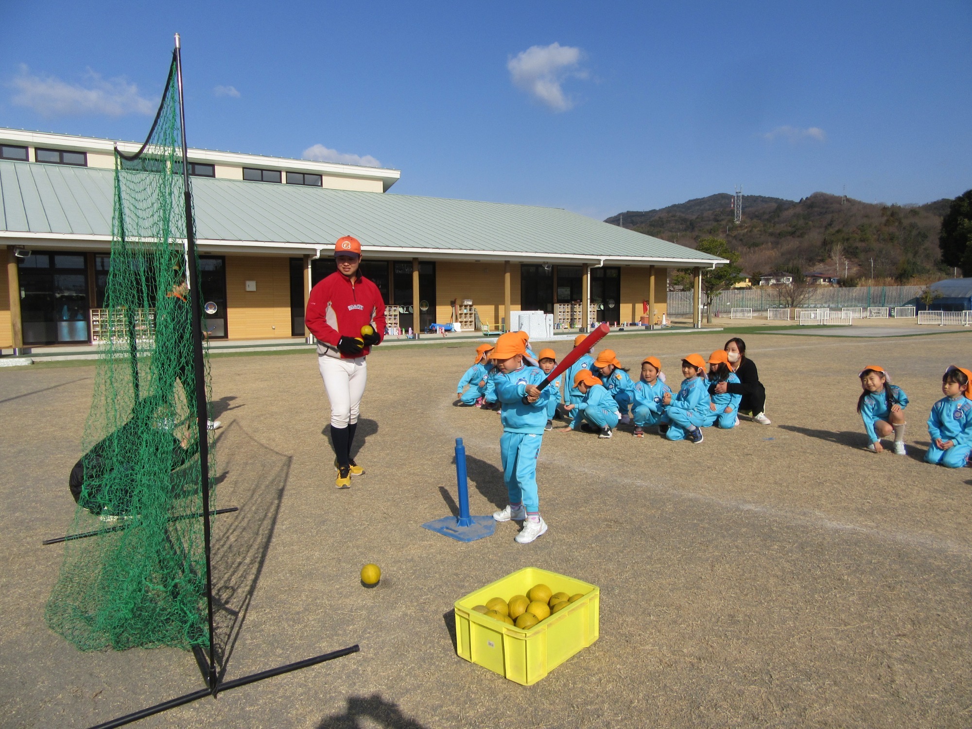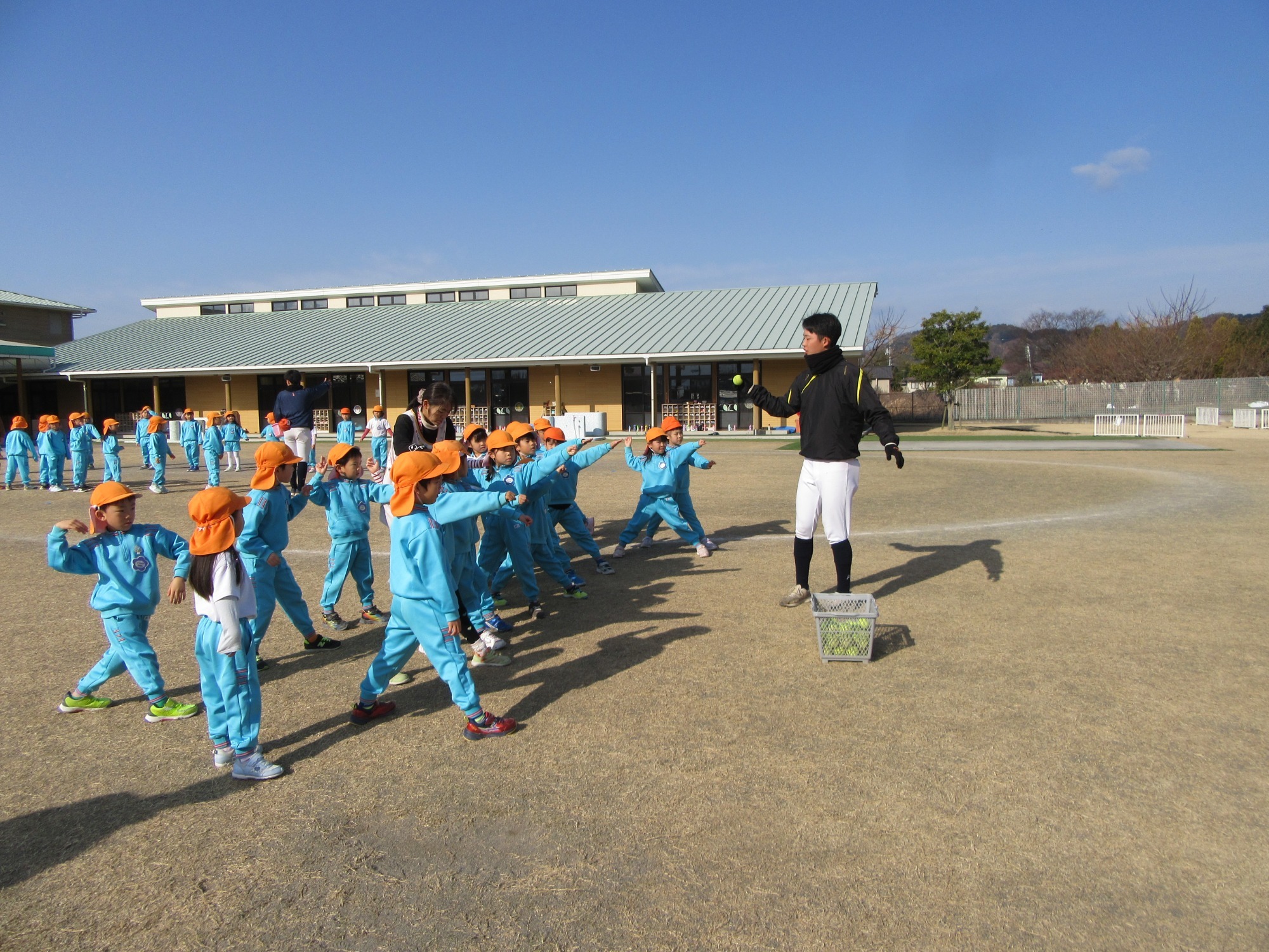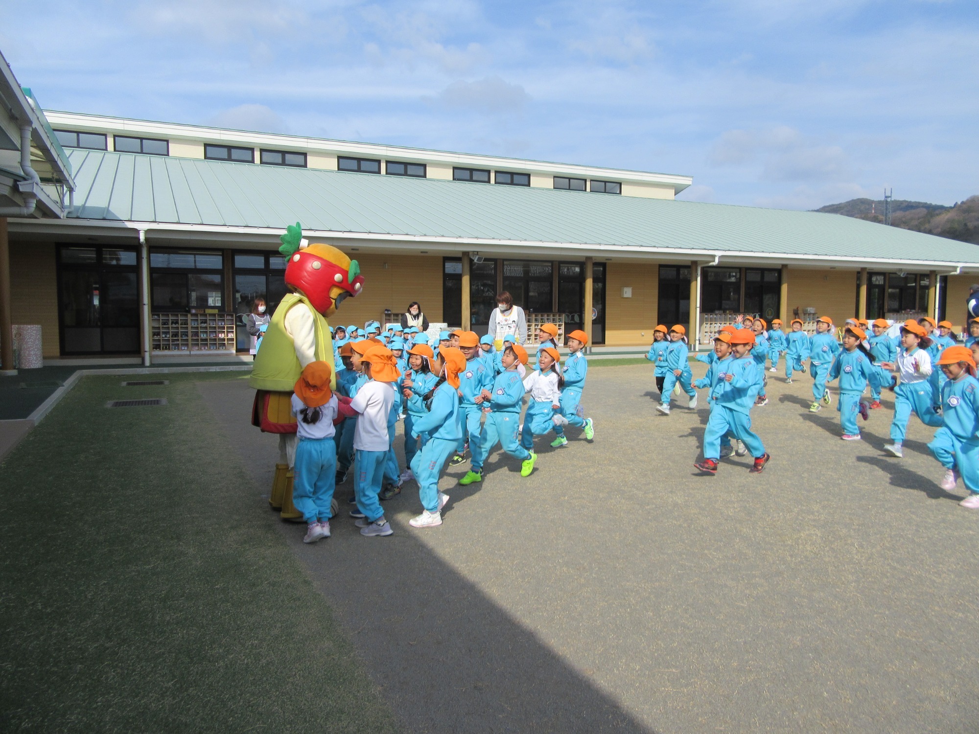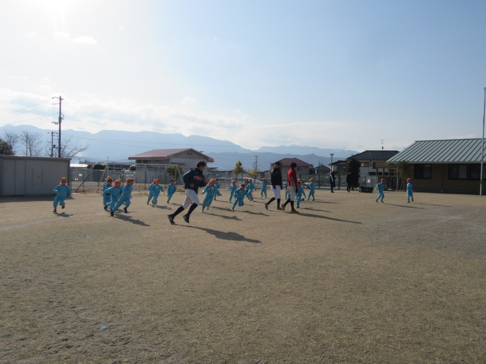 マンダリンパイレーツの監督と選手の方が年長さんを対象に野球教室を開いてくれました。はじめは選手のみなさん対子供たちで鬼ごっこです。選手の腰に挟んだキャップを取ったら勝ち!ですが、さすがは現役の選手。機敏な身のこなしで園児をかわし、なかなか取れませんでした!その後は、打つ、投げる、の基本を教えていただきました。みんな上手に楽しくできていましたね♪最後はもちろんマッピーが来てくれました!!年中、年少さんも出てきて、みんなで交流できました。マンダリンパイレーツの皆さんありがとうございました。3月に新シーズンが開幕します!みんなで応援しましょう!!