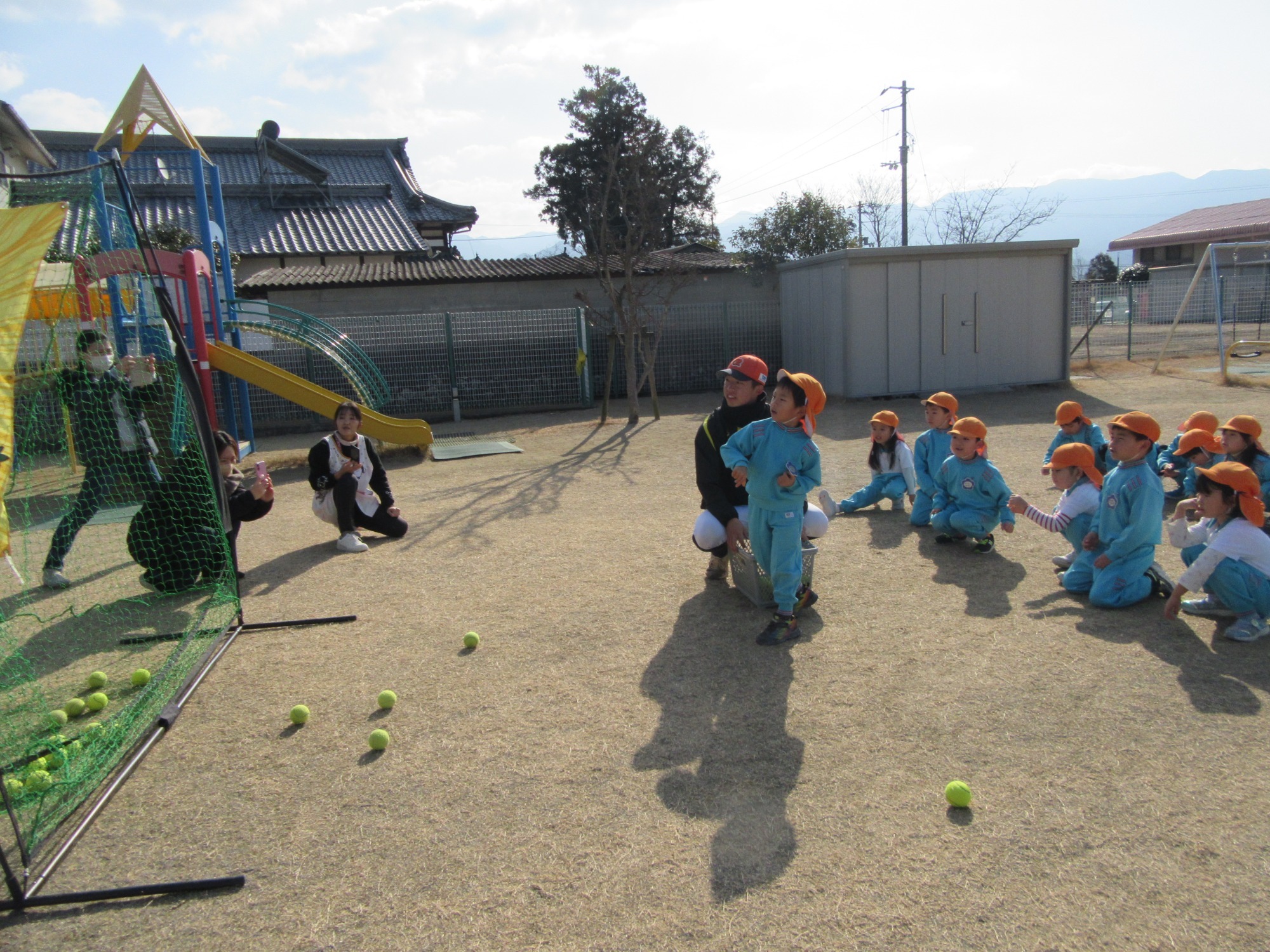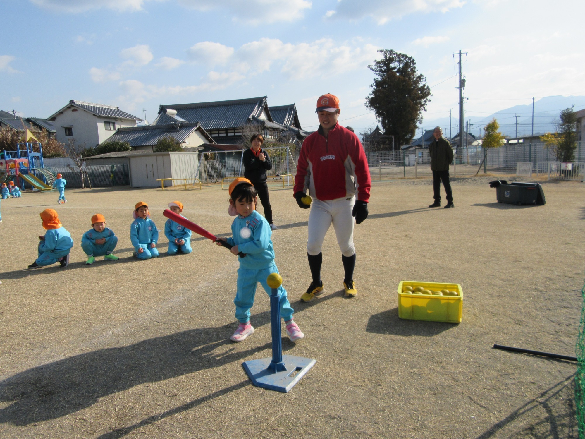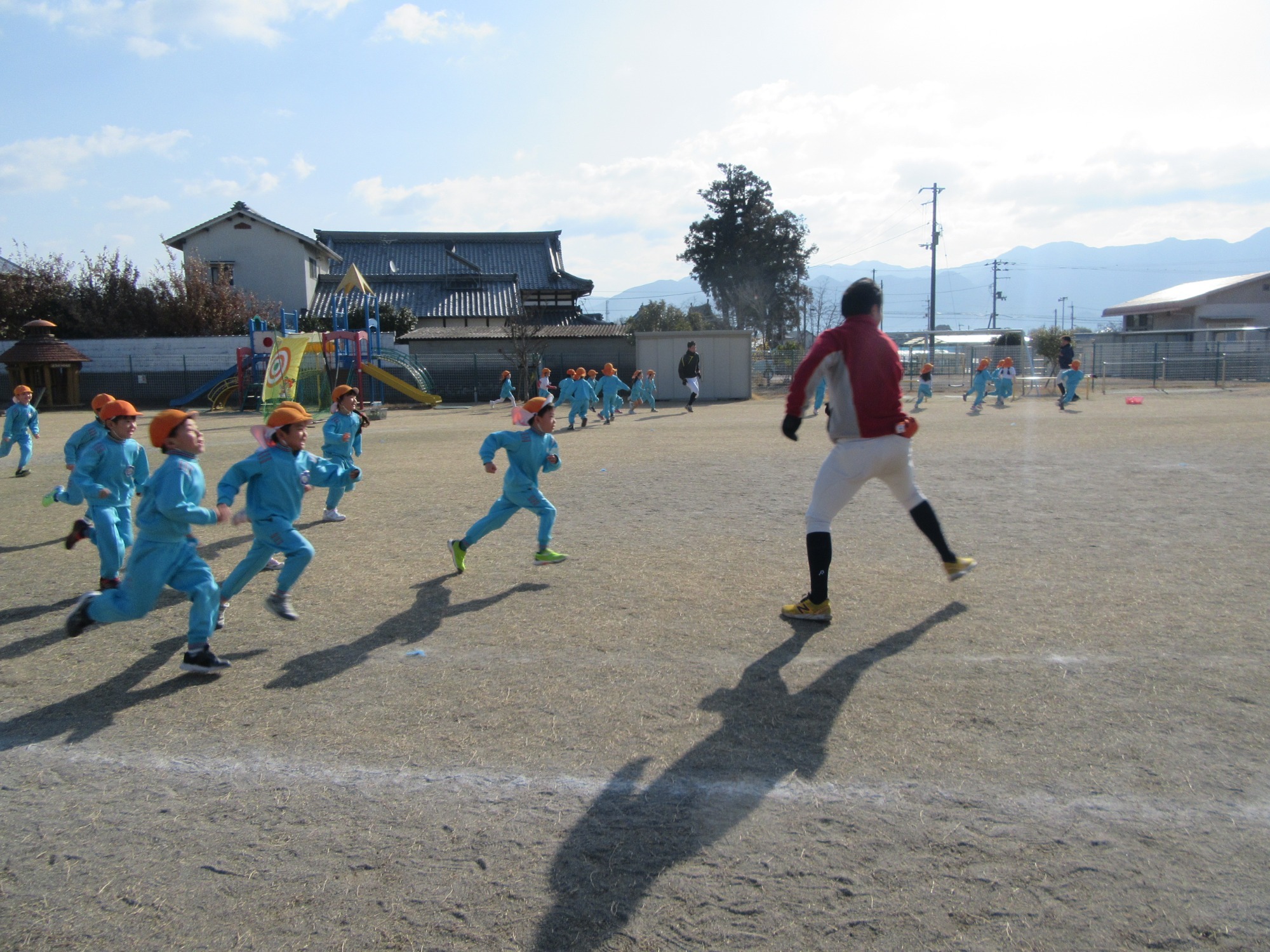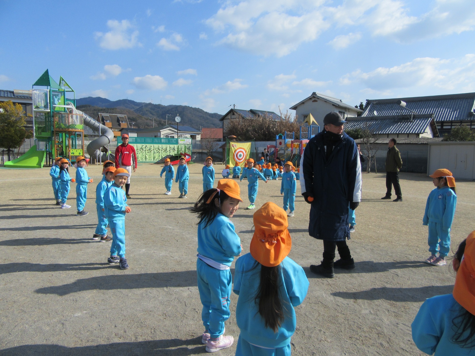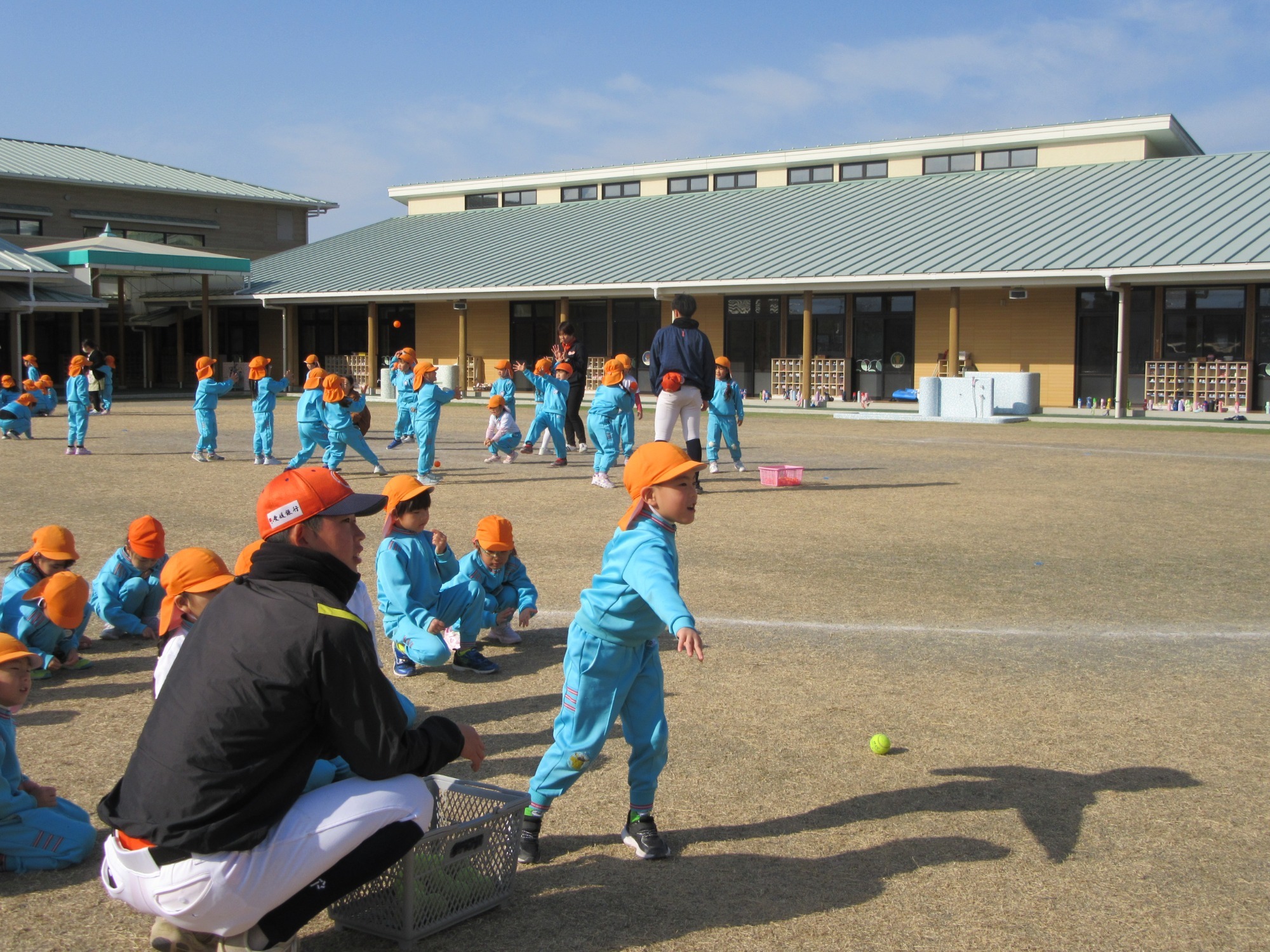 マンダリンパイレーツの監督と選手の方が年長さんを対象に野球教室を開いてくれました。はじめは選手のみなさん対子供たちで鬼ごっこです。選手の腰に挟んだキャップを取ったら勝ち!ですが、さすがは現役の選手。機敏な身のこなしで園児をかわし、なかなか取れませんでした!その後は、打つ、投げる、の基本を教えていただきました。みんな上手に楽しくできていましたね♪最後はもちろんマッピーが来てくれました!!年中、年少さんも出てきて、みんなで交流できました。マンダリンパイレーツの皆さんありがとうございました。3月に新シーズンが開幕します!みんなで応援しましょう!!