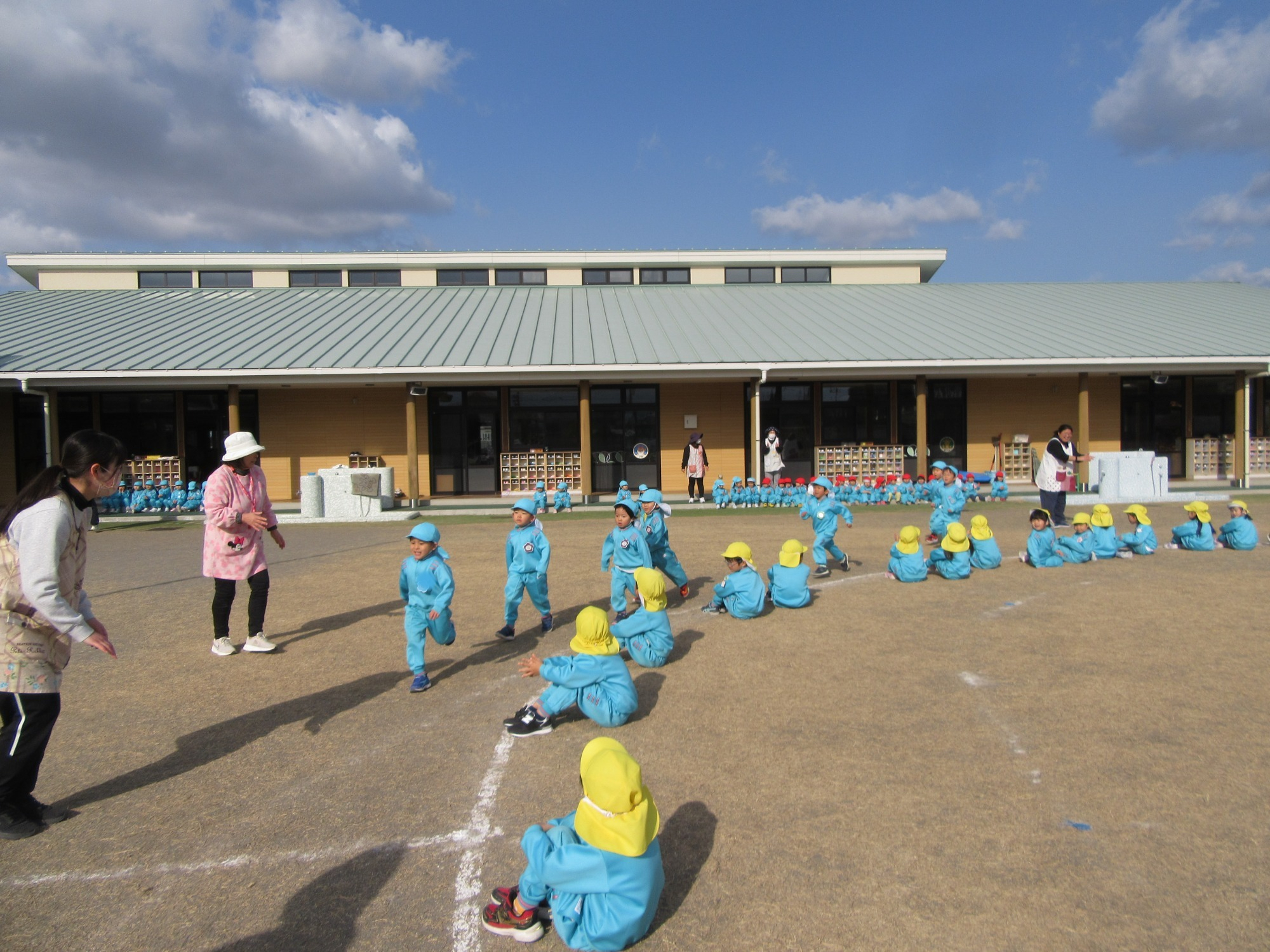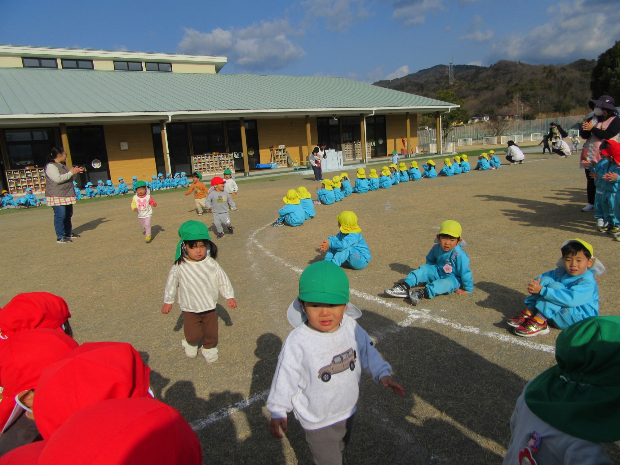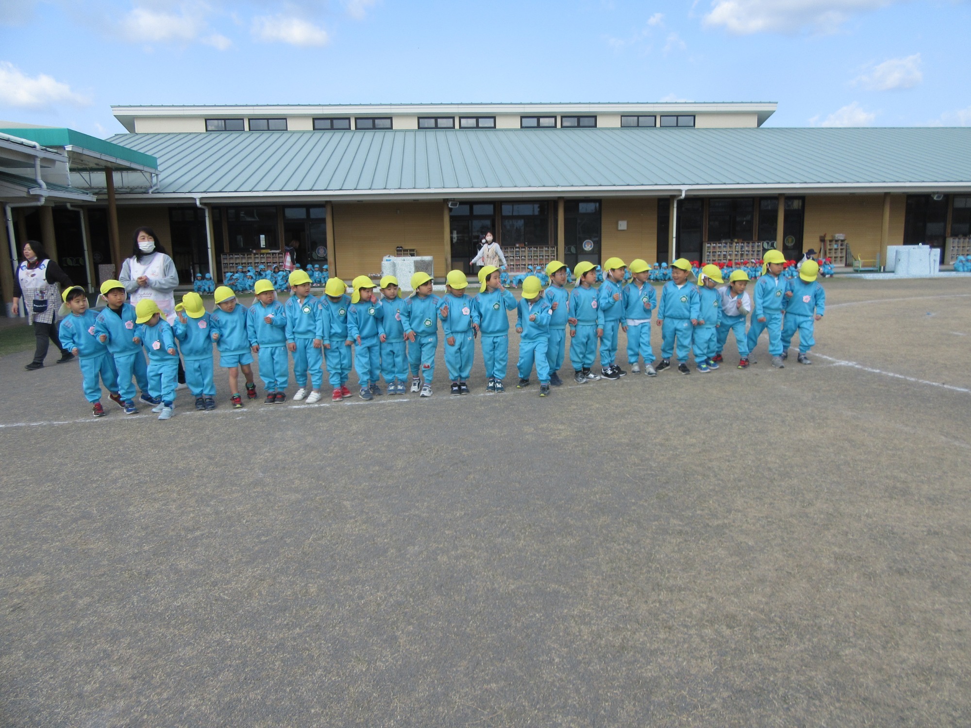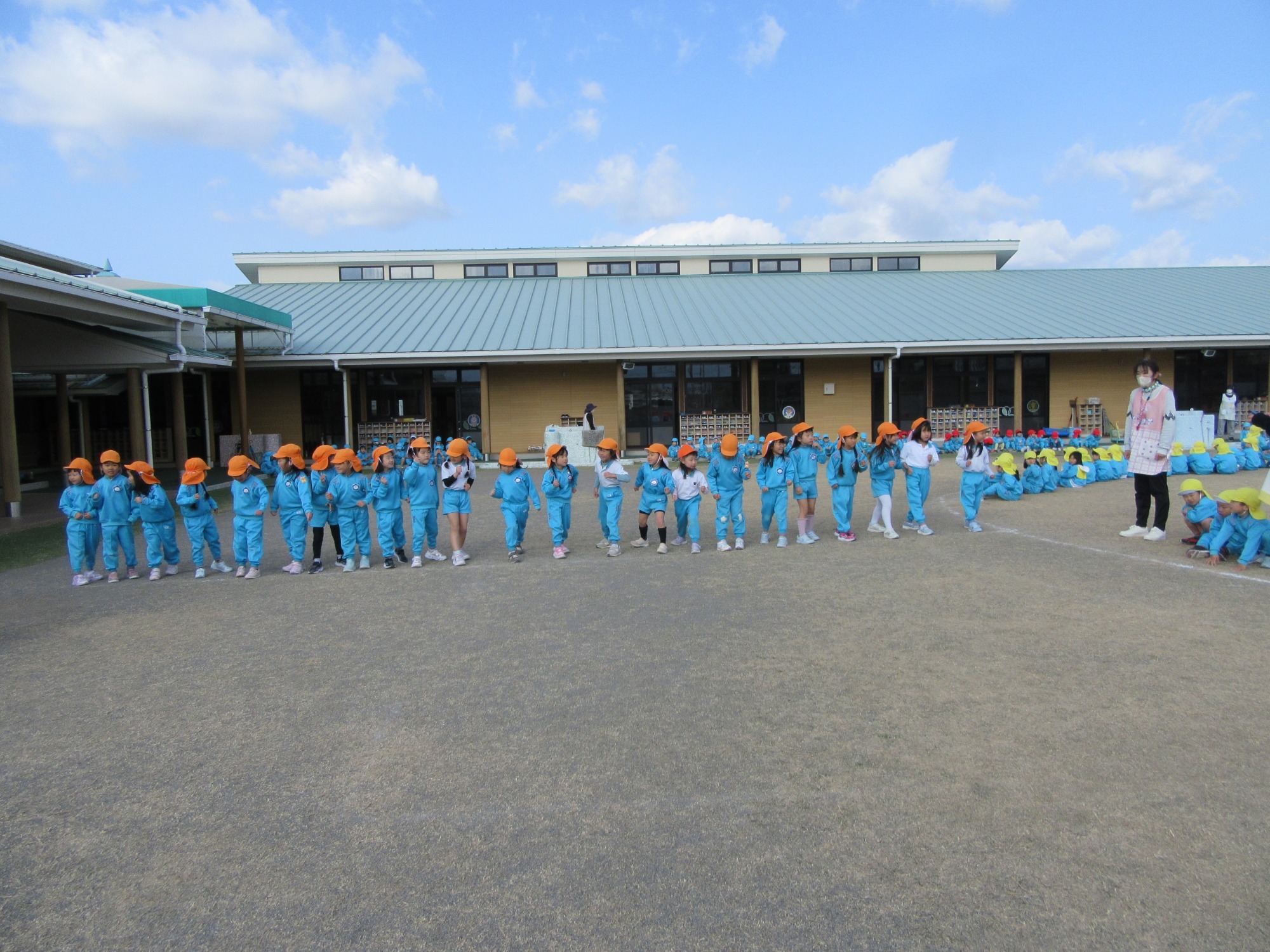 今日は避難訓練です。先生のお話をよく聞いて行動できたかな?「お・は・し・も」のお約束を守ってね!!