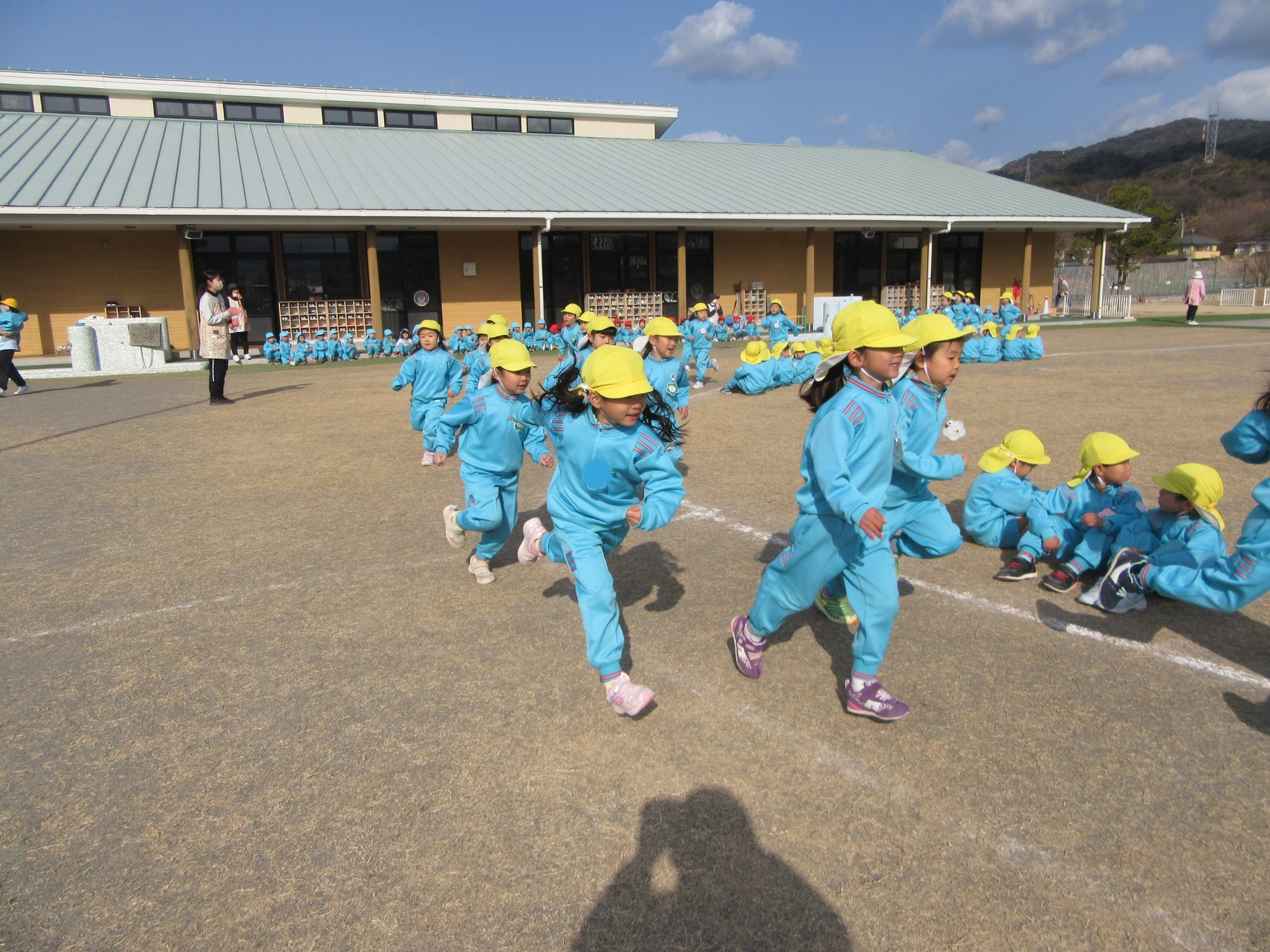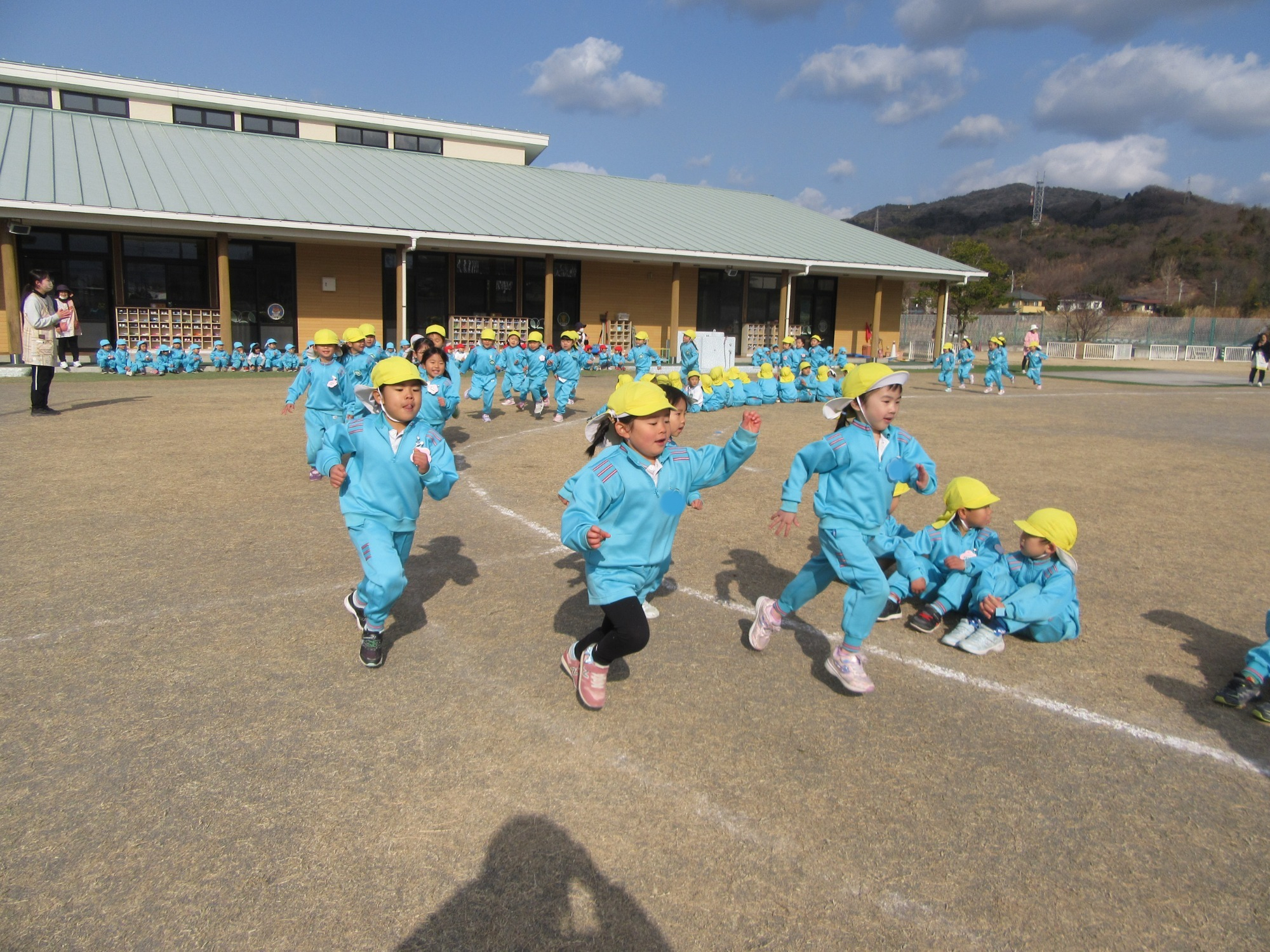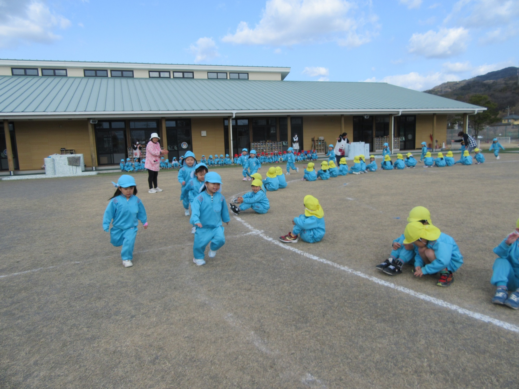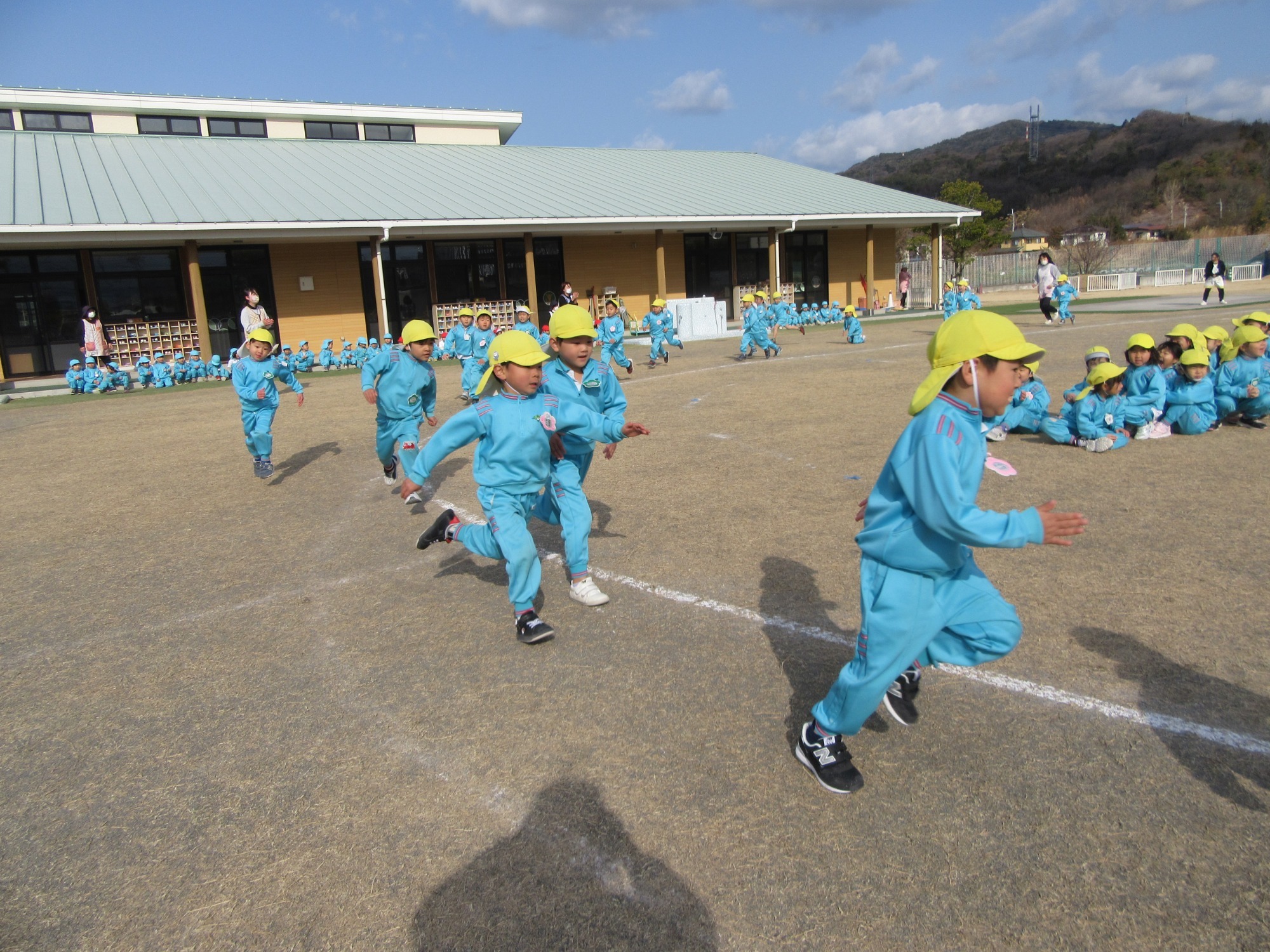今日は避難訓練です。先生のお話をよく聞いて行動できたかな?「お・は・し・も」のお約束を守ってね!!