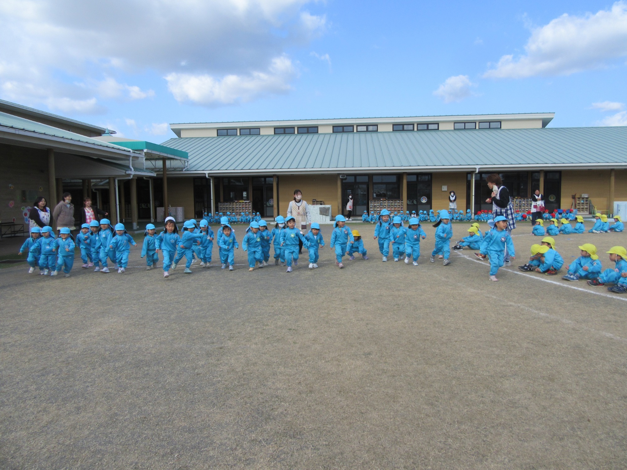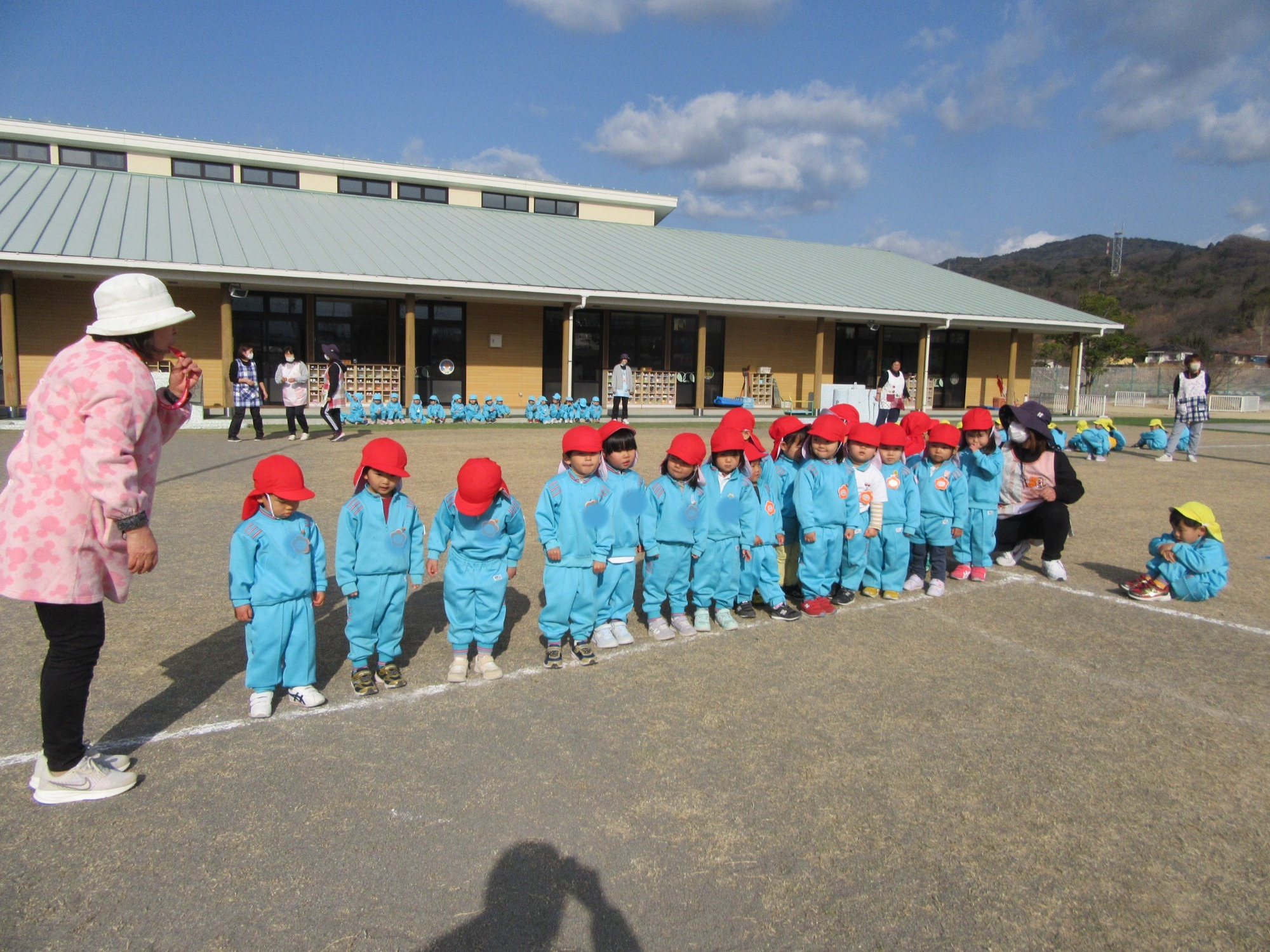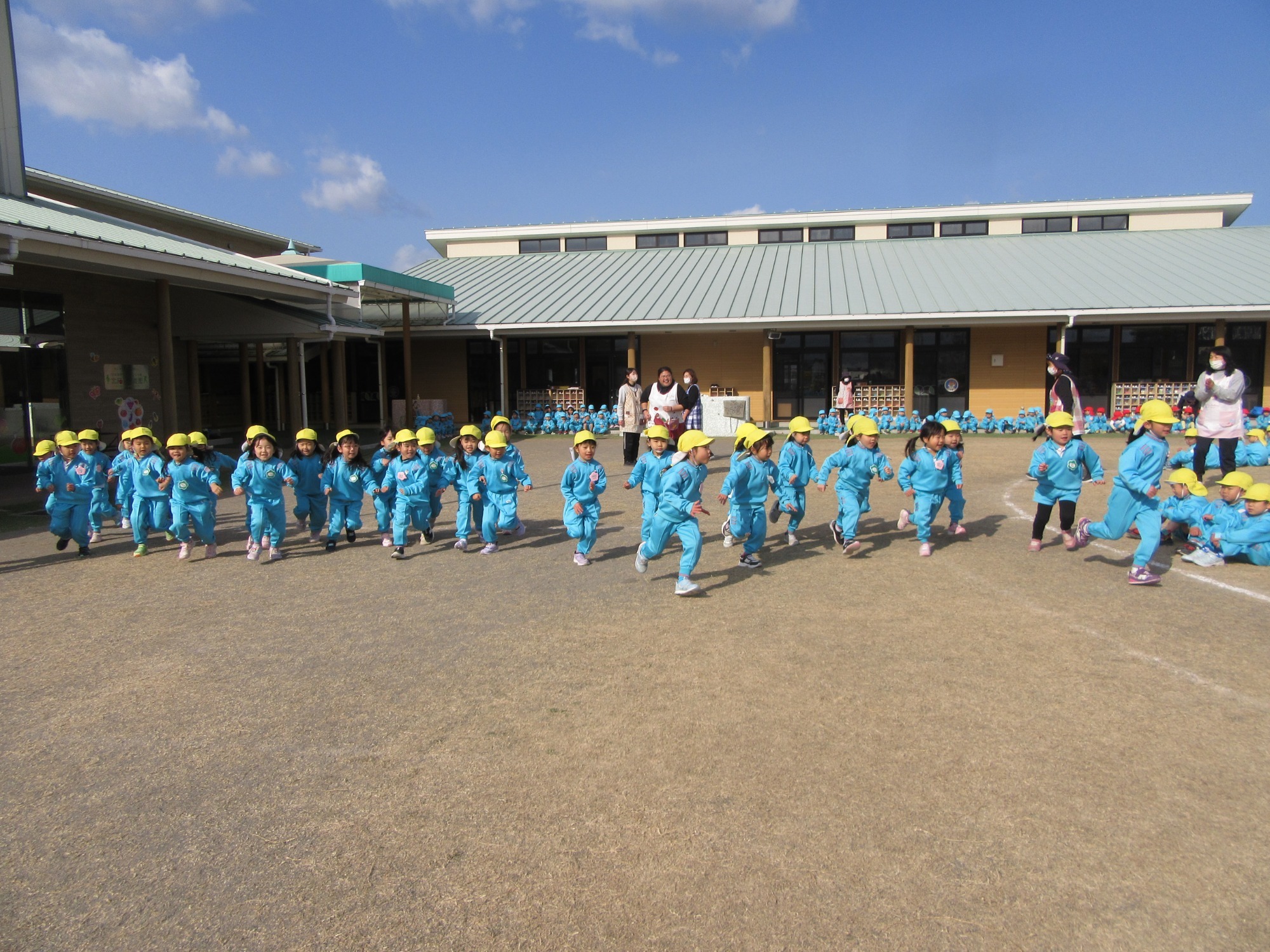 先日、避難訓練・引渡し訓練を行いました。保護者の皆様にもご協力いただき、ありがとうございました。各クラスでも避難訓練は行っていますが全体での訓練は初めてだったので、年少さんは少し驚いてしまった子もいたかもしれません。いつどこで起こるか分からないのが災害です。いざという時に大切な命を守る行動が出来るよう、繰返し訓練をしていきます。